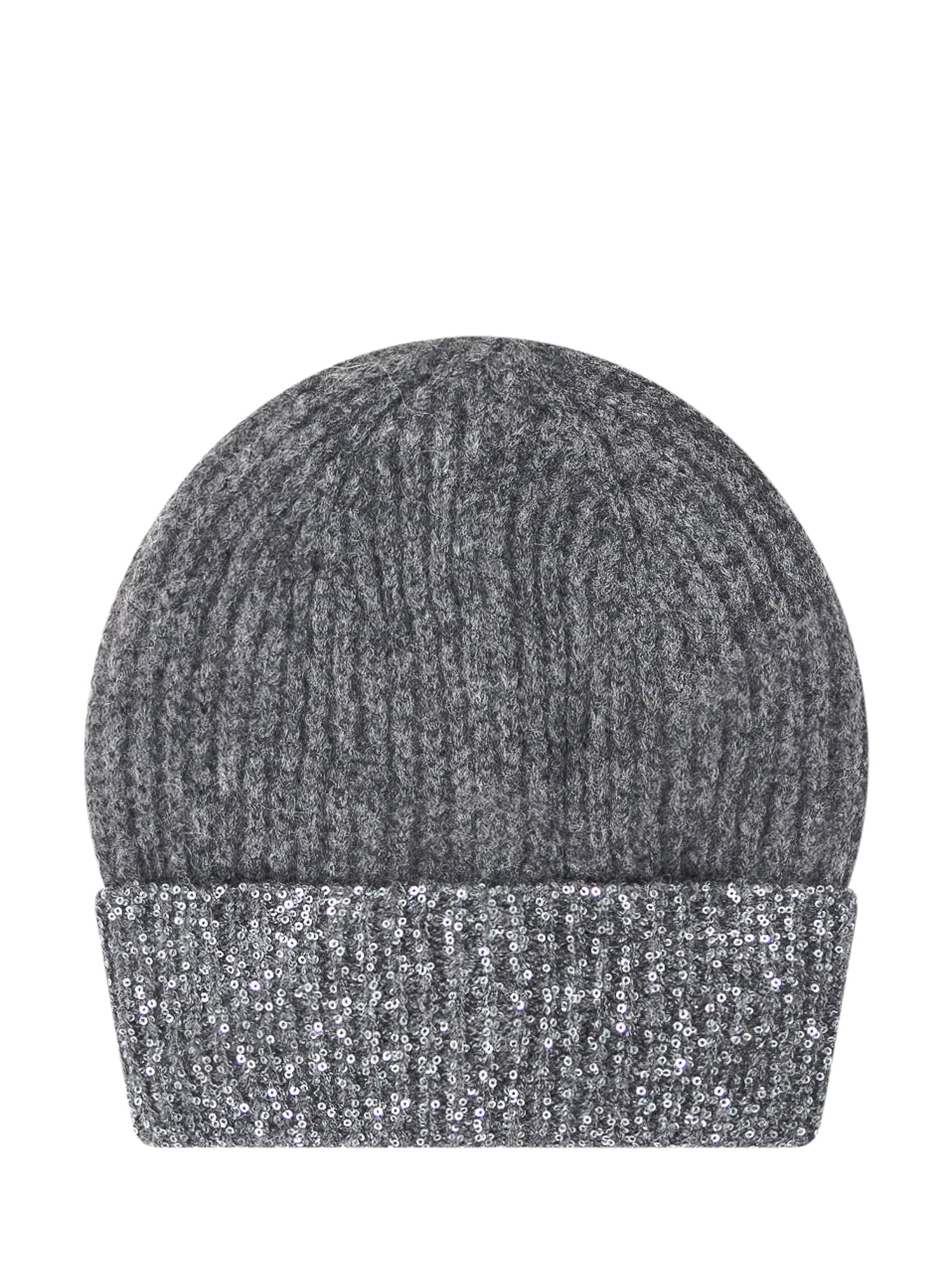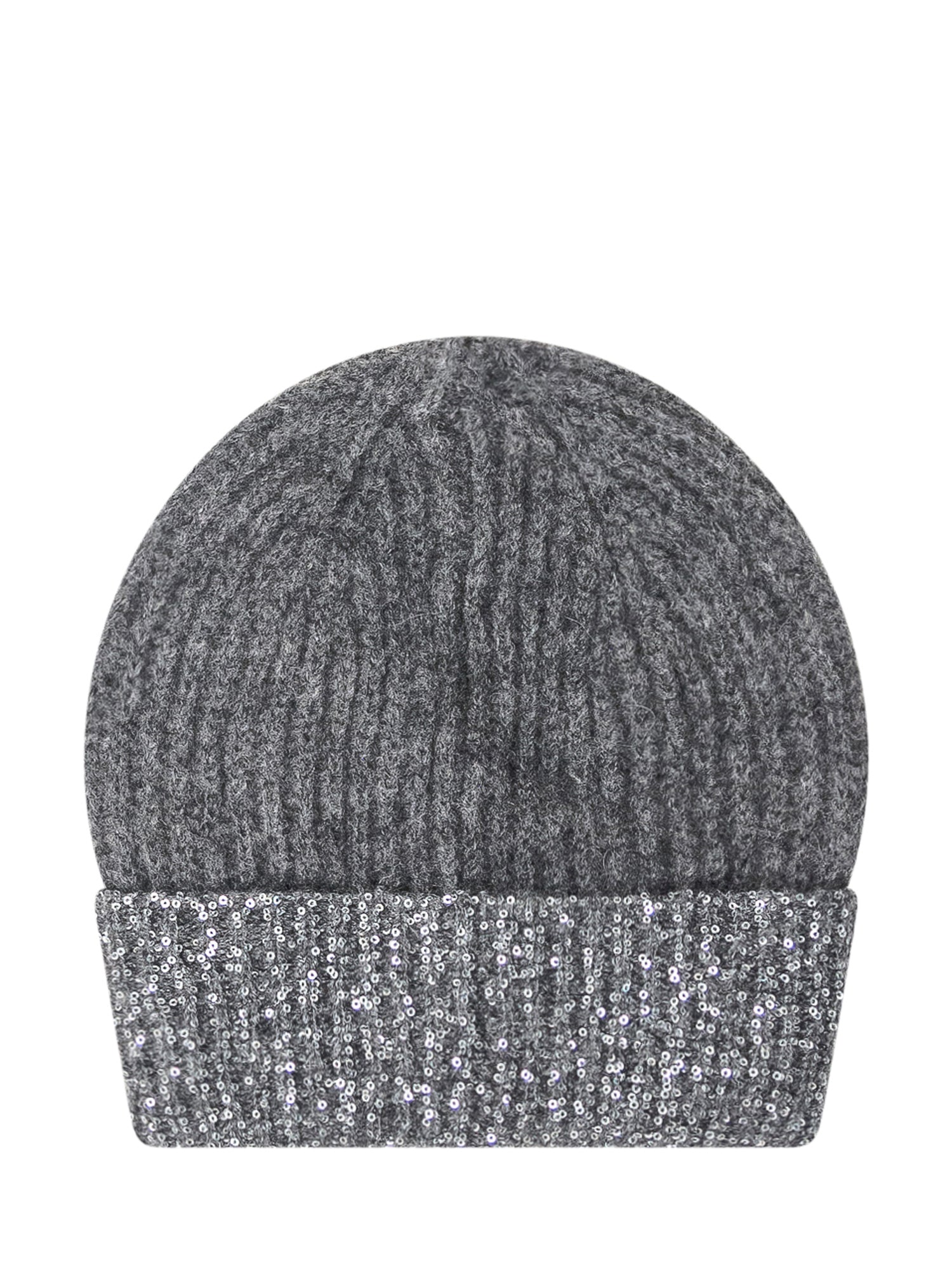 Cappello Exterior in lana grigia con risvolto decorato da paillettes argentate.
