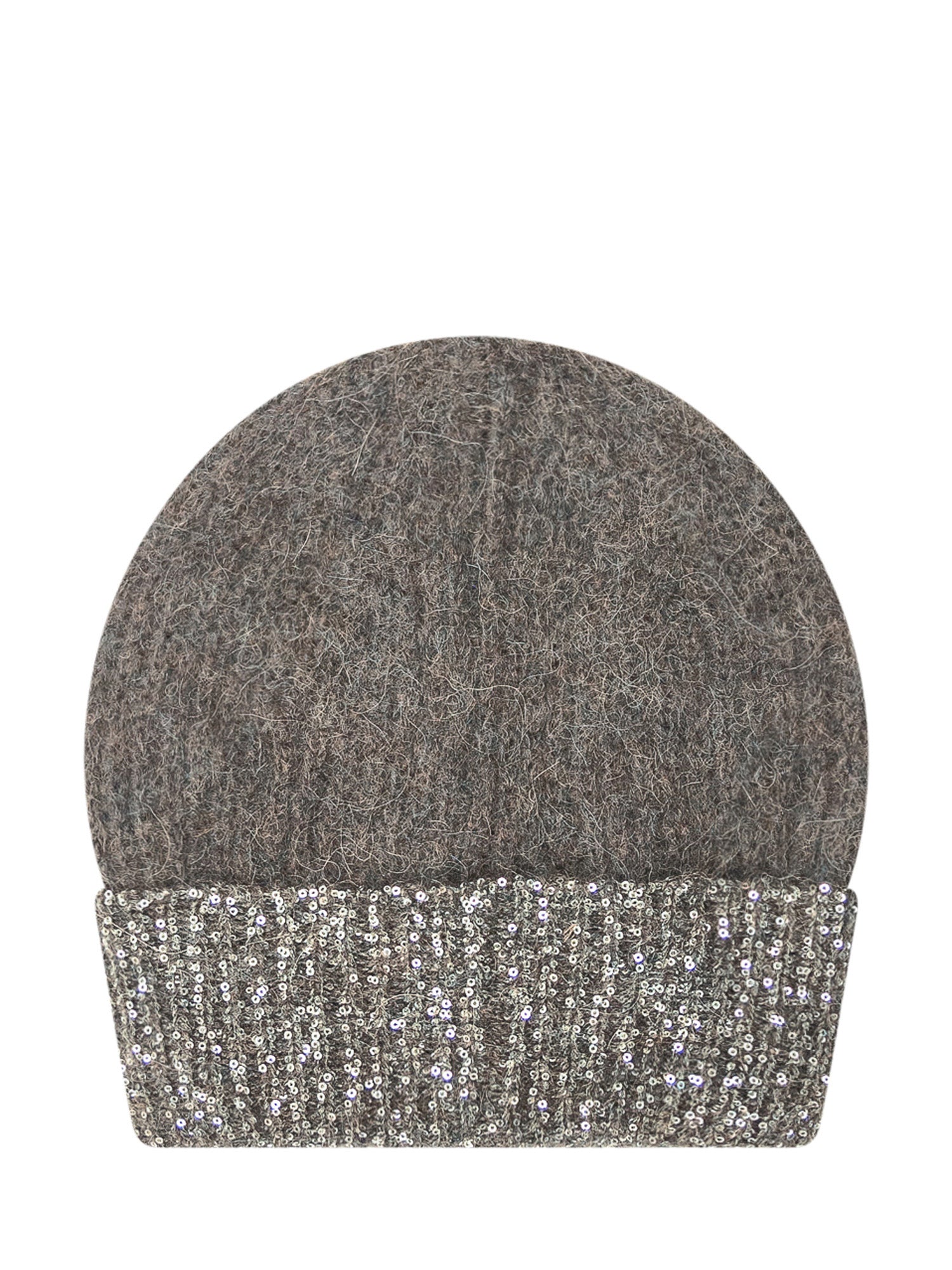 Cappello Exterior in lana marrone con risvolto illuminato da paillettes argentate.