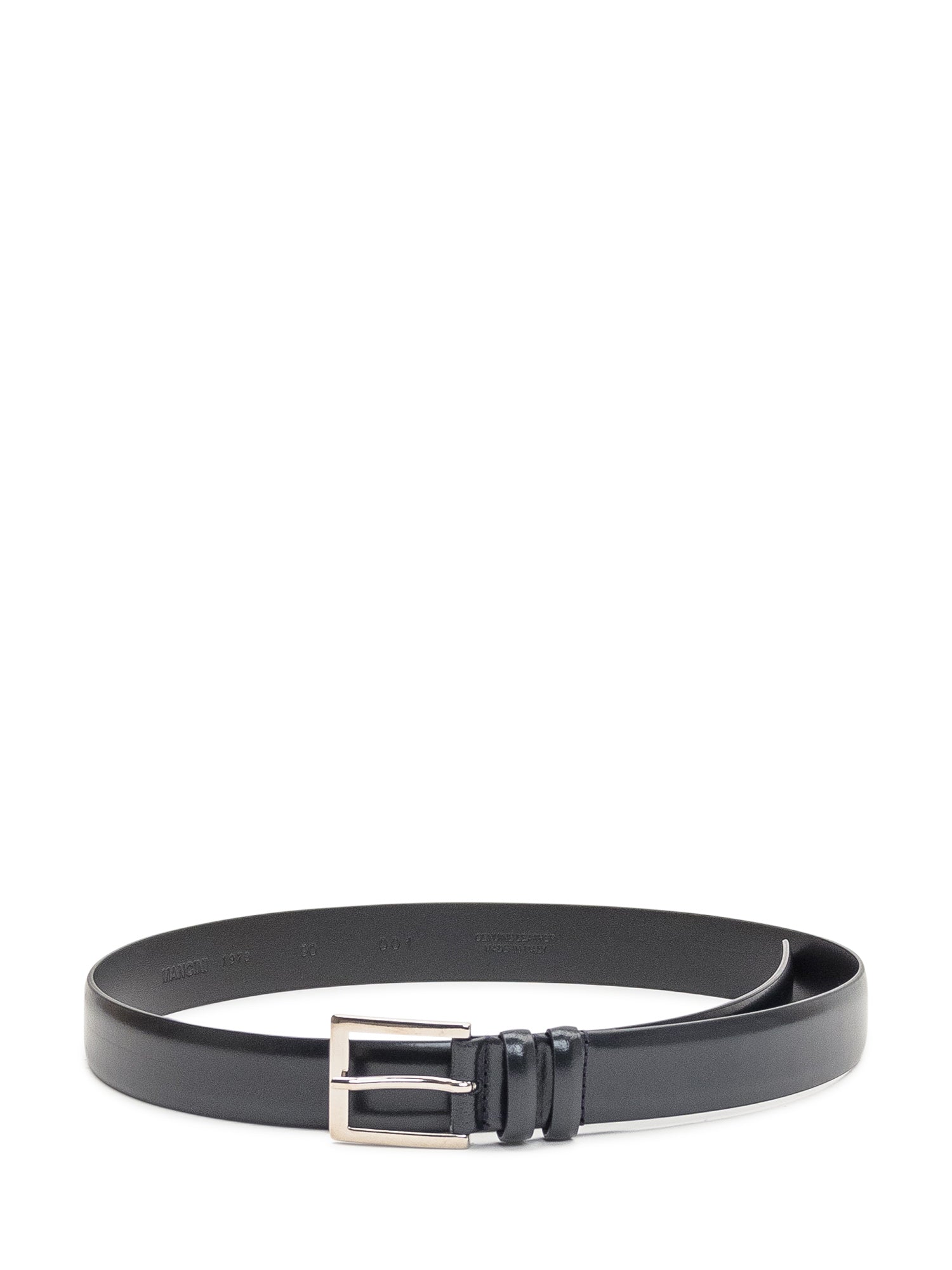 Cintura Mancini in pelle nera con fibbia squadrata argento.