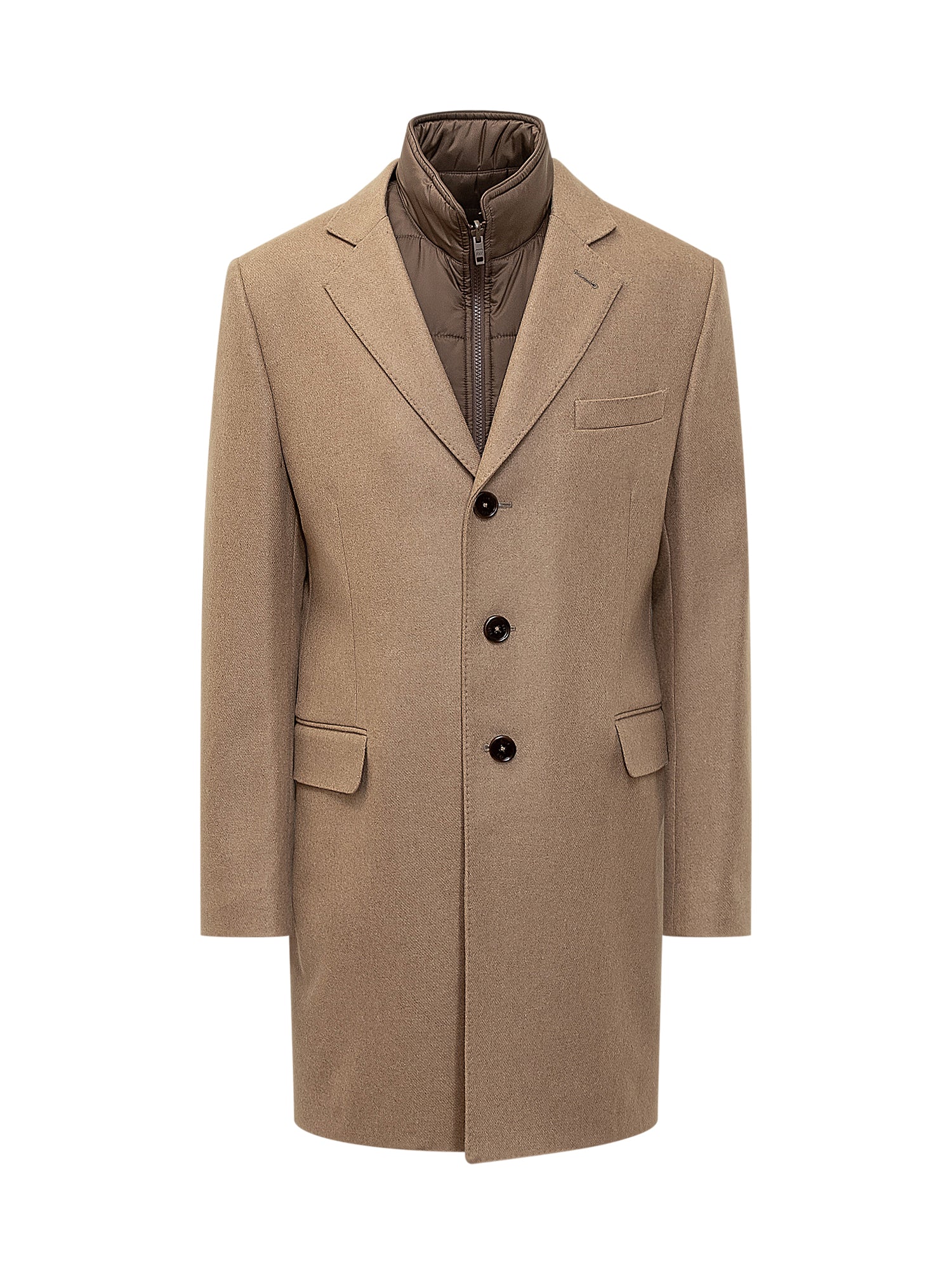 Cappotto marrone in lana con gilet. Tasca sul petto. Tasche con patta. Chiusura con bottoni e zip.