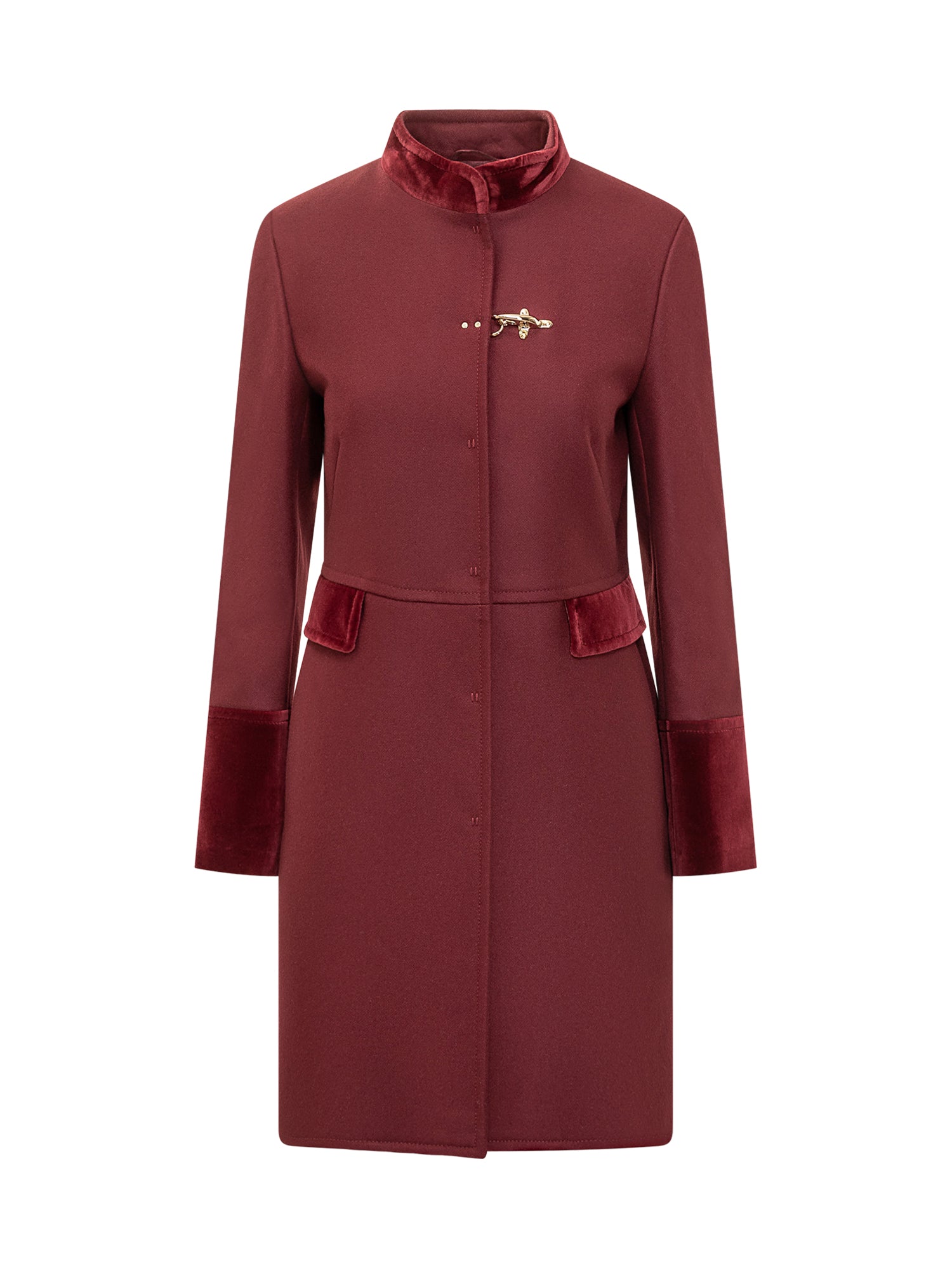 Cappotto monopetto Fay in lana bordeaux con dettagli in velluto a contrasto su colletto, polsi e tasche.