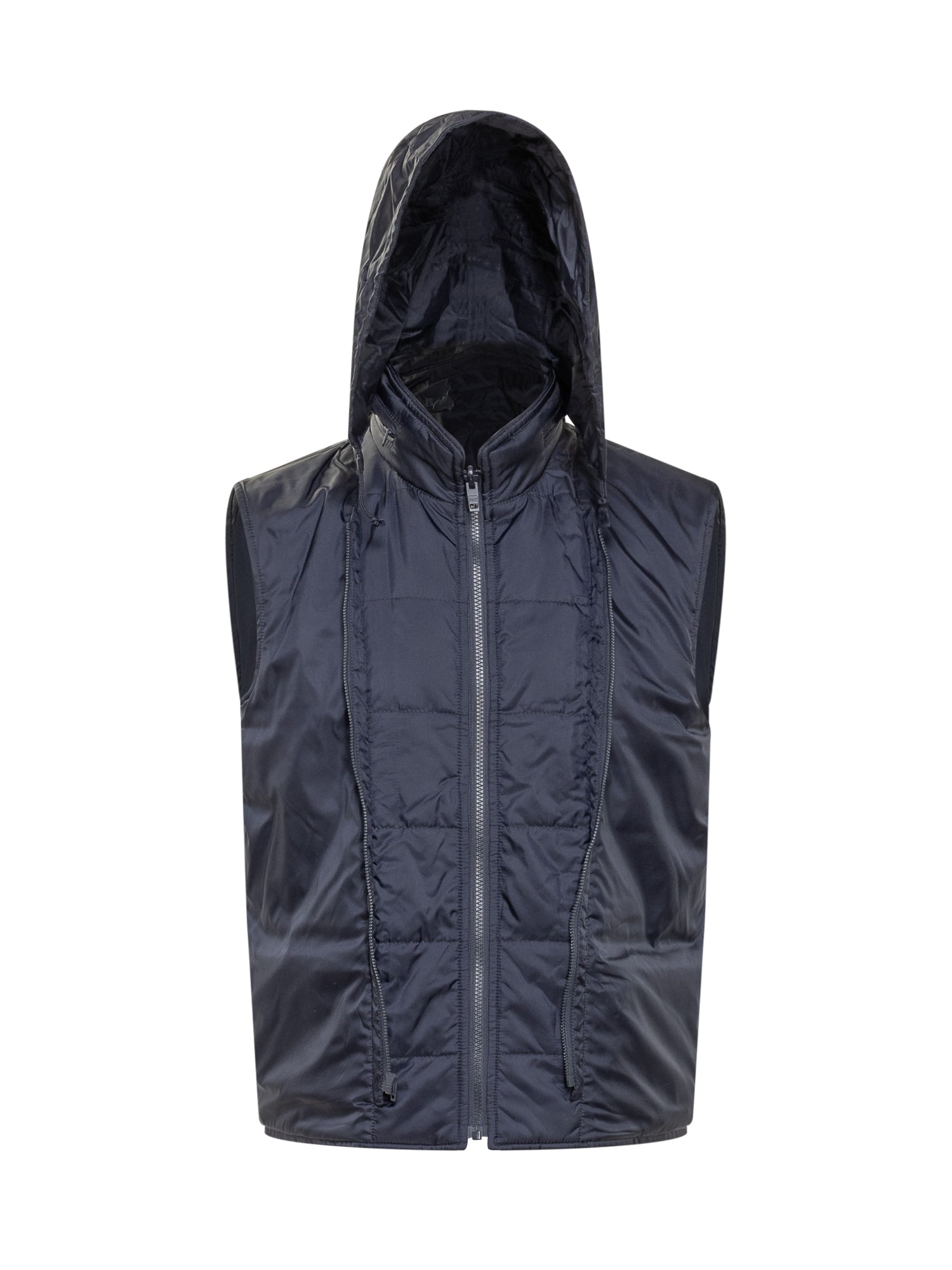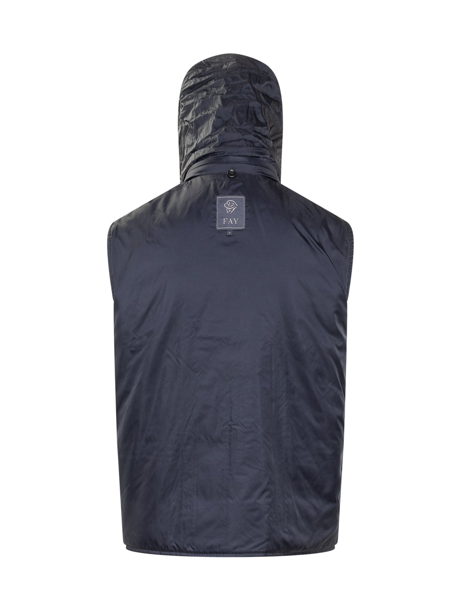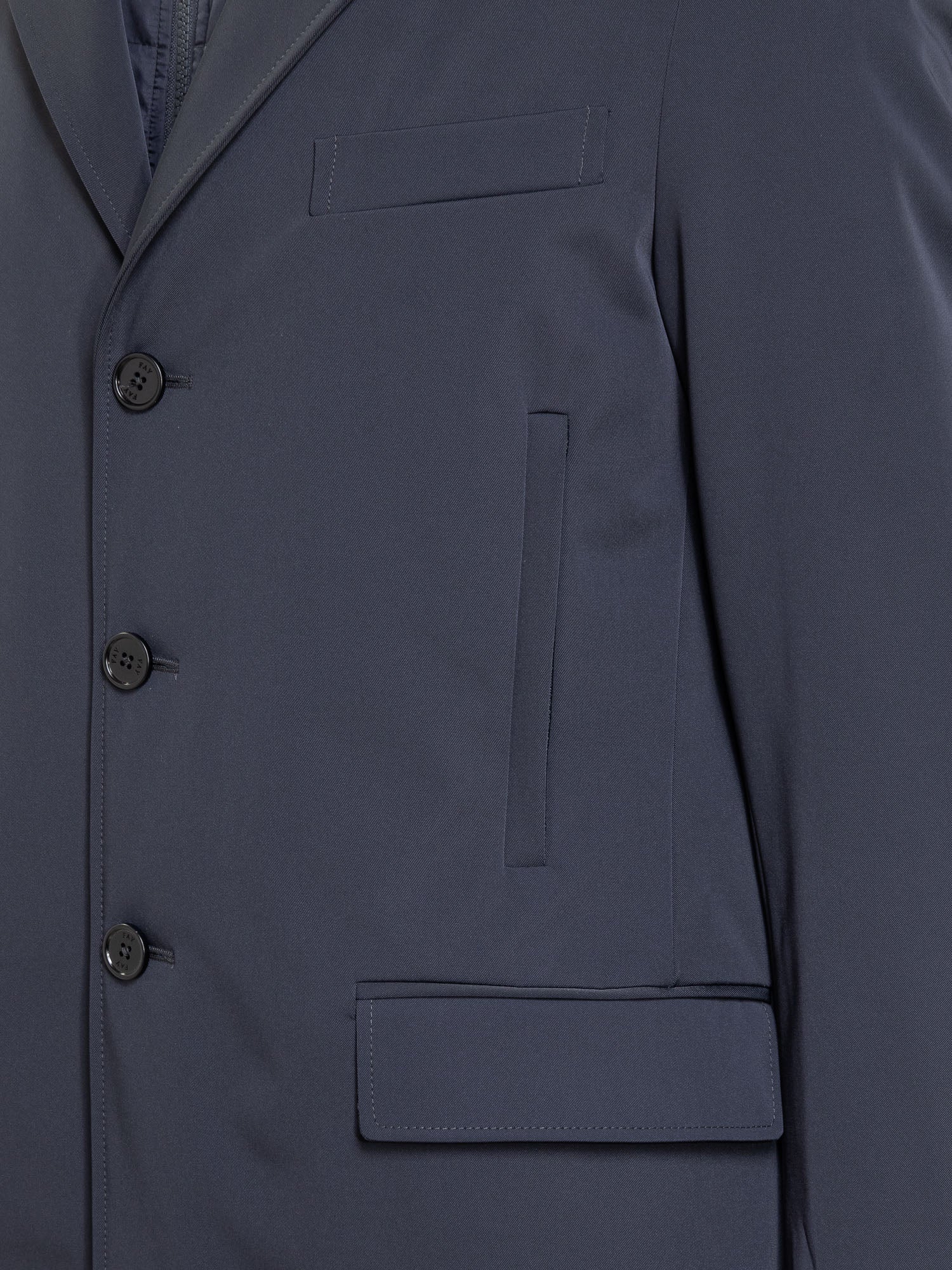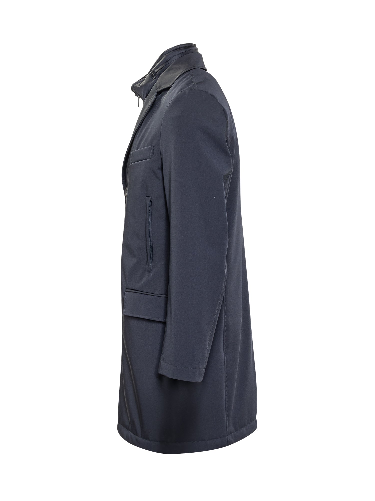 Cappotto imbottito blu a maniche lunghe. Doppia chiusura frontale con zip e bottoni. Collo alto. Tasche sul davanti. Parte superiore removibile.