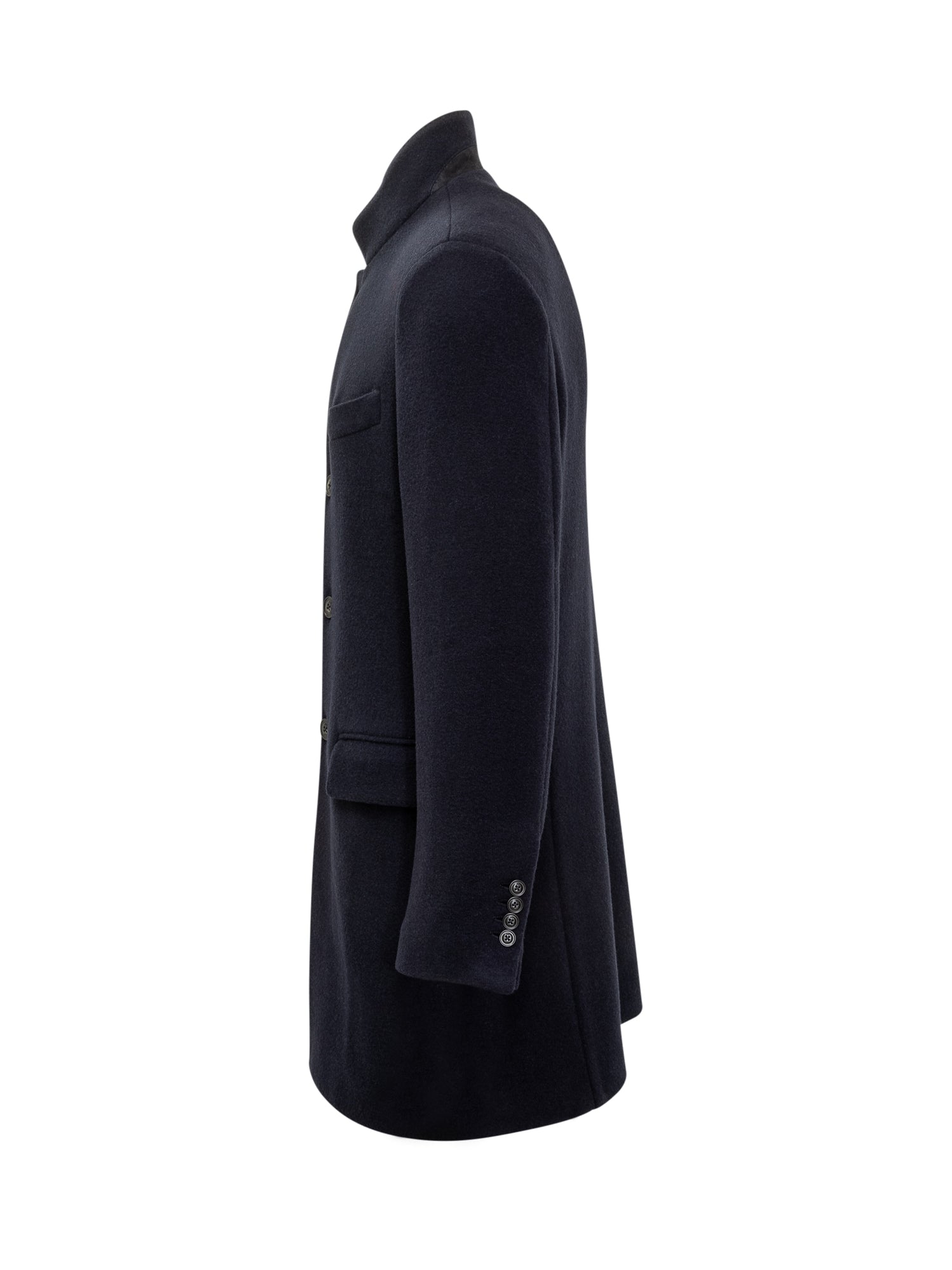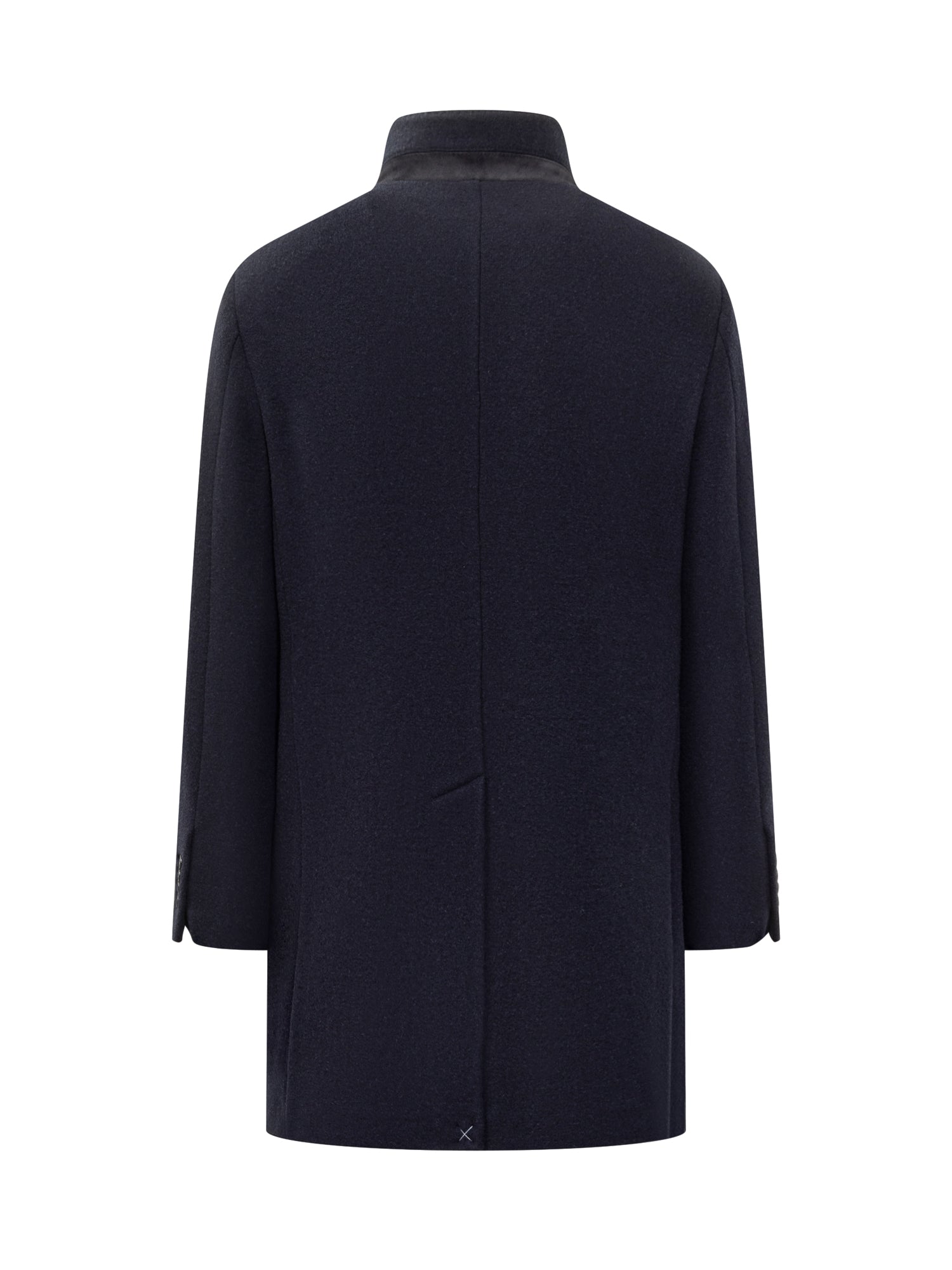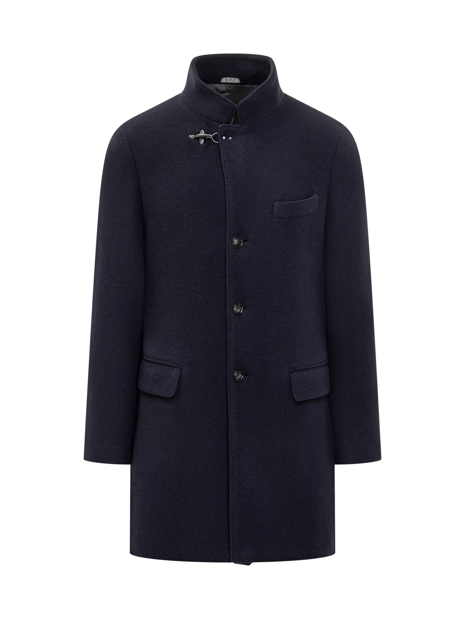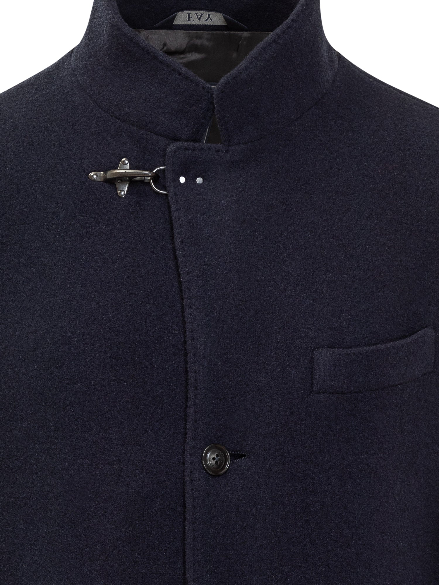 Cappotto Fay blu in lana con collo alla coreana, chiusura a bottoni e dettaglio gancio.