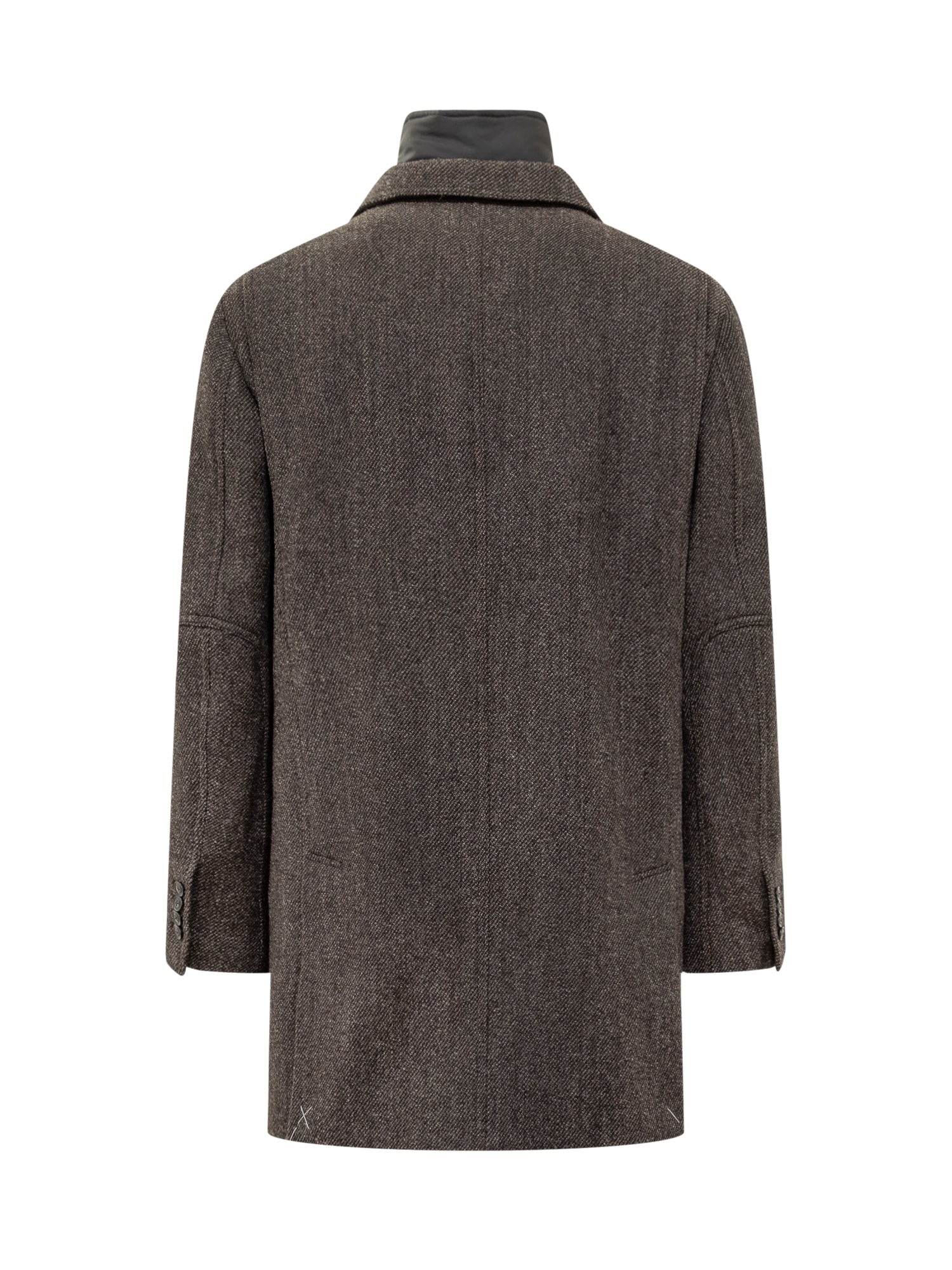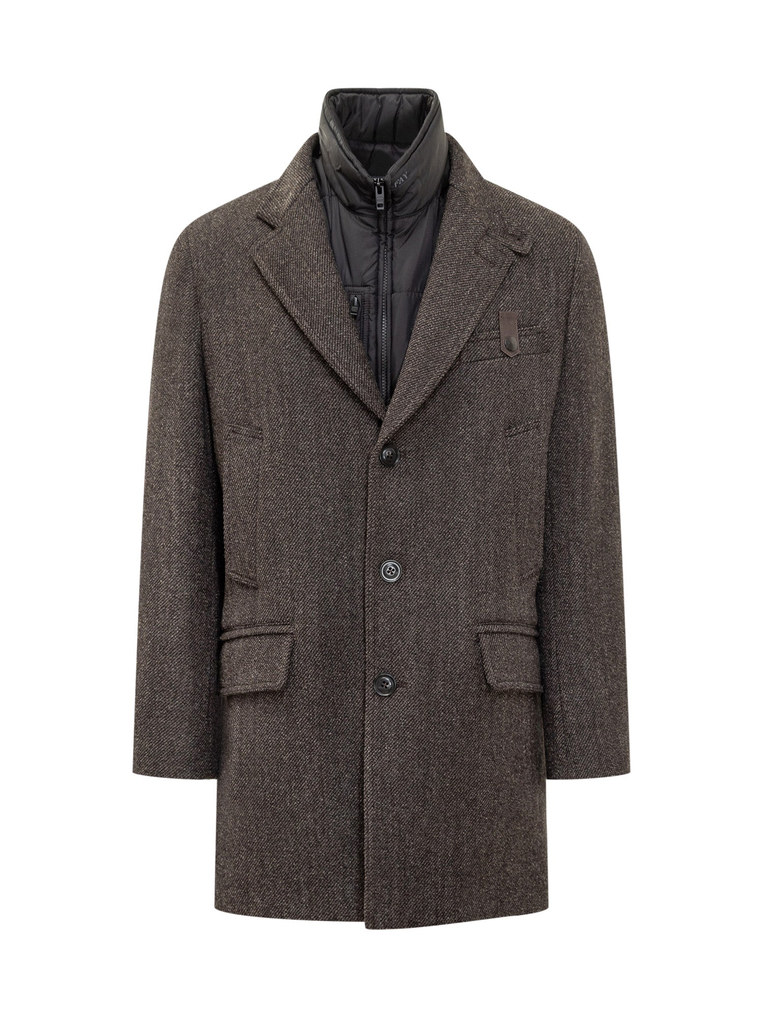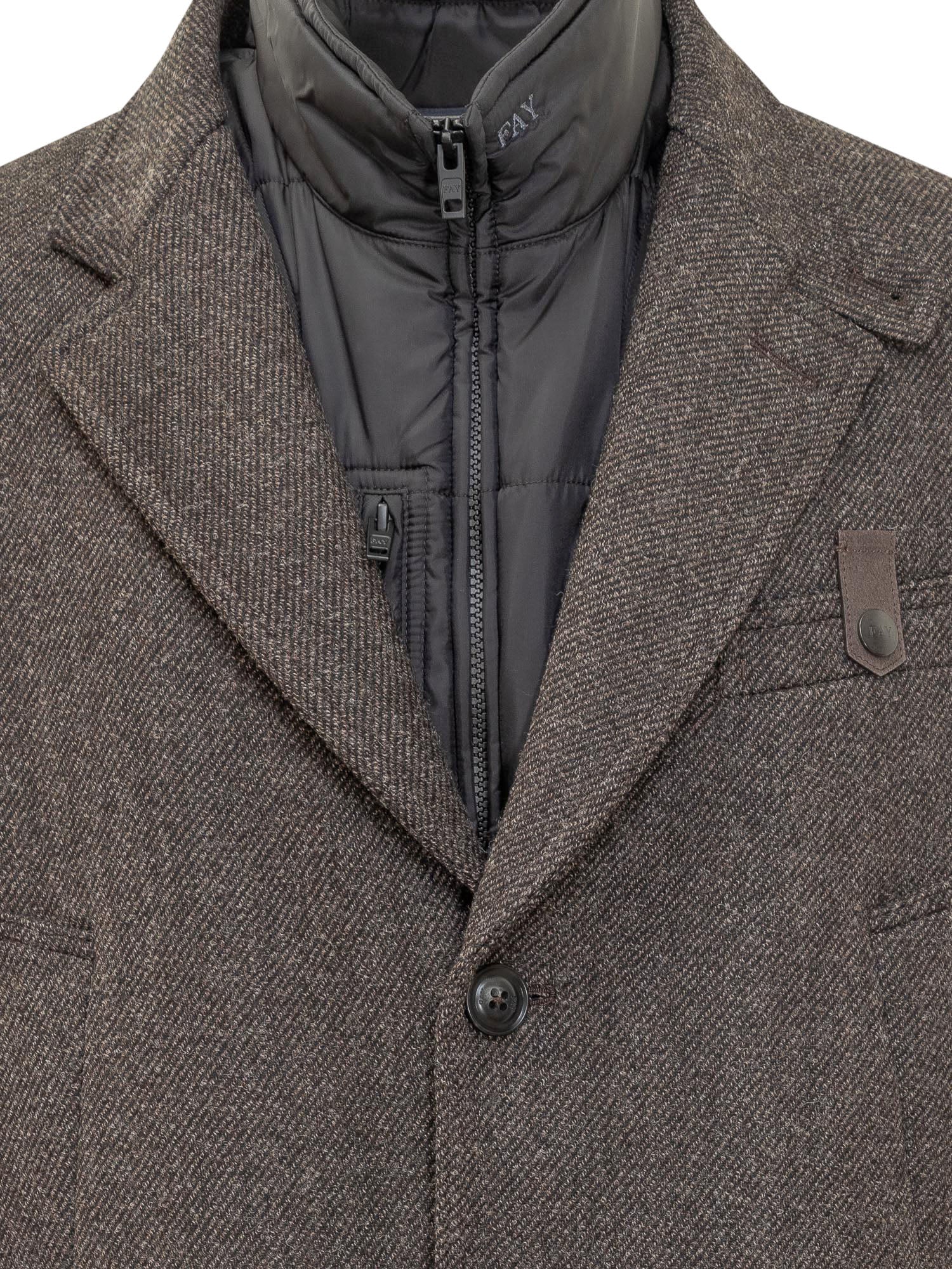 Cappotto Fay marrone in lana con revers classici, chiusura a bottoni e pannello interno trapuntato.