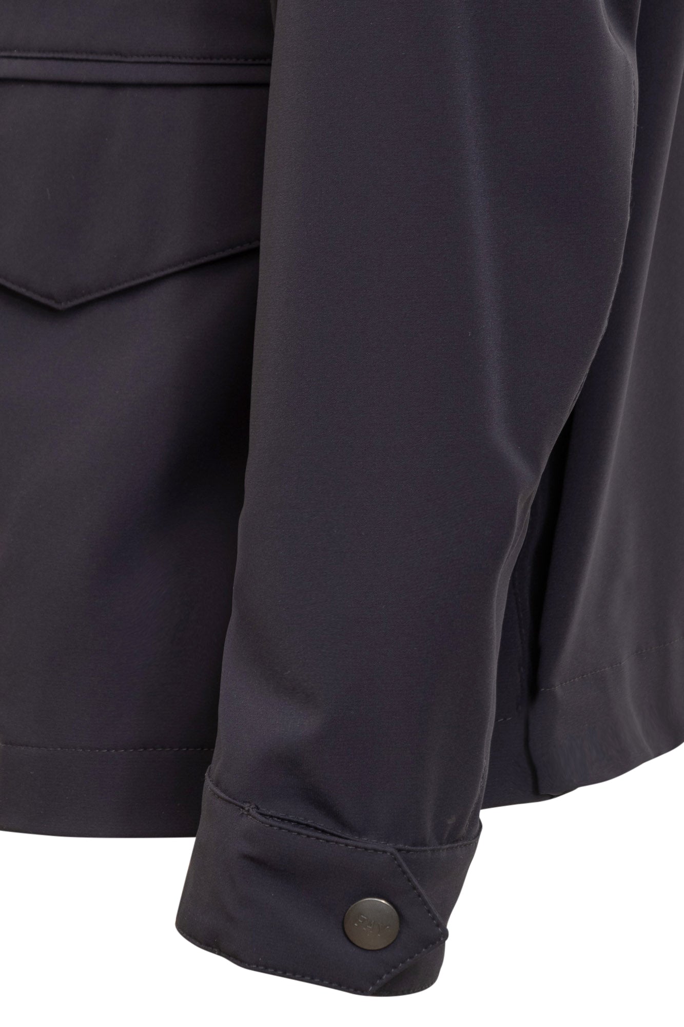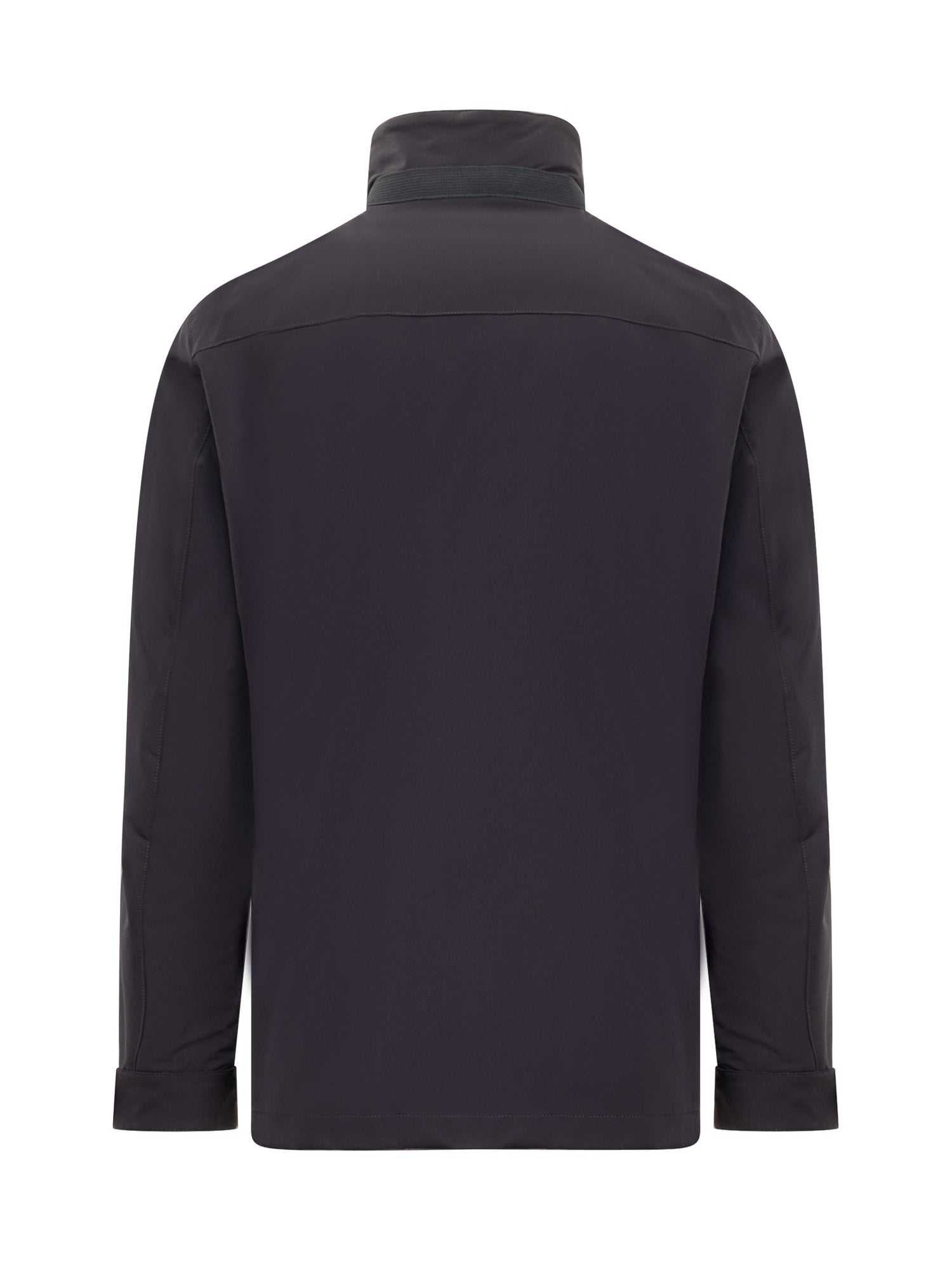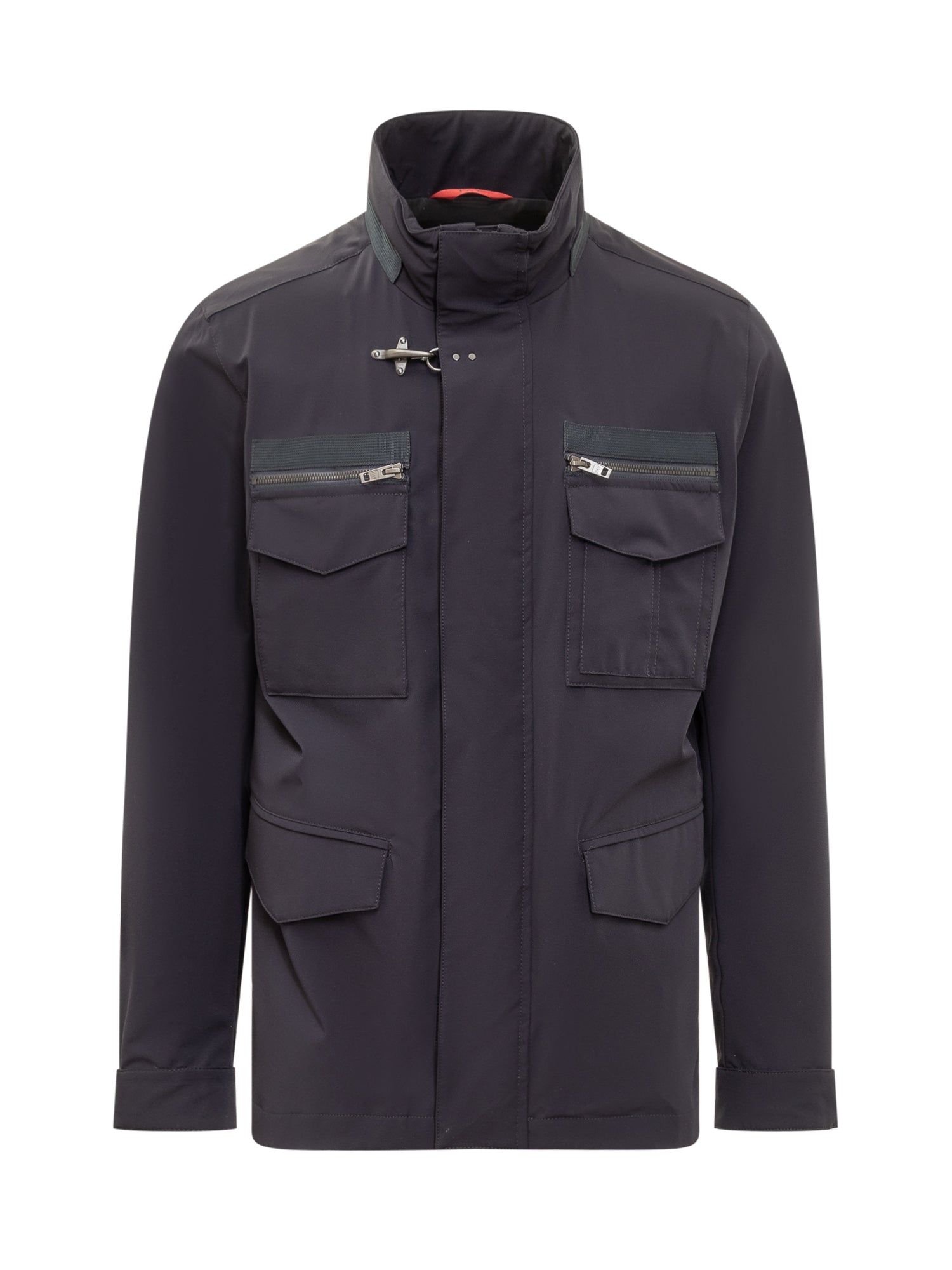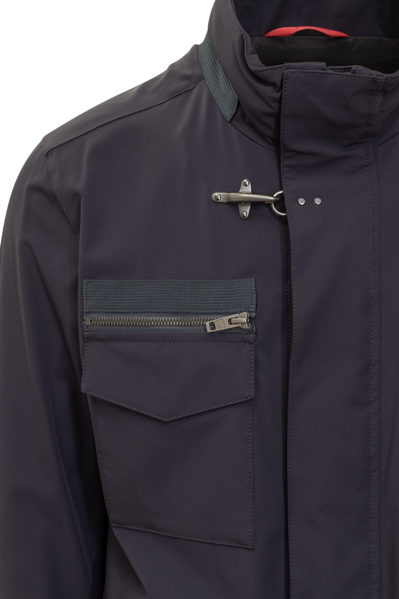 Giubbino a maniche lunghe. Collo alto. Chiusura con bottoni a pressione e zip. Polsini con bottoni. Due tasche con zip sul petto.Quattro tasche con patta sul davanti. Fibbia Gancini sul davanti.