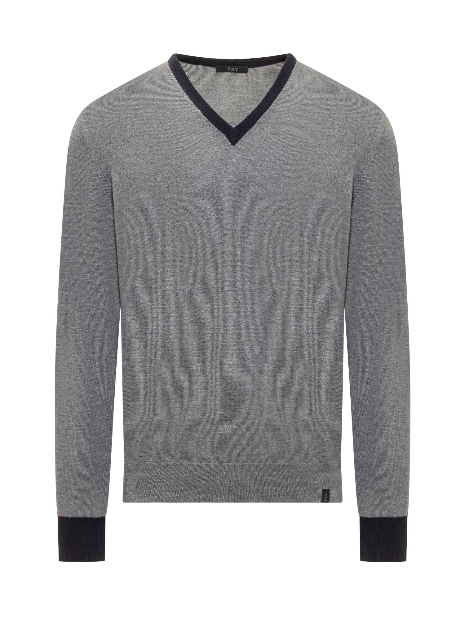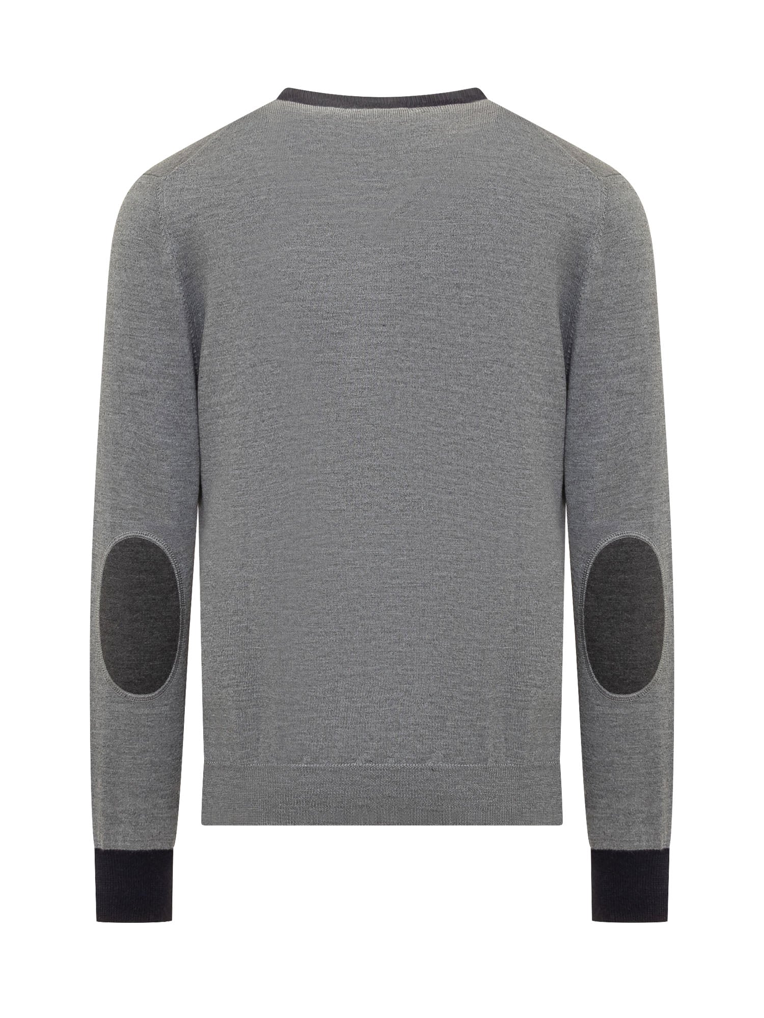 Maglia grigia a maniche lunghe. Scollo a V. Logo sul fondo. Toppe ai gomiti.