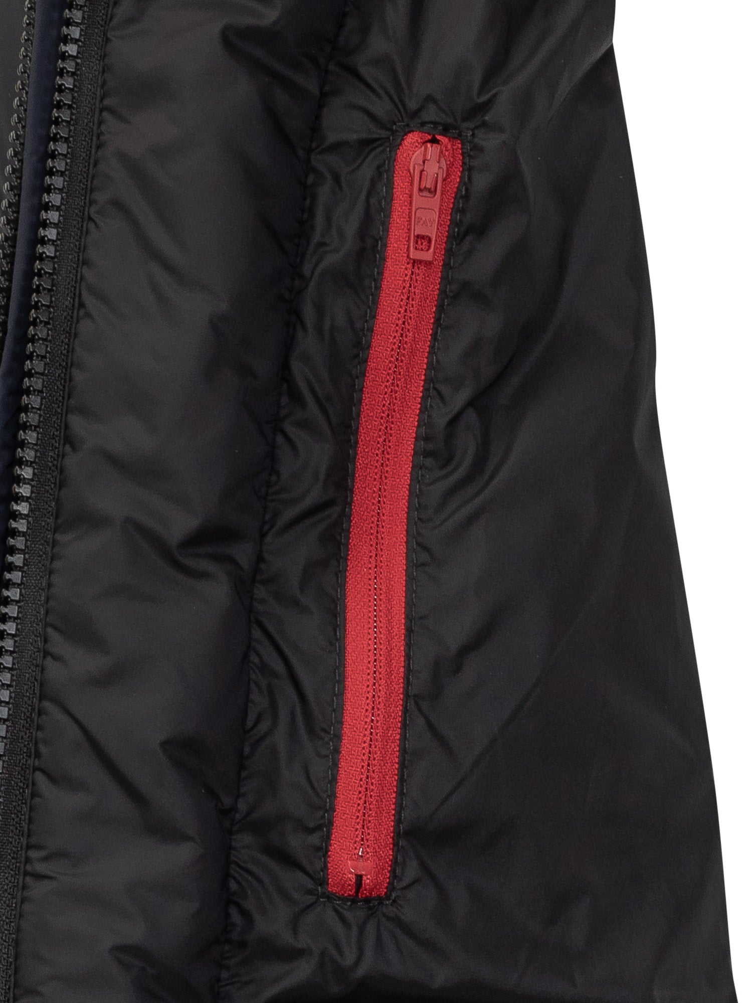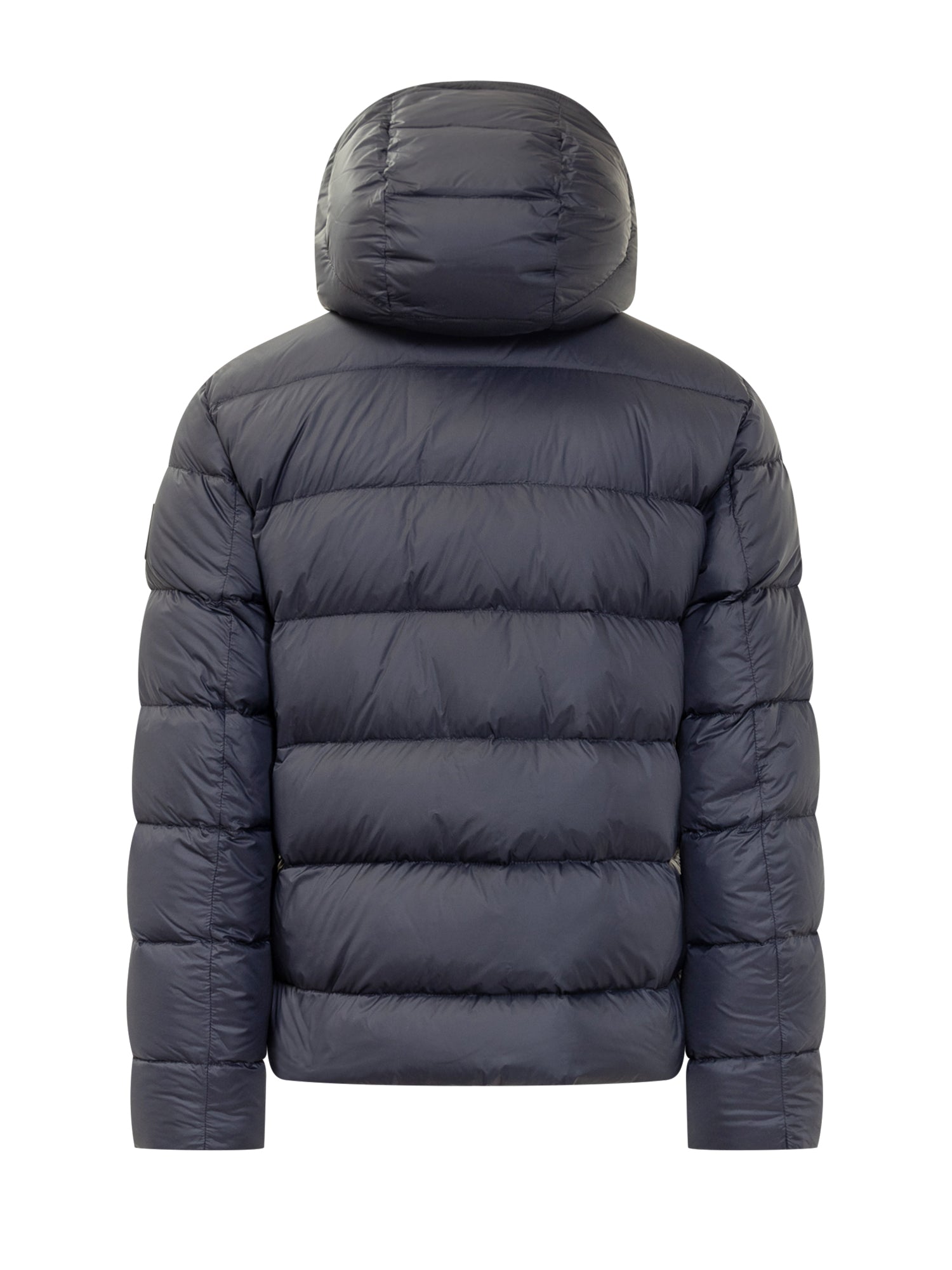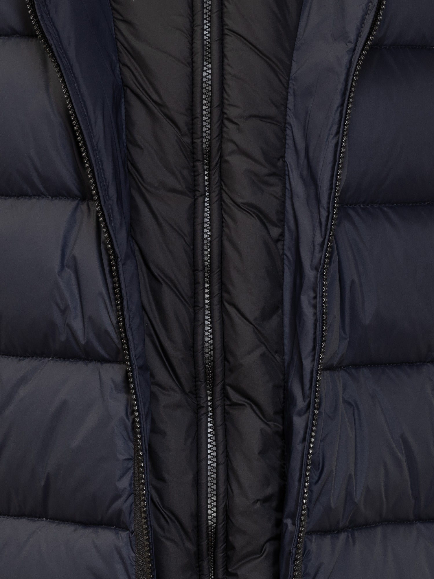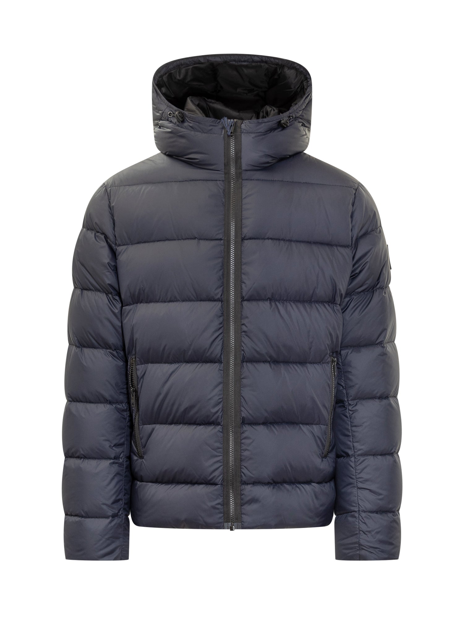 Piumino Fay modello DB Front in tessuto tecnico blu navy, con imbottitura in piuma. Caratterizzato da una chiusura frontale con zip impermeabile, cappuccio fisso regolabile e tasche laterali con zip.
