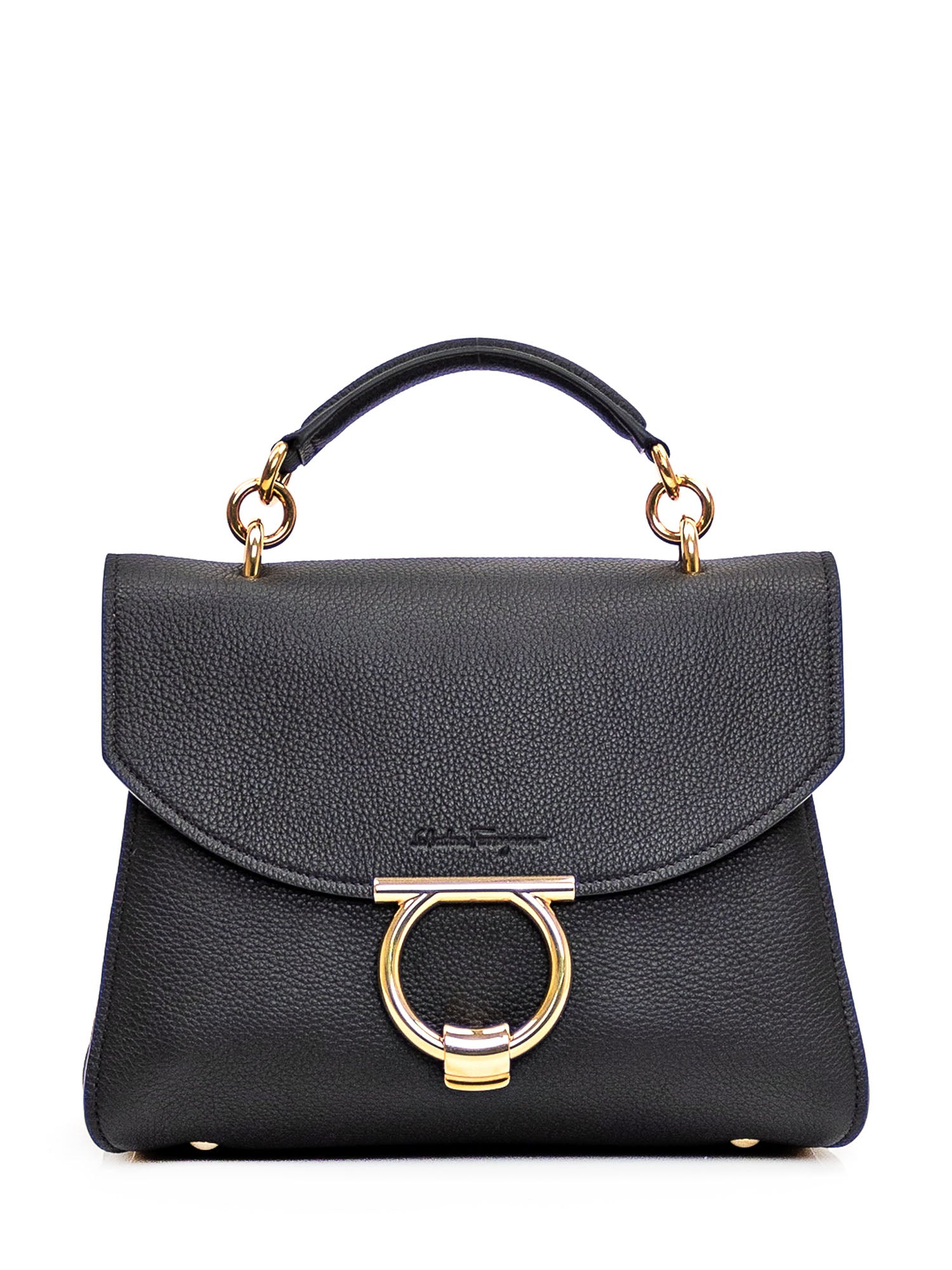 Borsa a mano nera in pelle martellata. Un manico. Tracolla regolabile e rimovibile. Due scomparti interni. Chiusura con patta con Gancino in metallo dorato. Logo sul davanti.