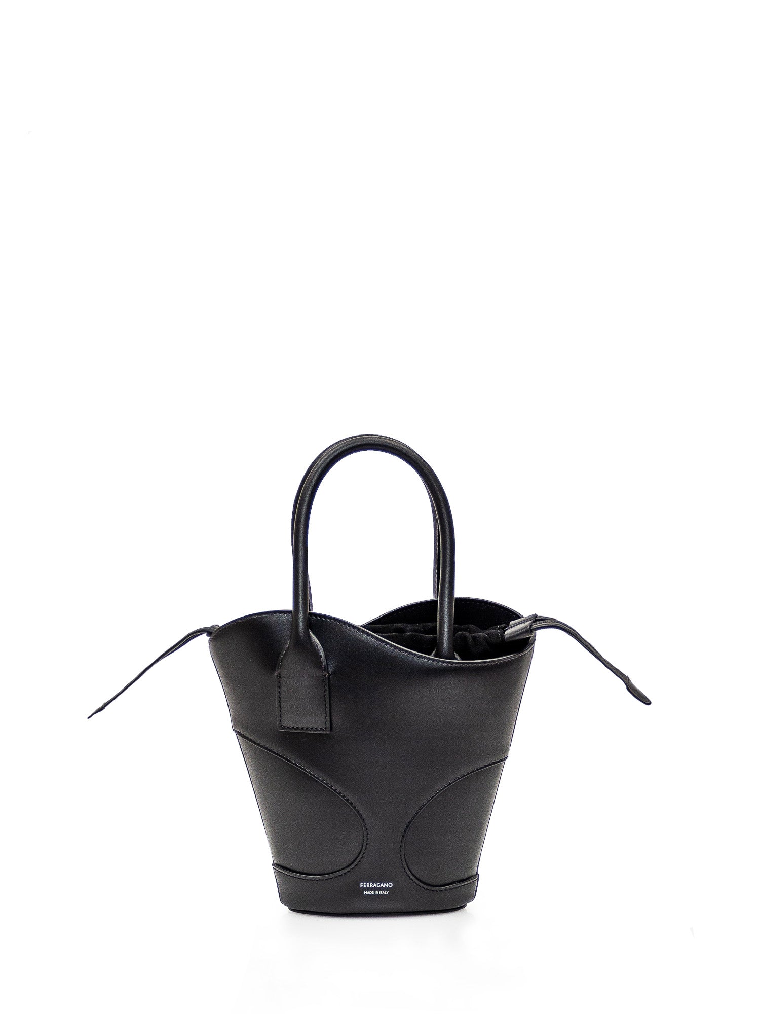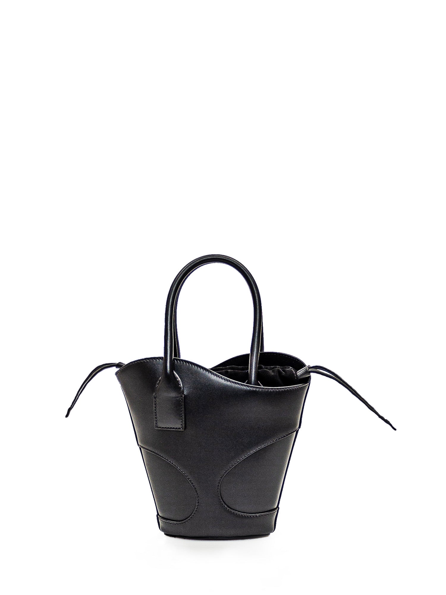 Borsa a secchiello nera in pelle con bordo con sagomature a onda. Due manici. Tracolla regolabile e rimovibile. Coulisse interna. Logo sul davanti.