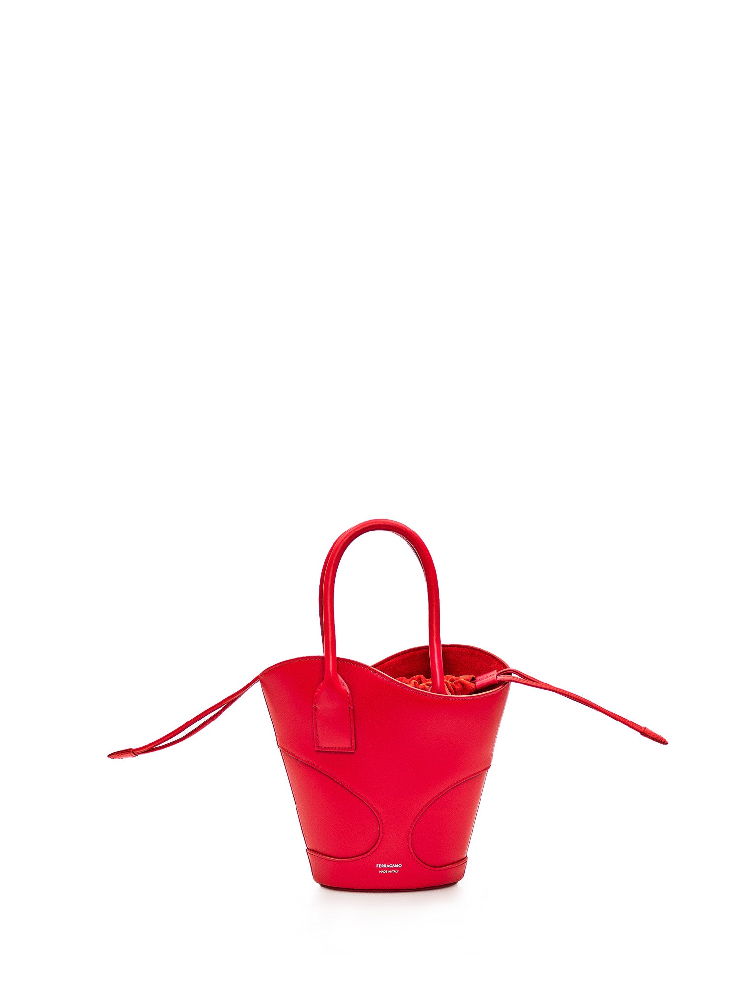 Borsa a secchiello rossa in pelle con bordo con sagomature a onda. Due manici. Tracolla regolabile e rimovibile. Coulisse interna. Logo sul davanti.