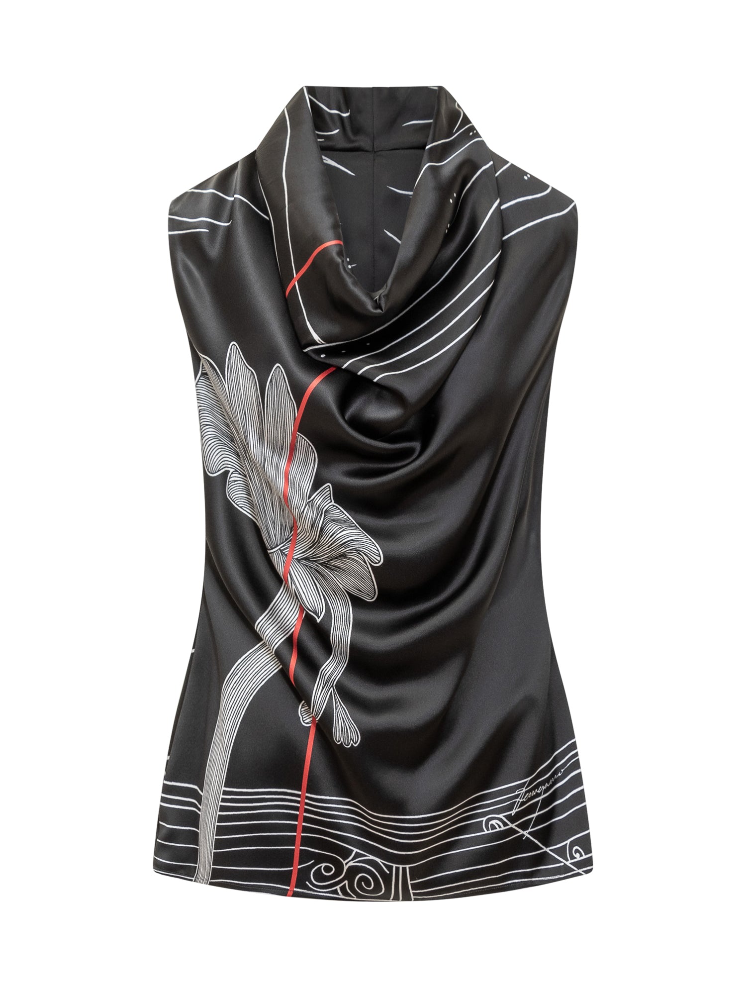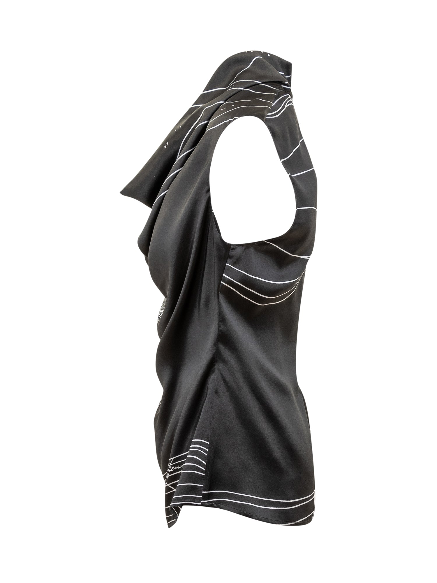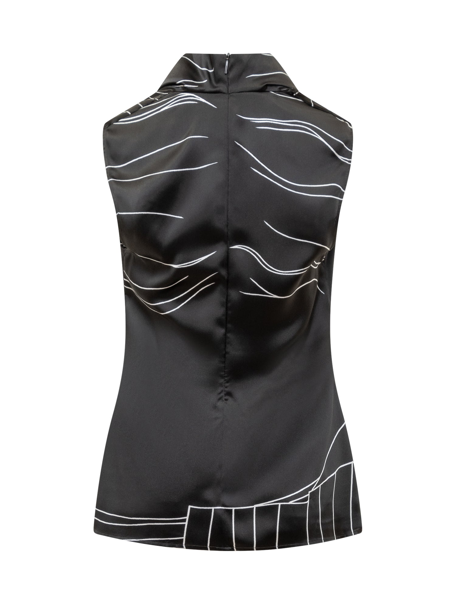Camicia smanicata in seta. Scollo drappeggiato. Chiusura con zip sul retro. Motivo astratto black and white. Logo in jacquard sul davanti e sul retro.