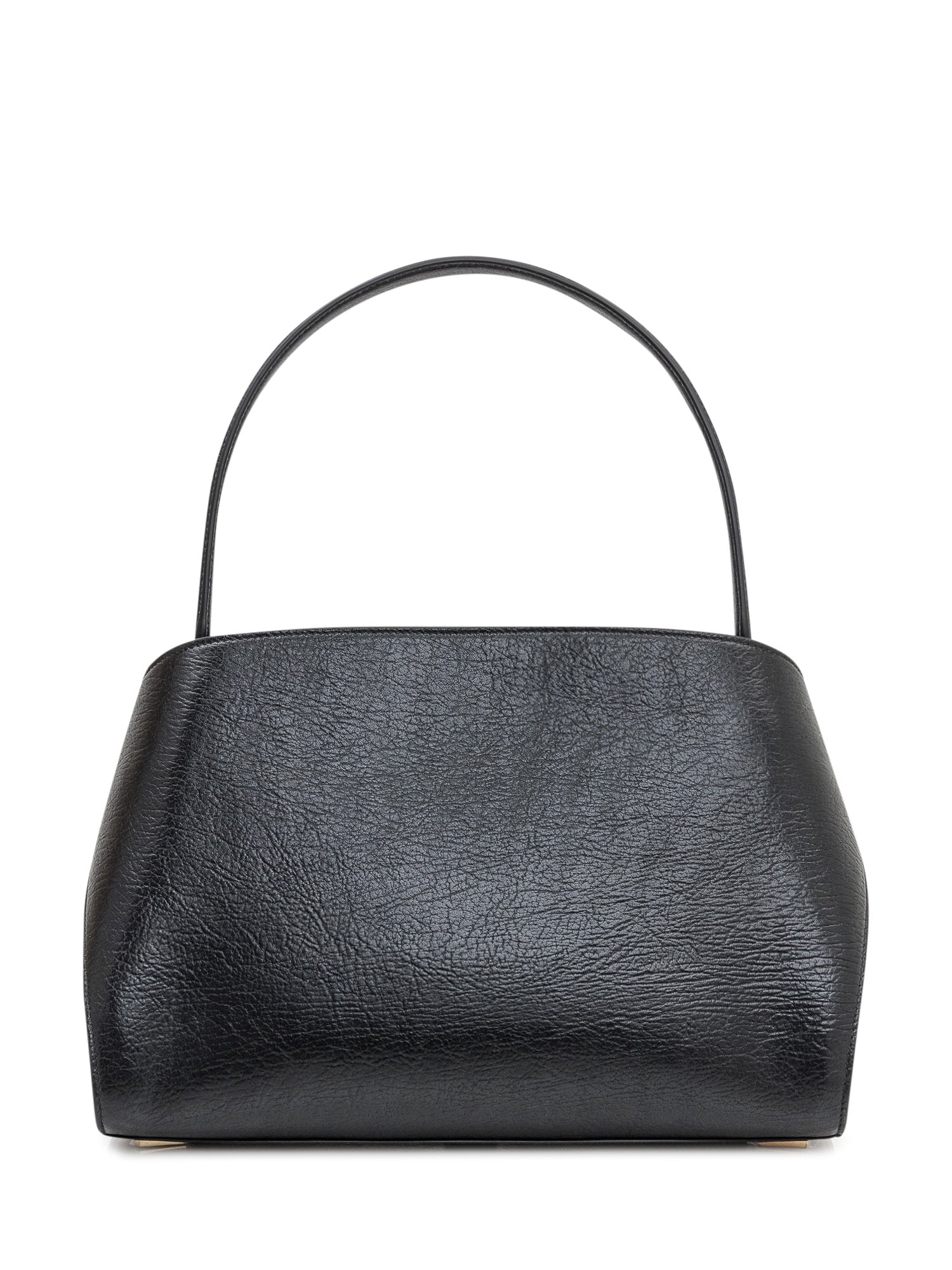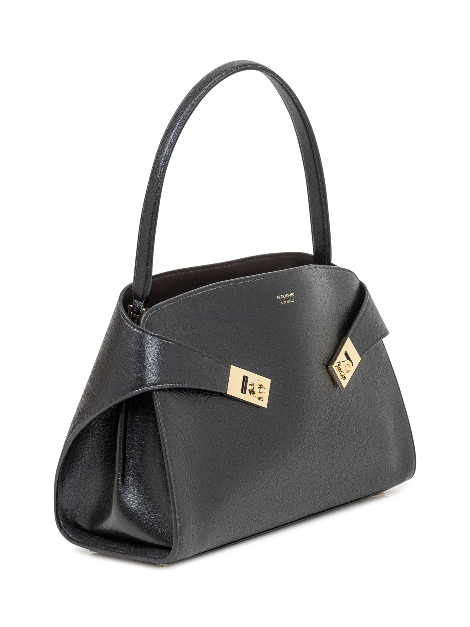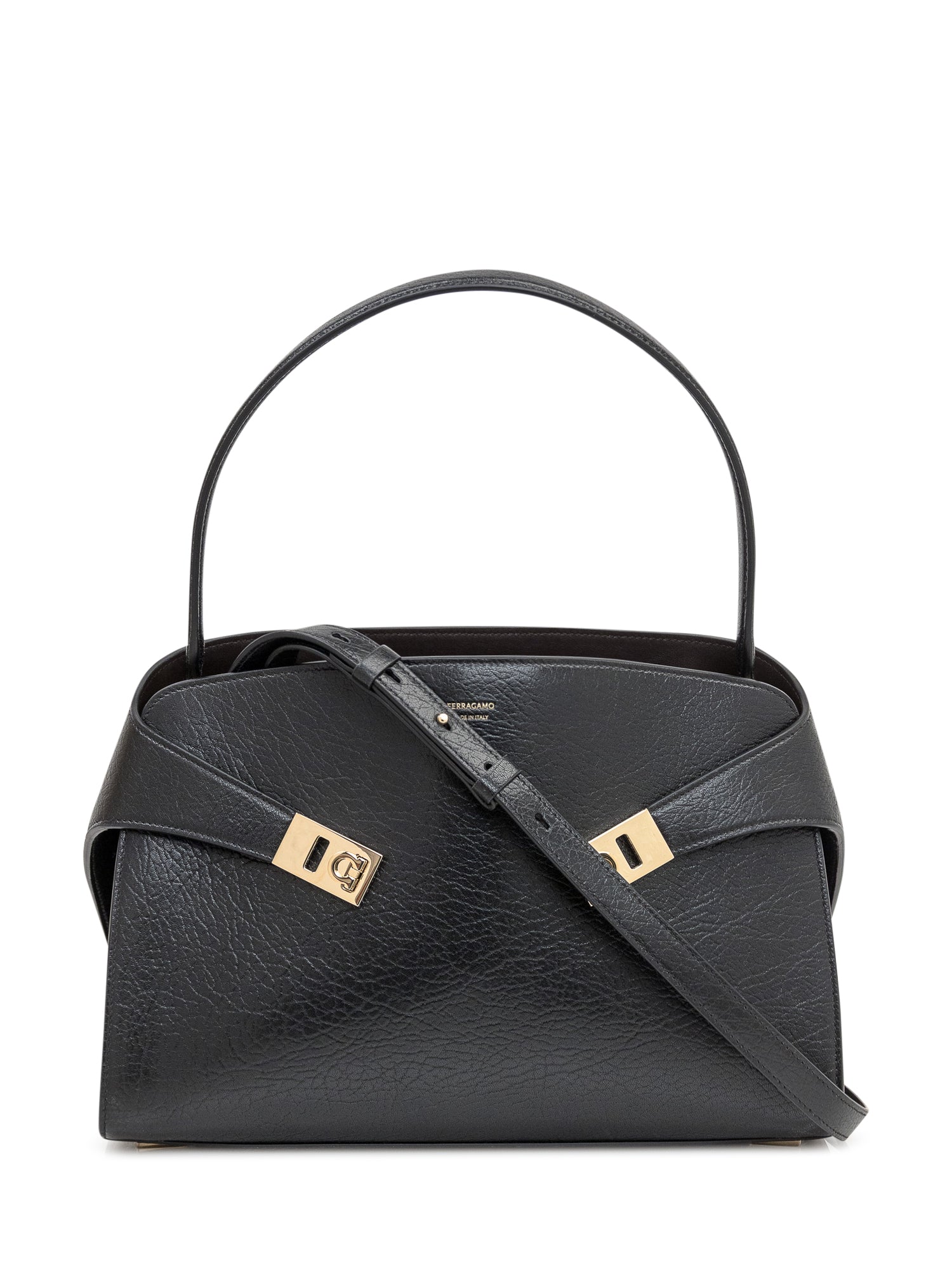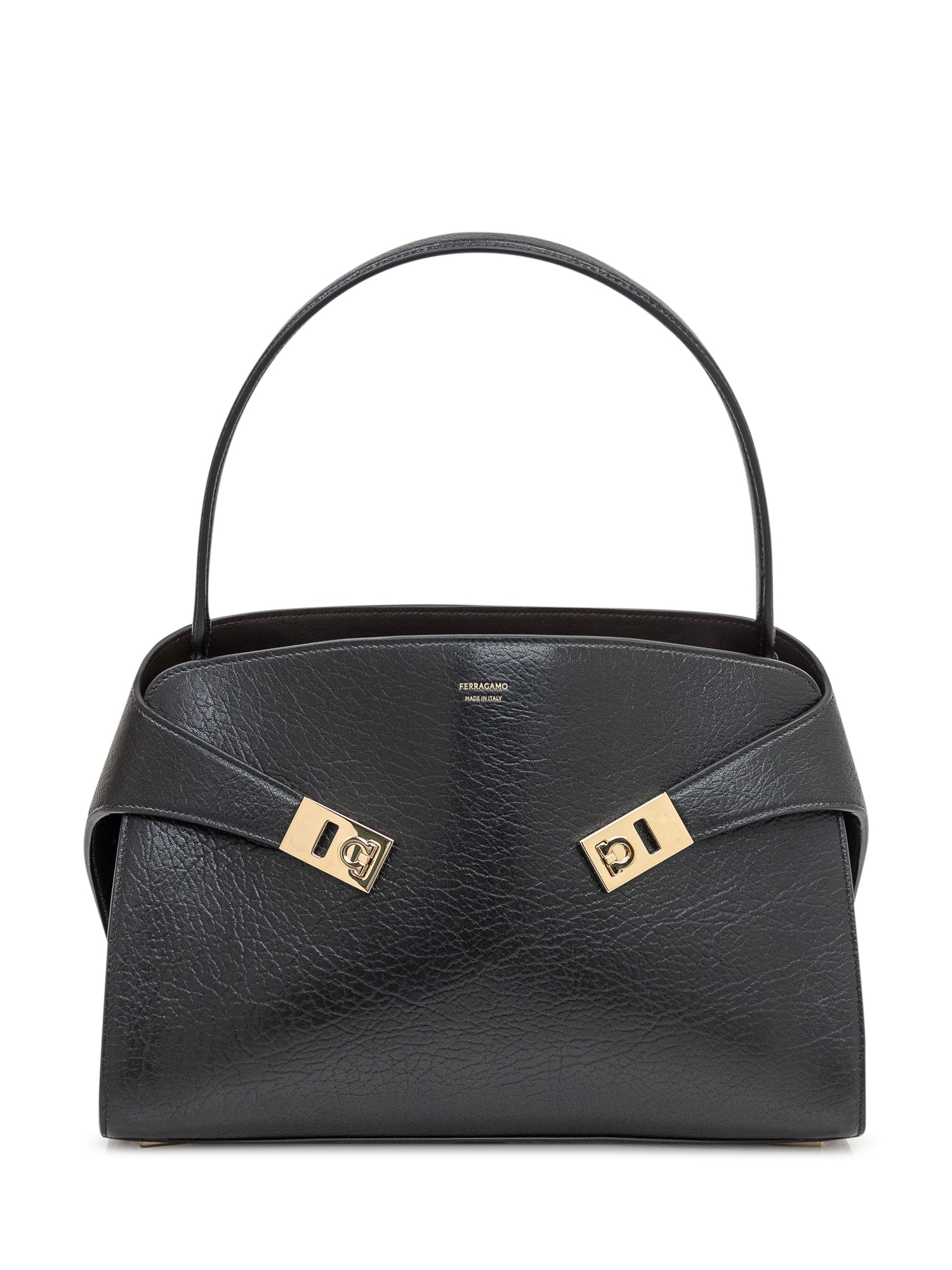 Borsa Ferragamo in pelle nera martellata con manico singolo e chiusura con dettagli metallici dorati.