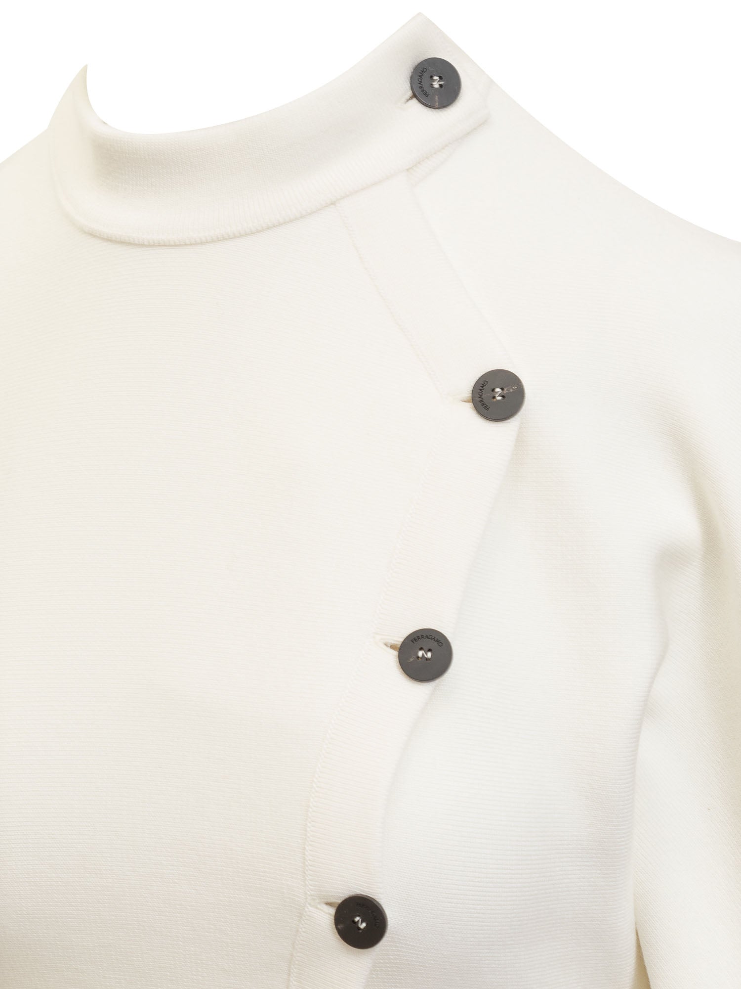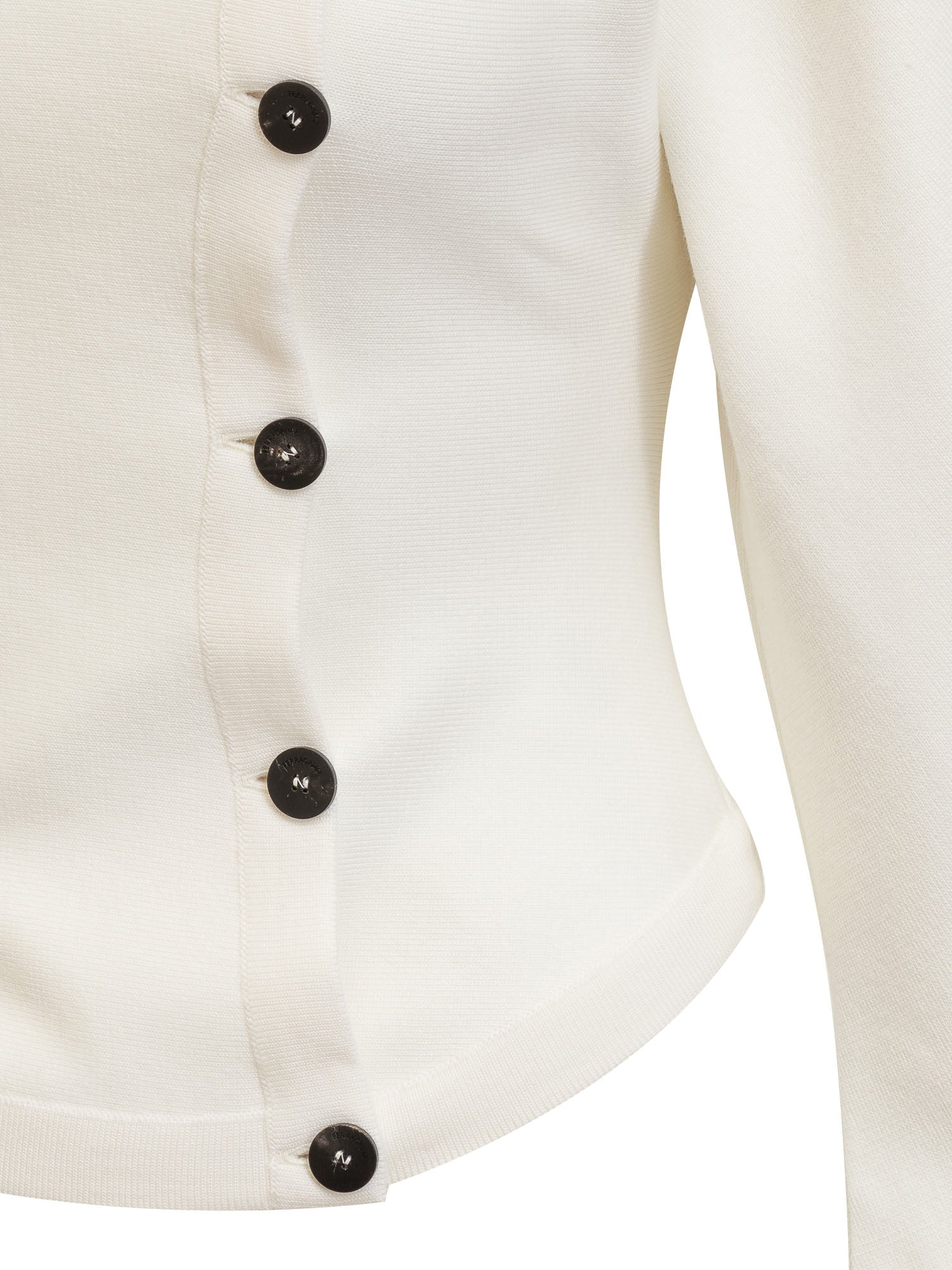 Giacca tricot a maniche lunghe. Collo alto. Chiusura laterale sul davanti. Baschina posteriore e sagomature. Maniche cocoon con polsi alti. Realizzata in maglia compatta di lana tecnica.