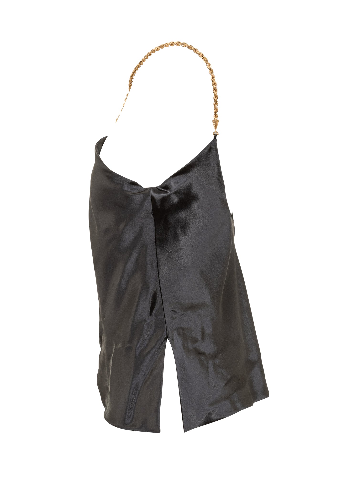 Top in raso di viscosa smanicato. Spalline dorate ad effetto torchon. Scollo a goccia. Spacchi laterali. Fit scivolato.