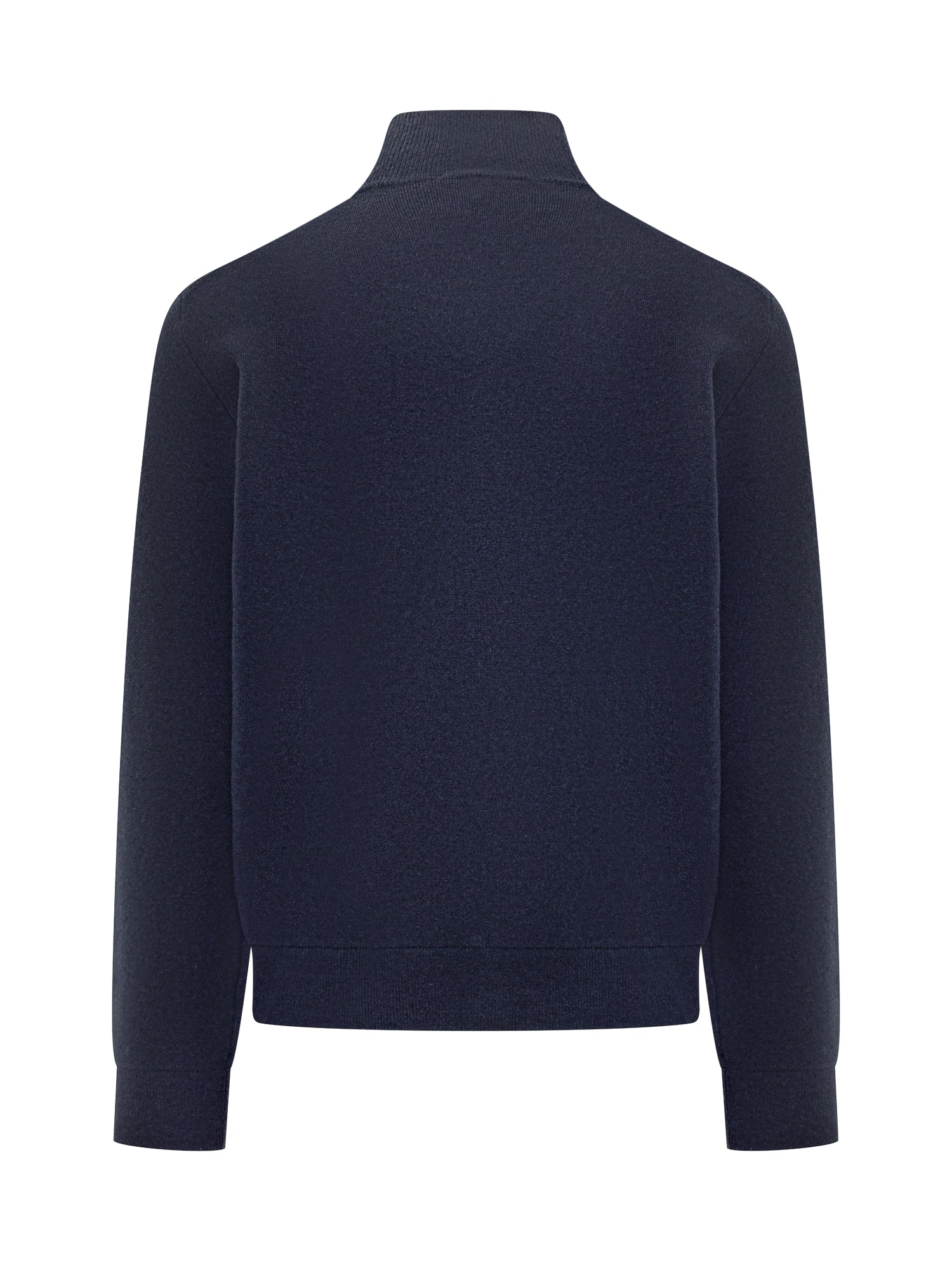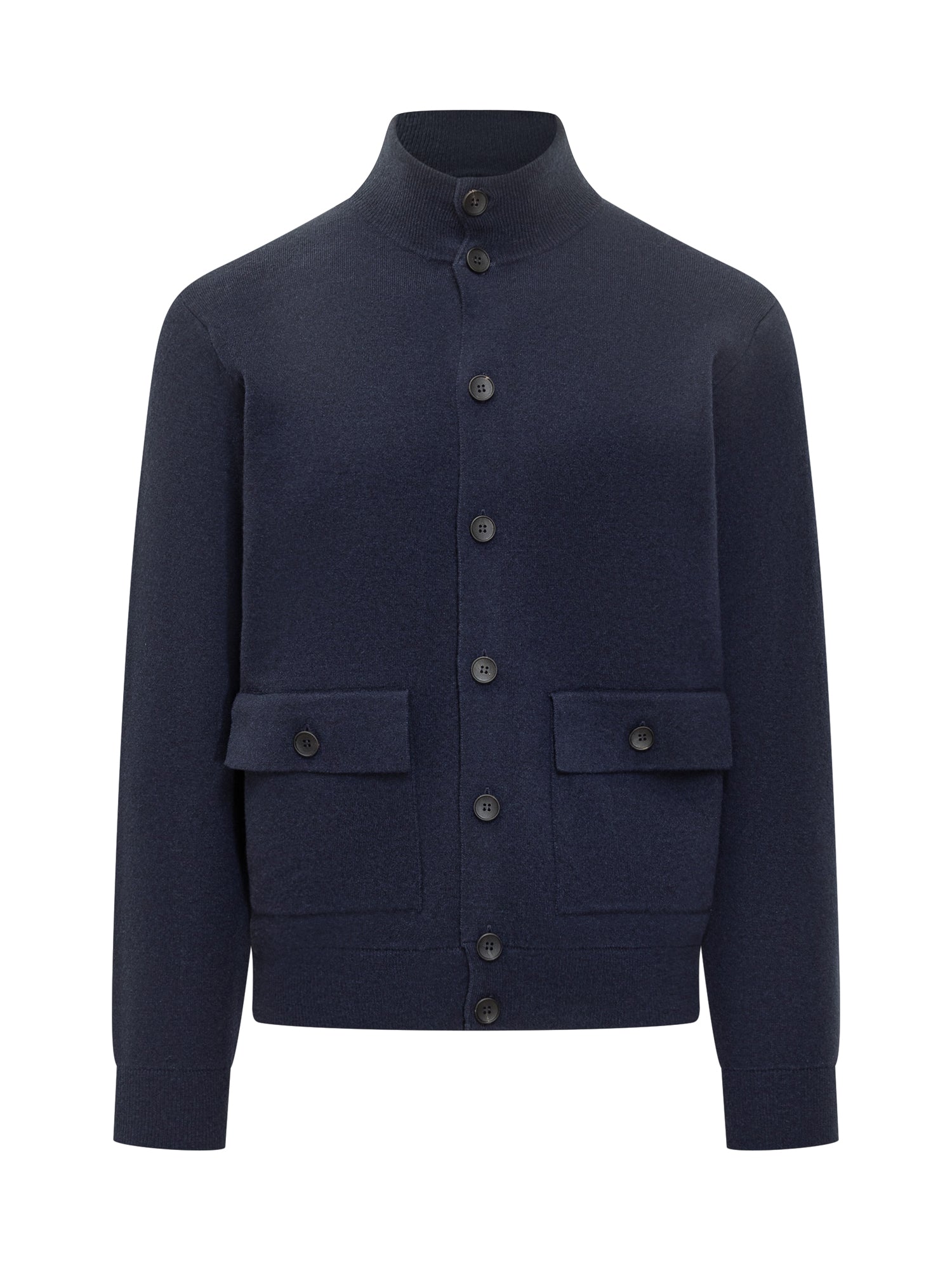 Cardigan Filippo De Laurentiis in morbida lana blu con collo alto, chiusura a bottoni e tasche applicate.