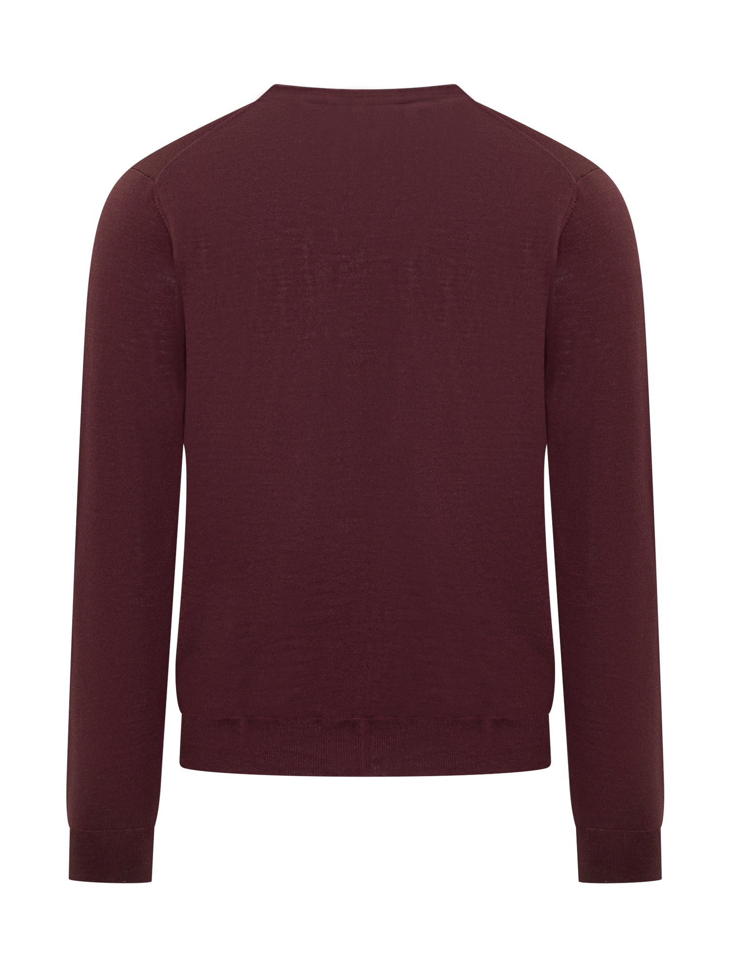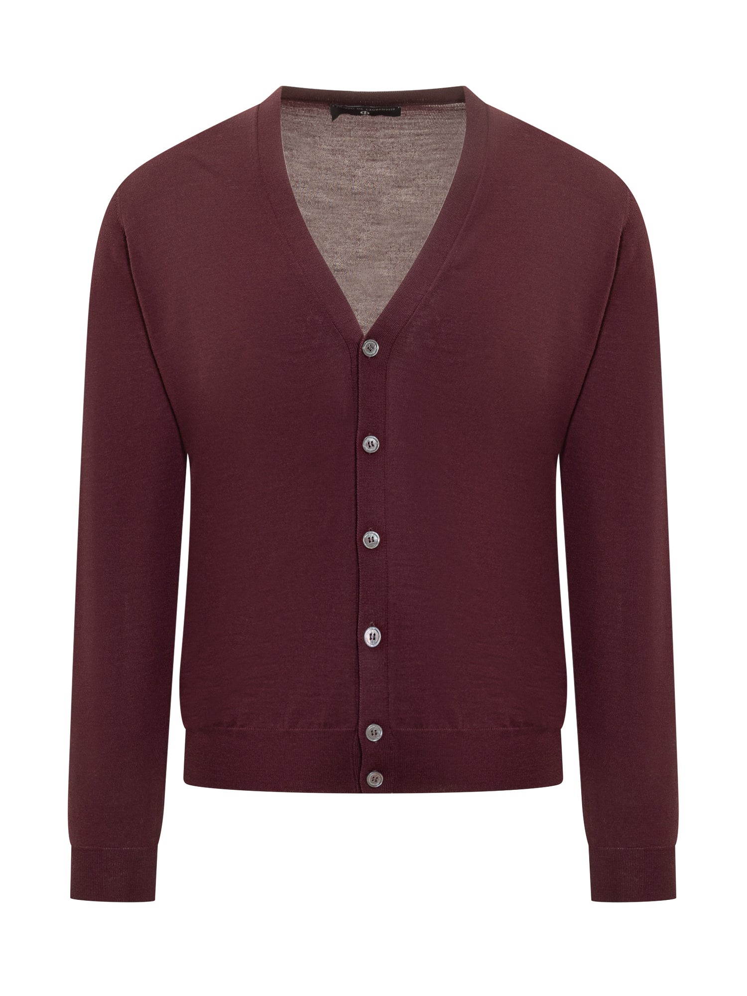 Cardigan Filippo De Laurentiis in morbida lana bordeaux con scollo a V e chiusura a bottoni.