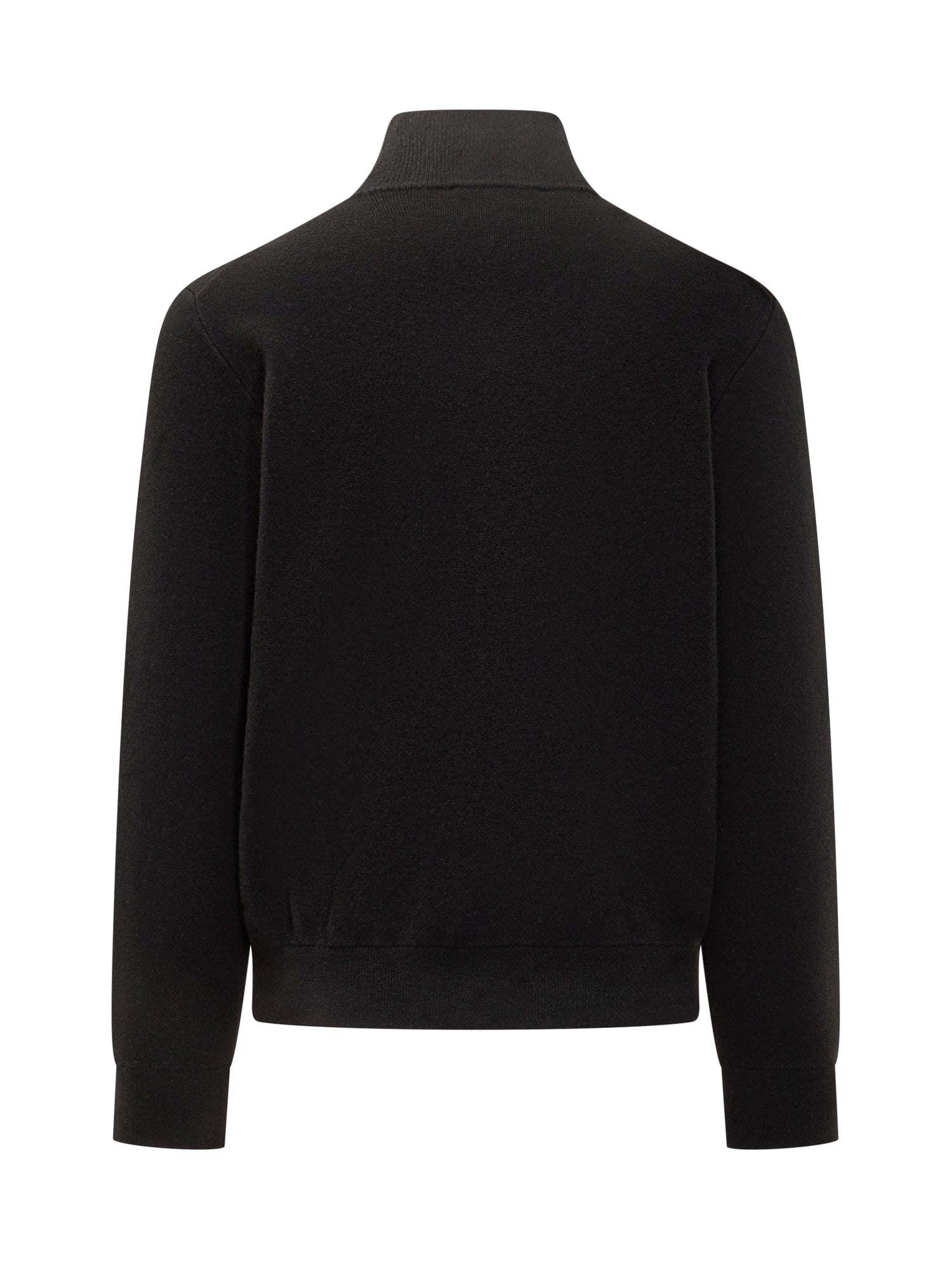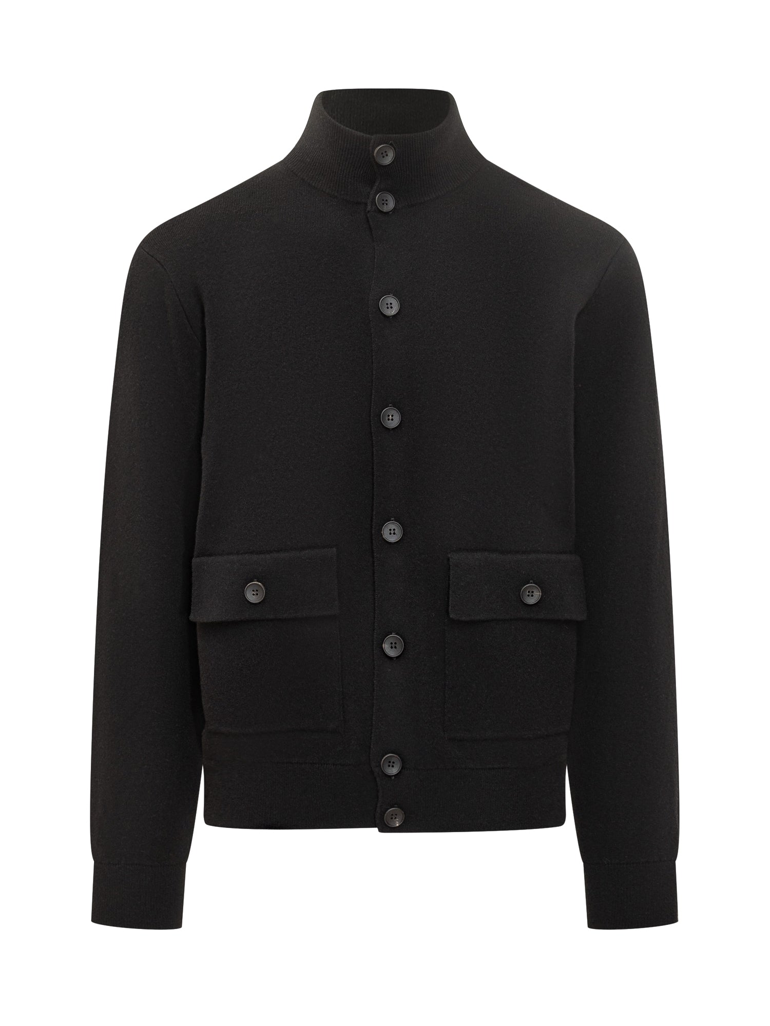 Cardigan Filippo De Laurentiis in morbida lana nera con collo alto, chiusura a bottoni e tasche applicate.