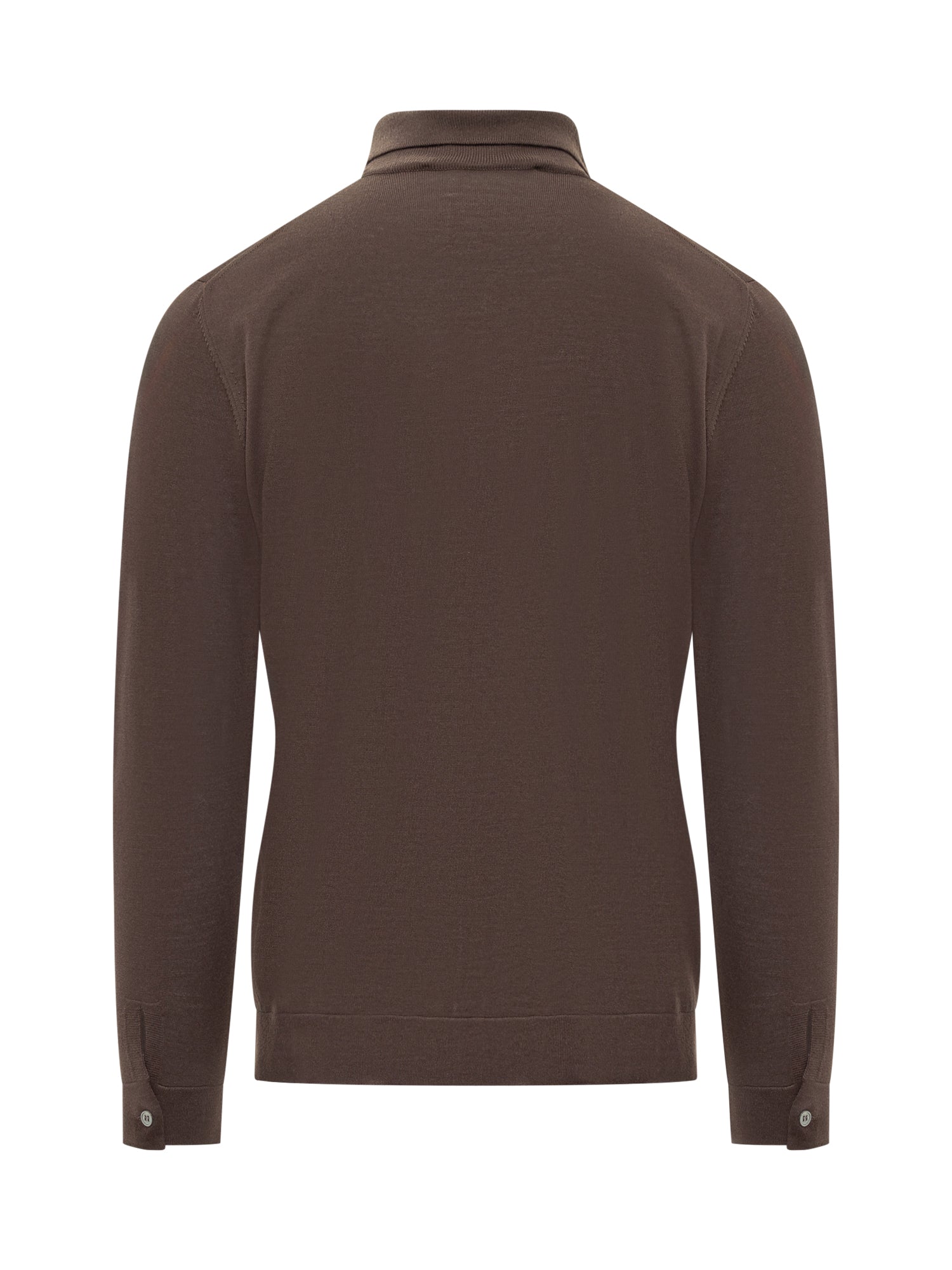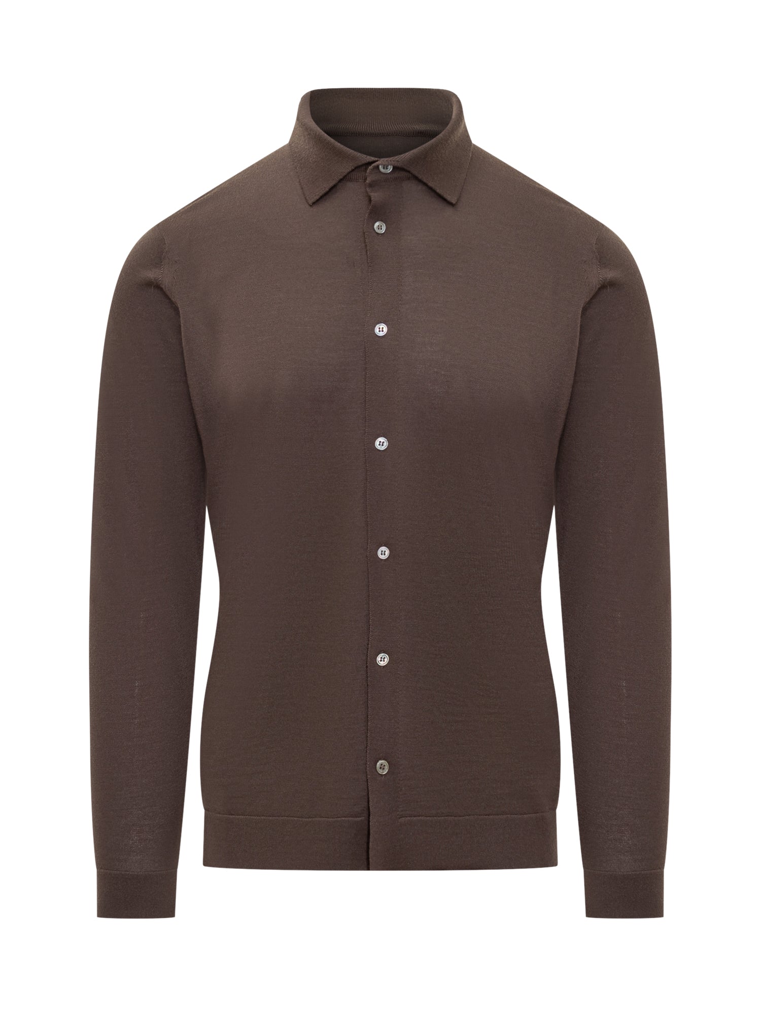 Polo Filippo De Laurentiis in fine maglia marrone con colletto classico e chiusura a bottoni.