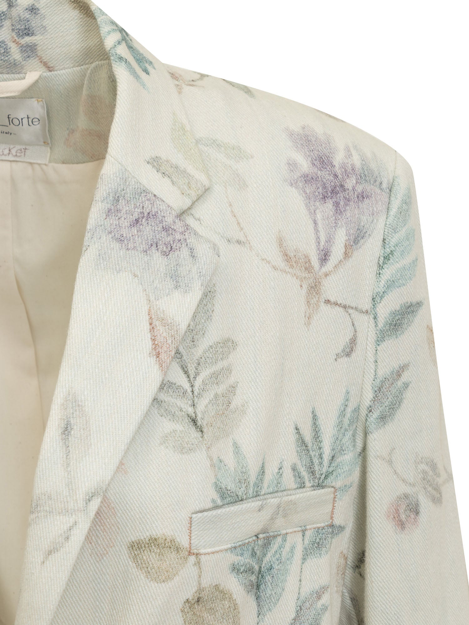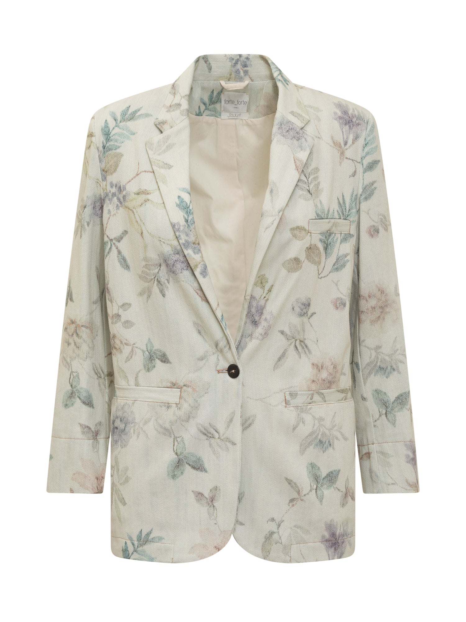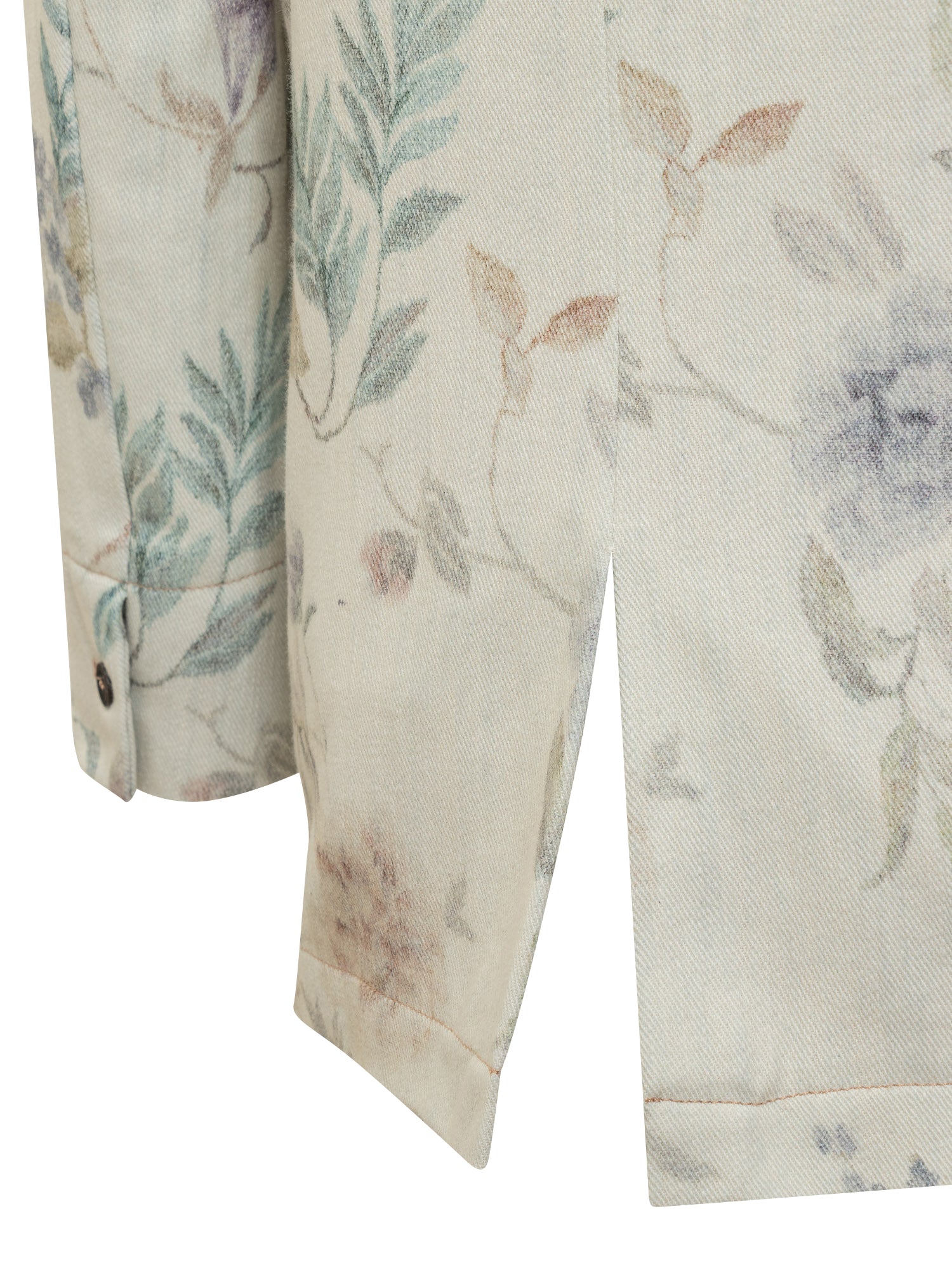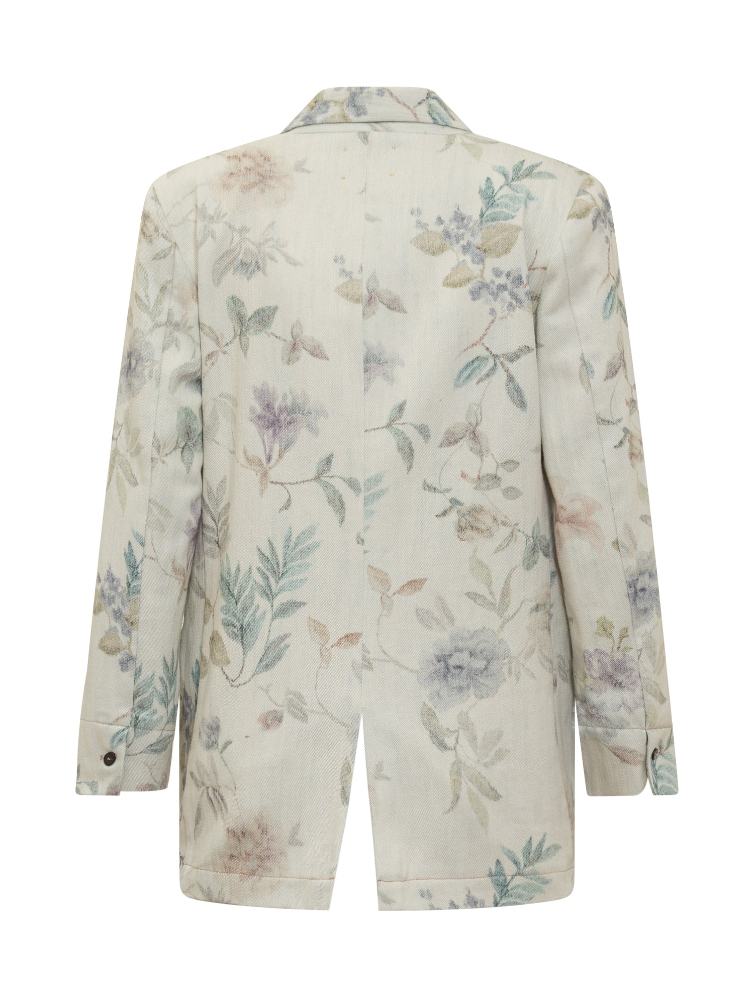 Blazer in denim. Chiusura con bottone. Due tasche a filetto sul davanti. Bottone sui polsi. Stampa floreale all-over.