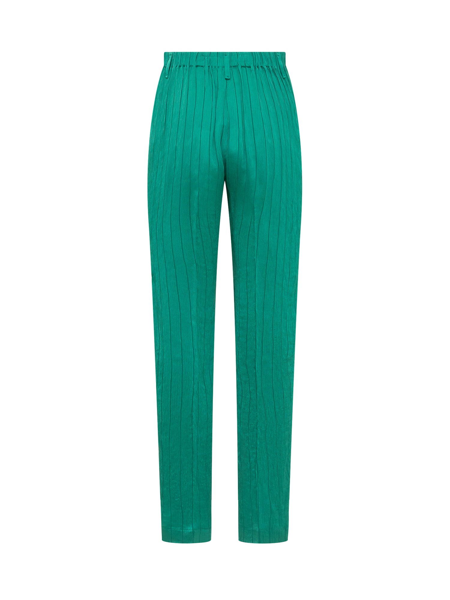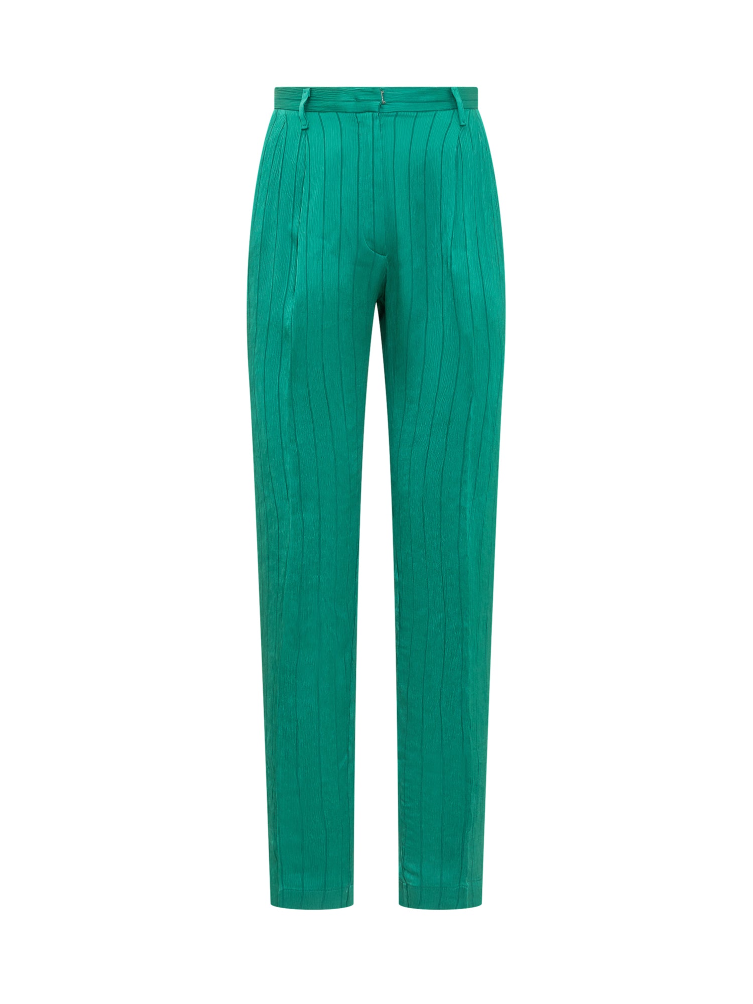 Pantalone lungo dritto. Chiusura con gancino, bottone e zip. Passanti per cintura. Due tasche. Motivo a righe.