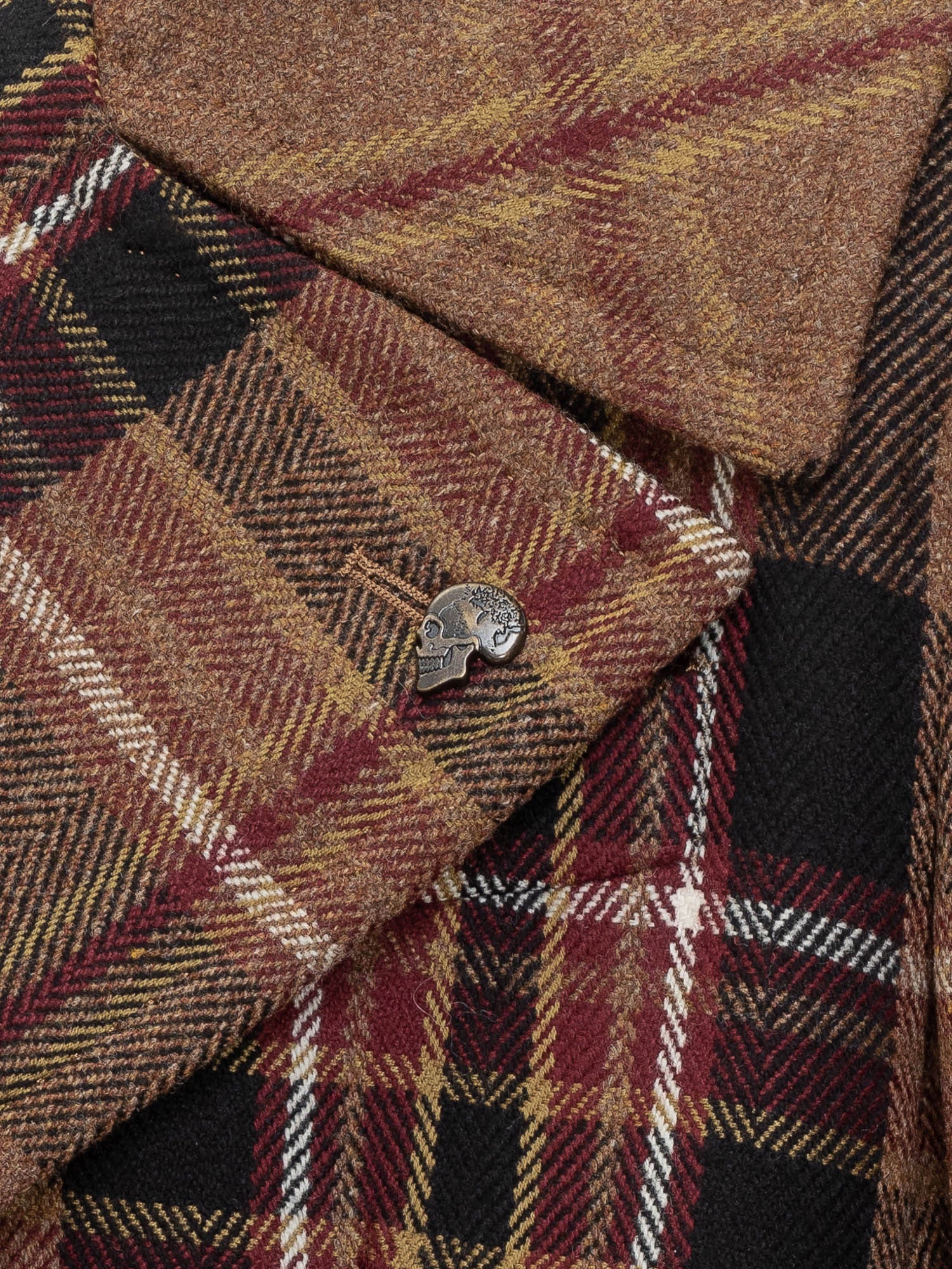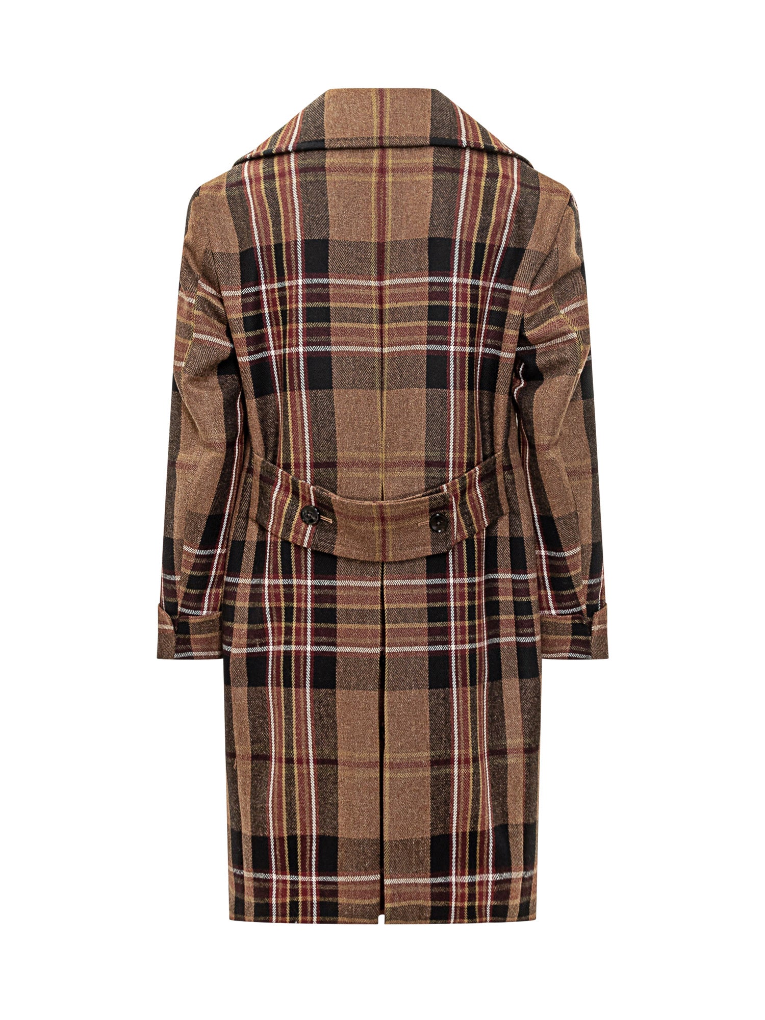 Cappotto Gabriele Pasini in lana con motivo check marrone, nero e bordeaux. Modello doppiopetto con revers ampi e tasche con patta.