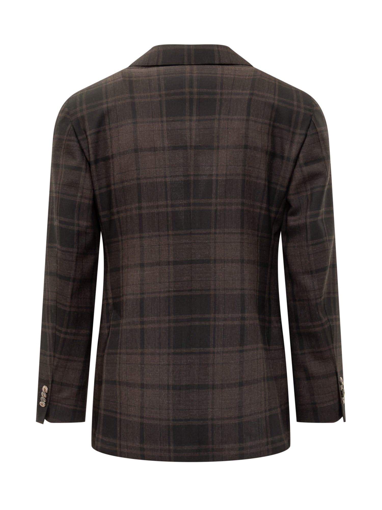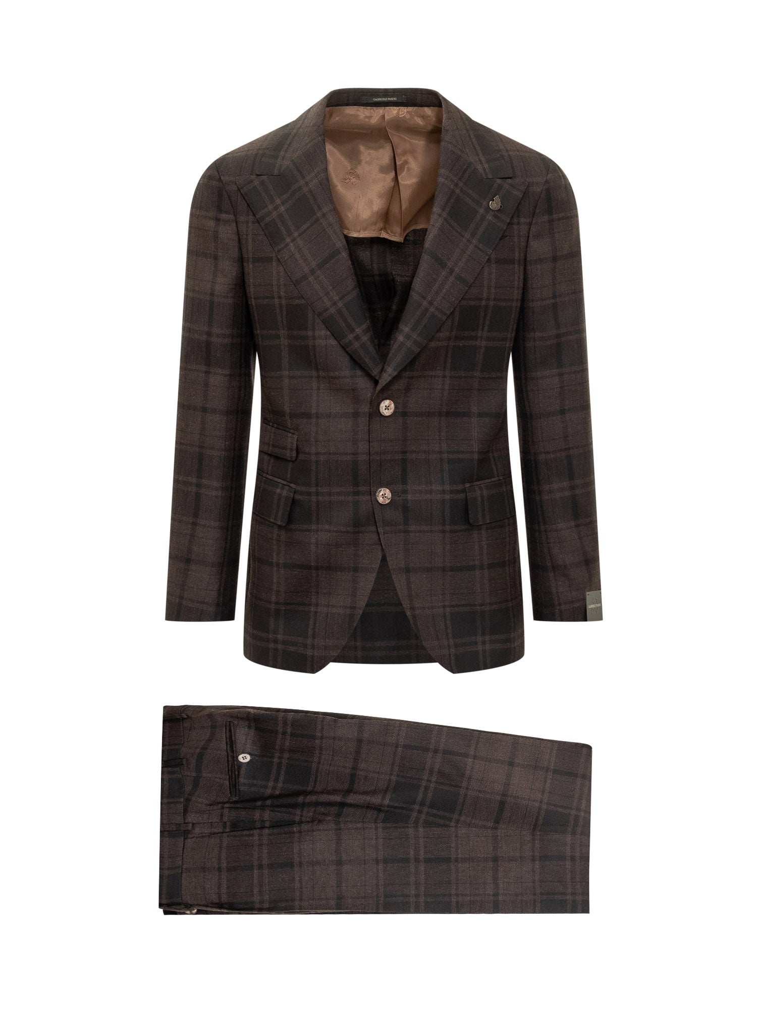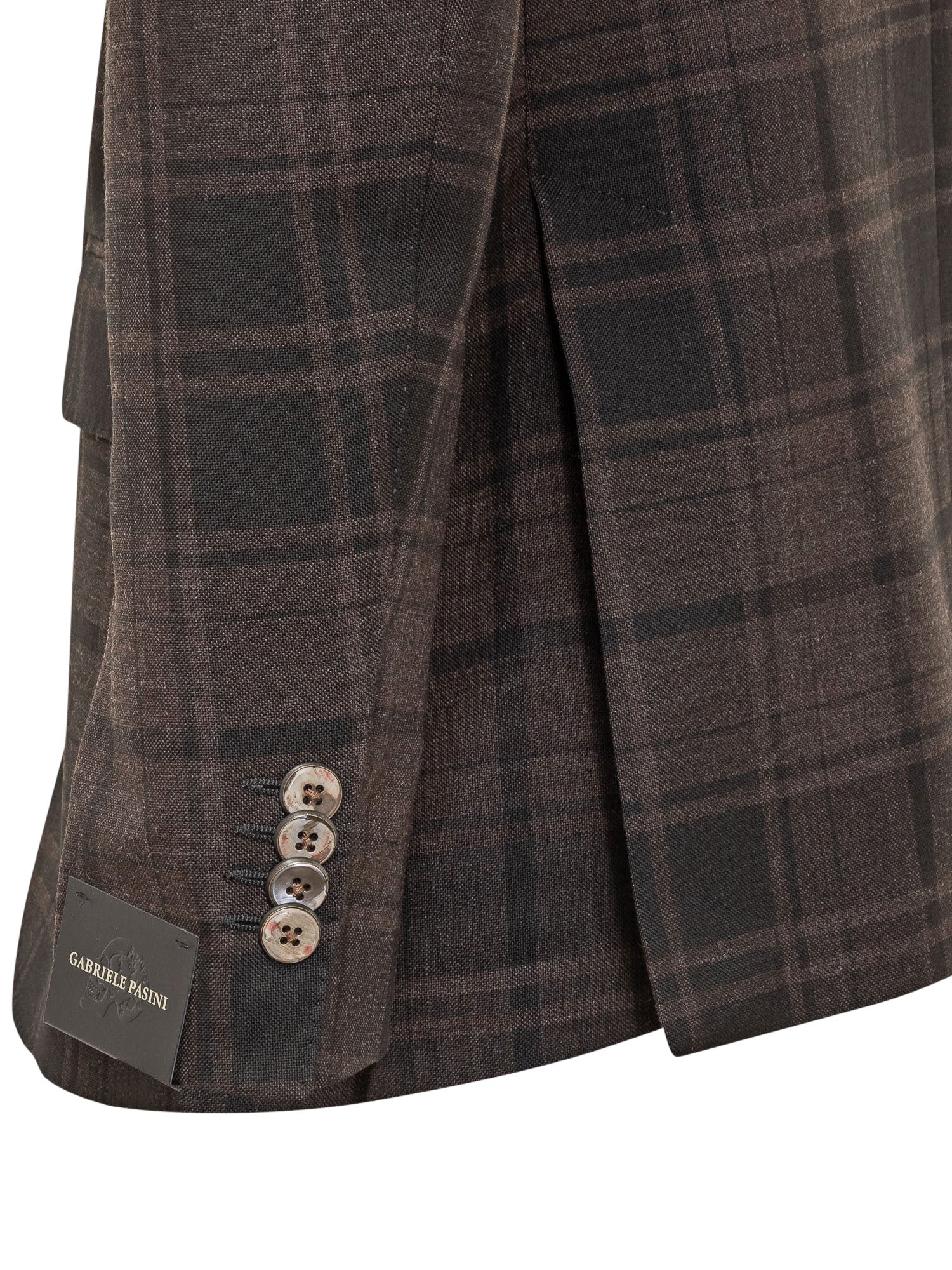 Raffinato abito Gabriele Pasini in marrone con motivo principe di Galles, giacca monopetto a due bottoni e revers a lancia, pantaloni coordinati.