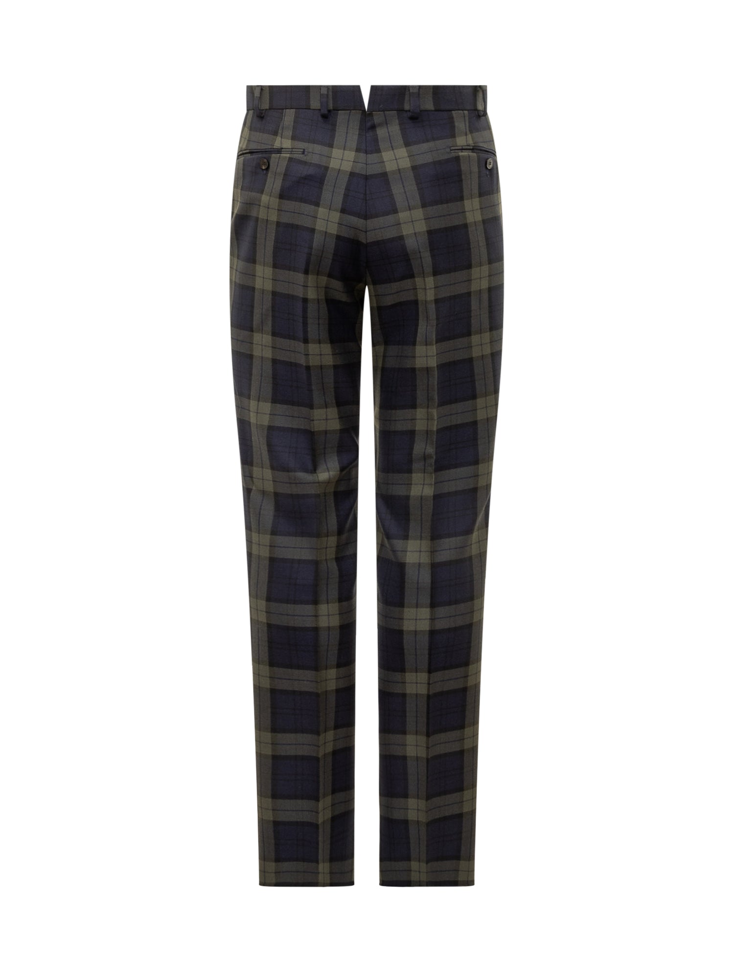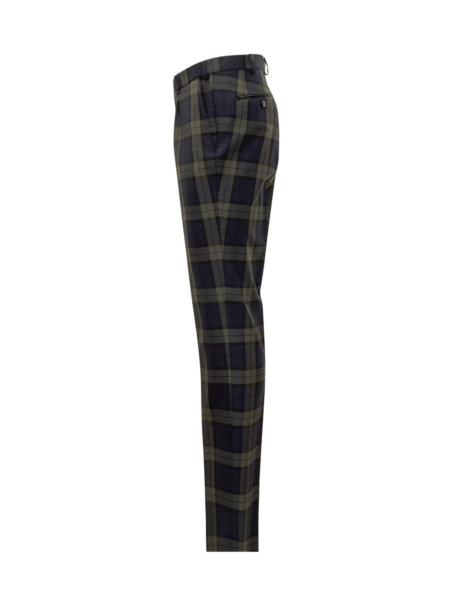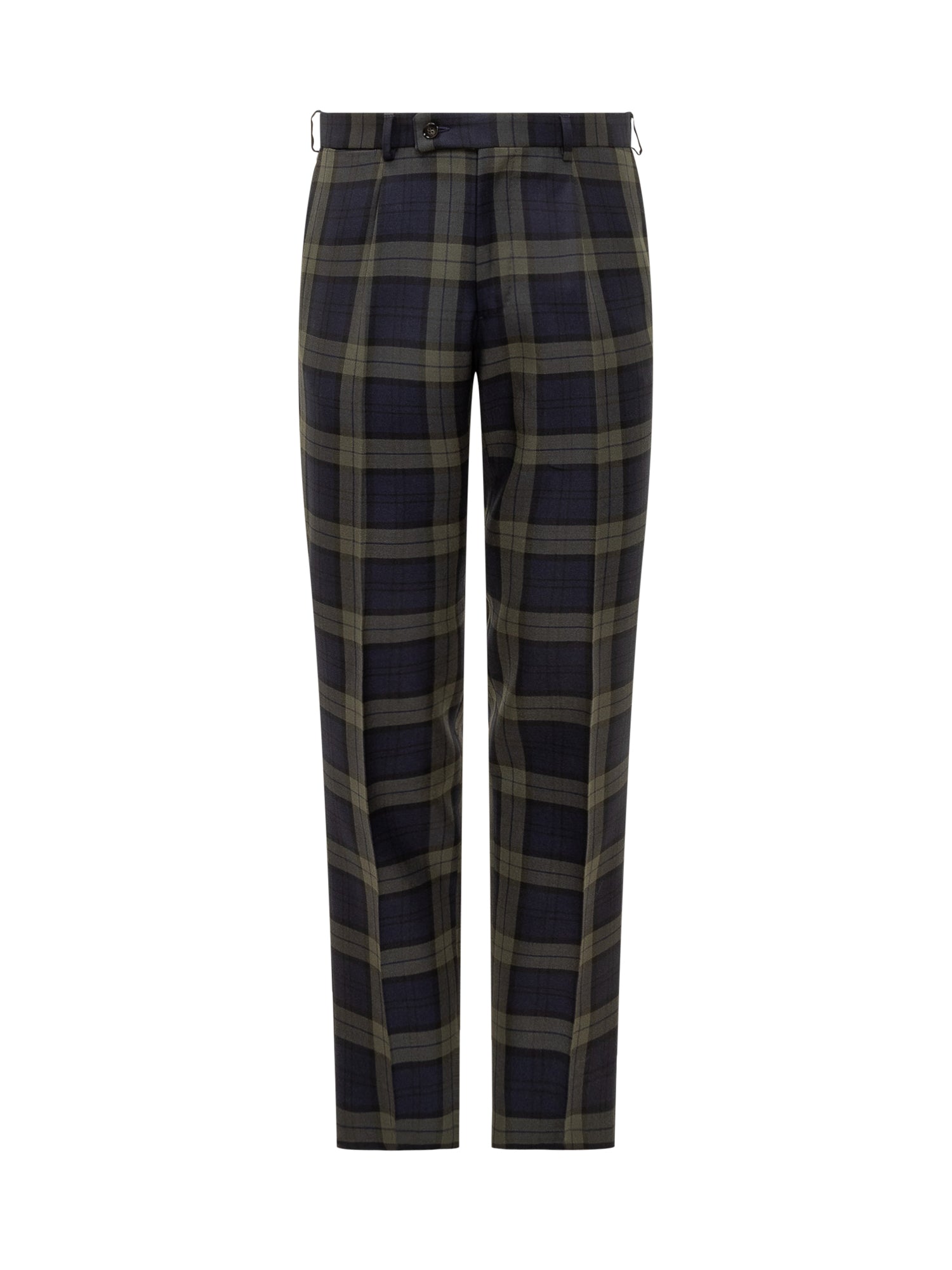 Pantaloni Gabriele Pasini in tessuto tartan verde e blu, con pinces frontali e chiusura con bottone.