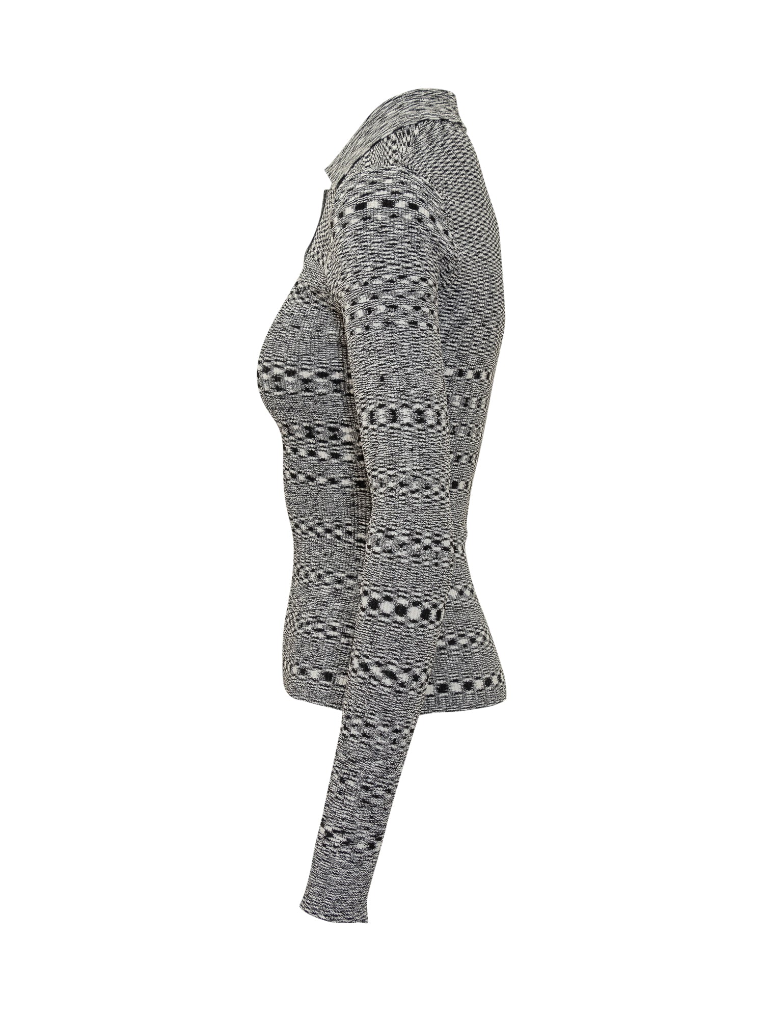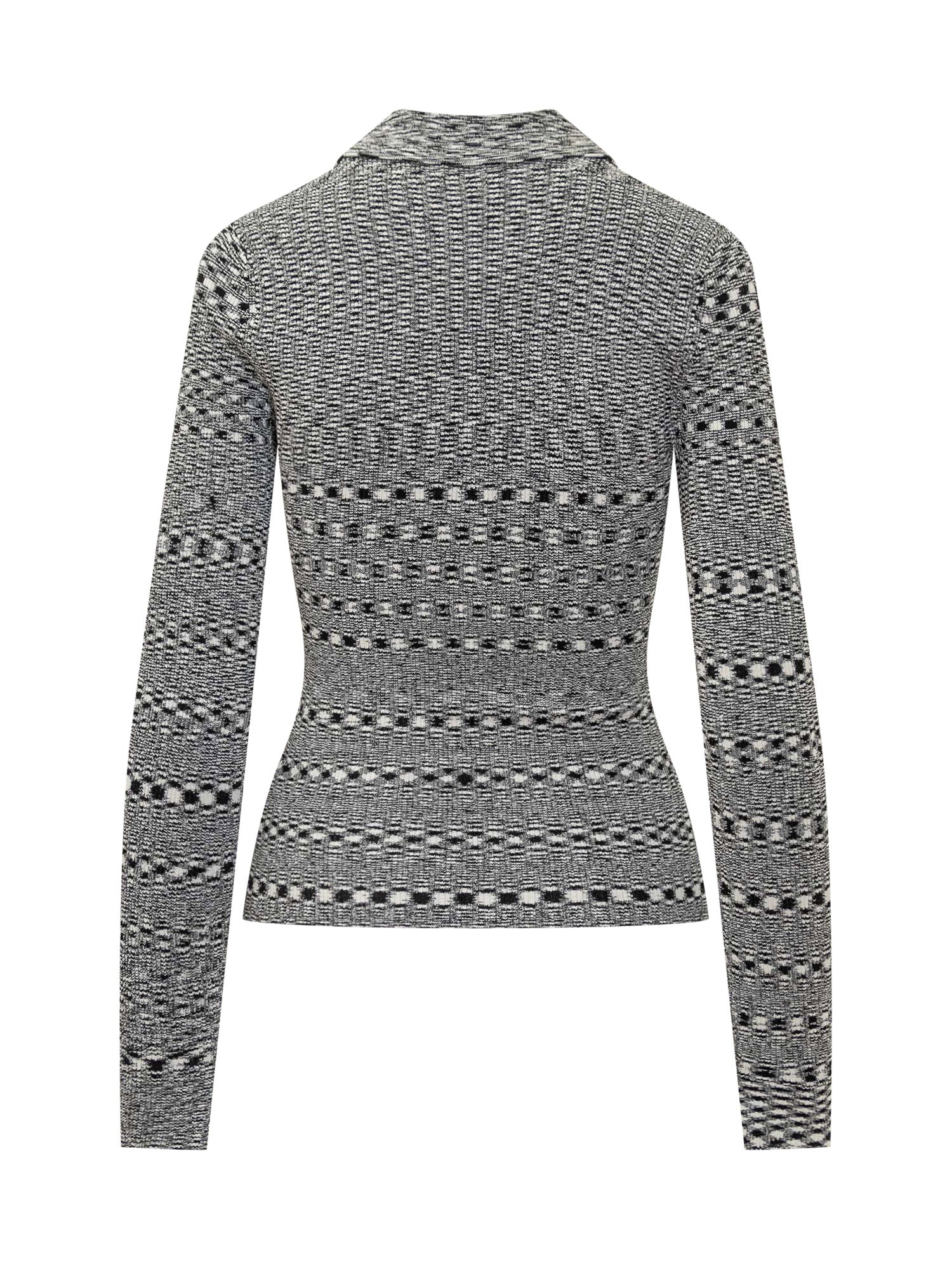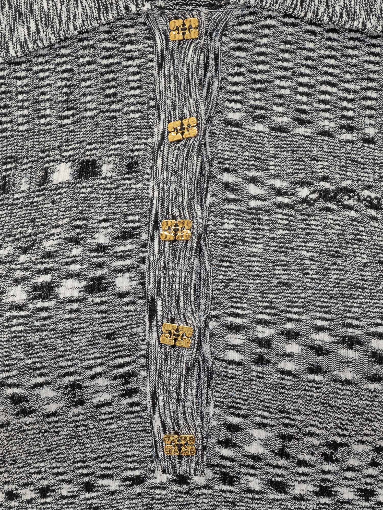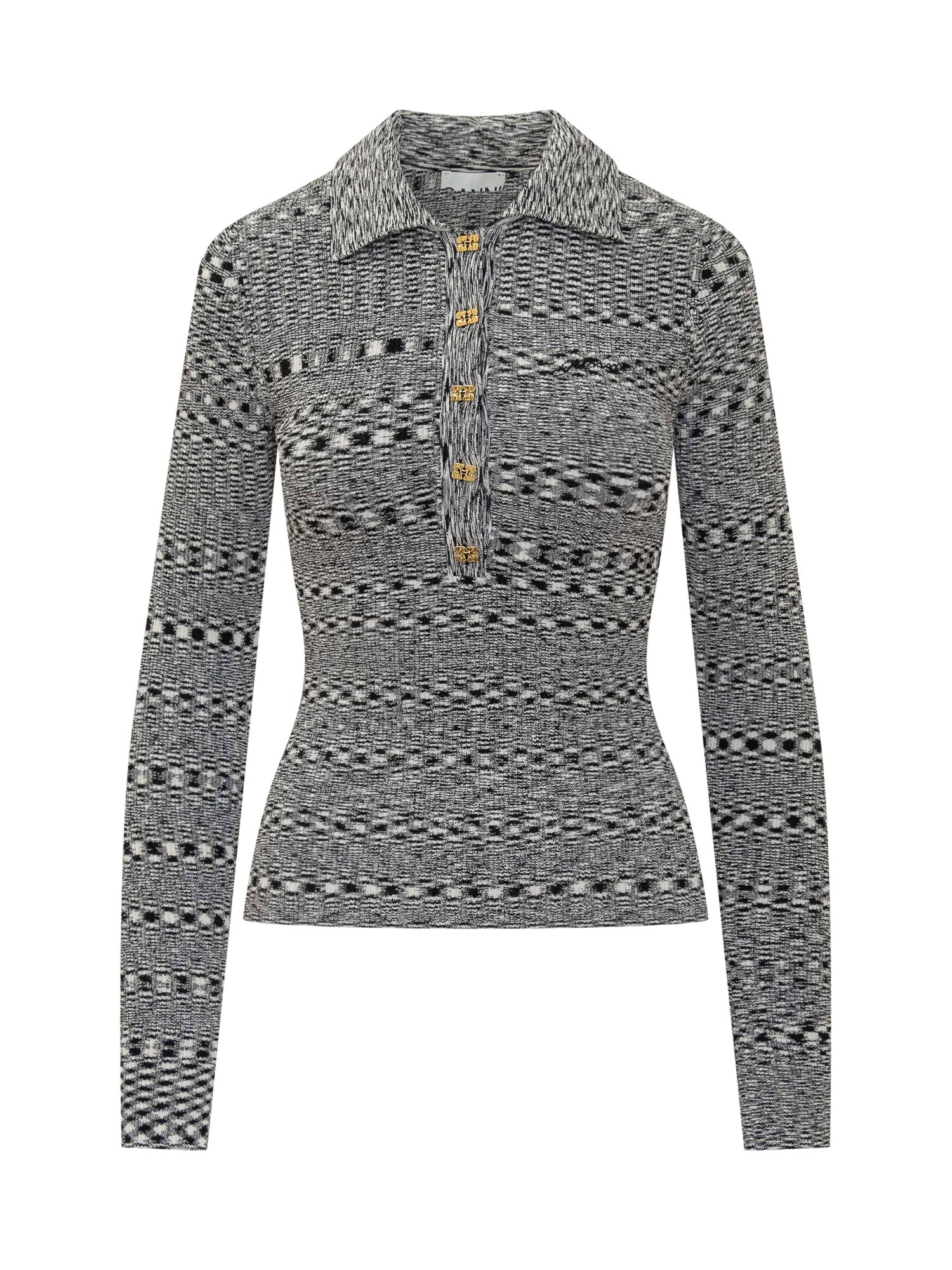 Maglia Ganni in maglia jacquard grigia e nera, con colletto polo e bottoni dorati sul davanti.