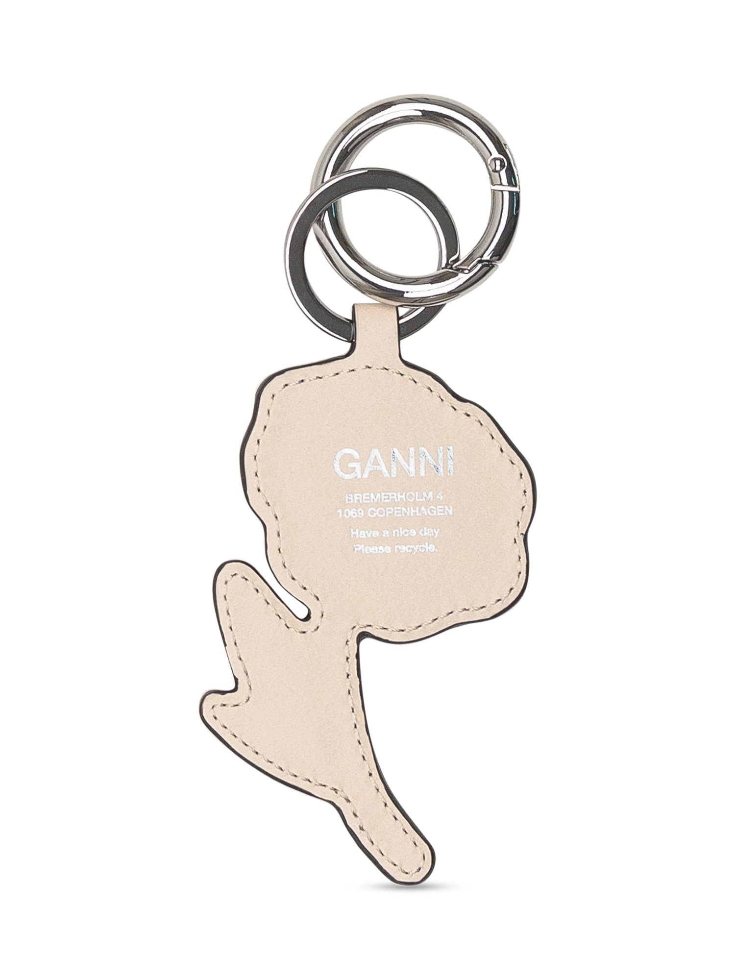 Portachiavi Ganni a forma di fiore rosa con anello in metallo e logo stampato.