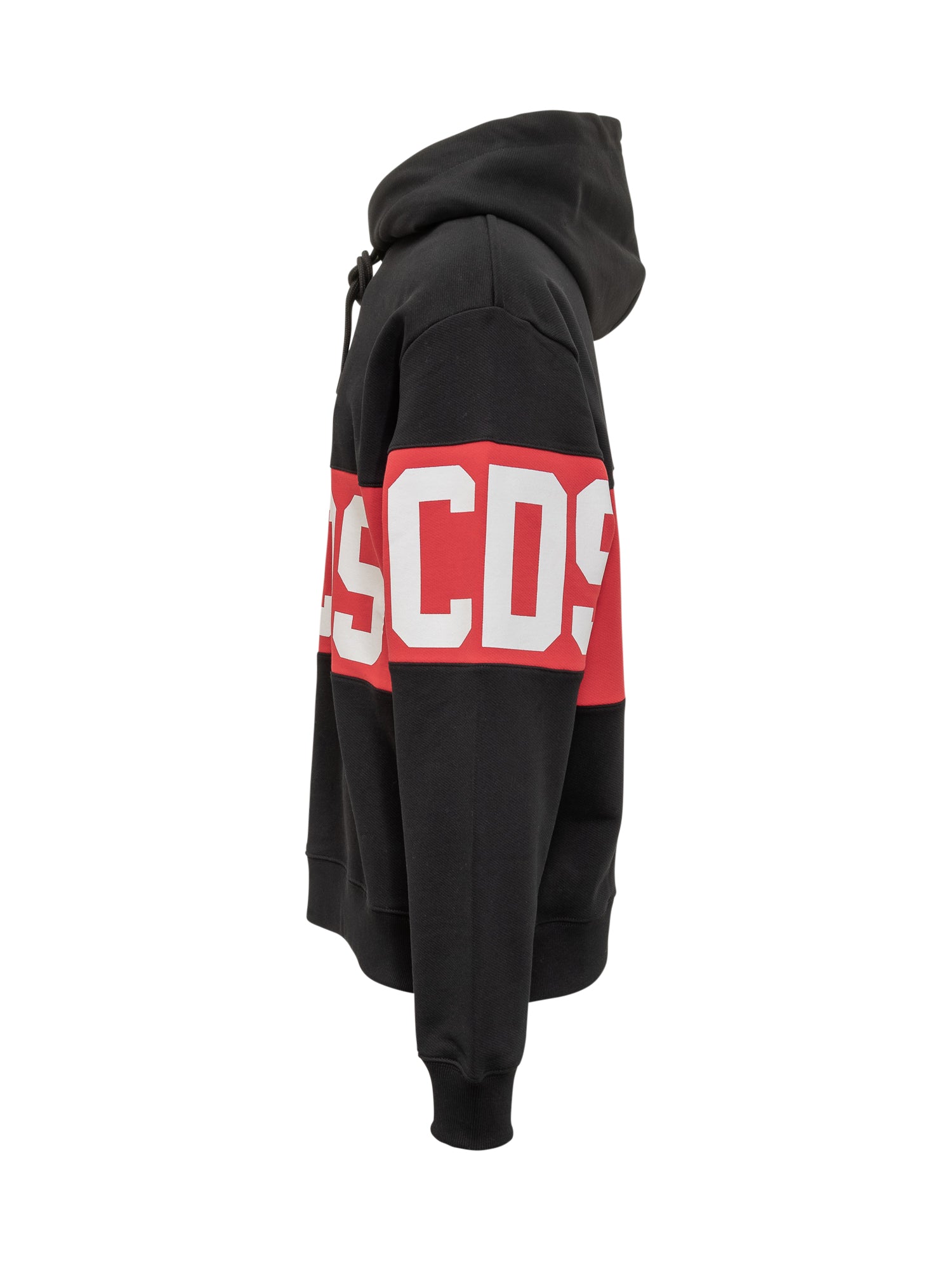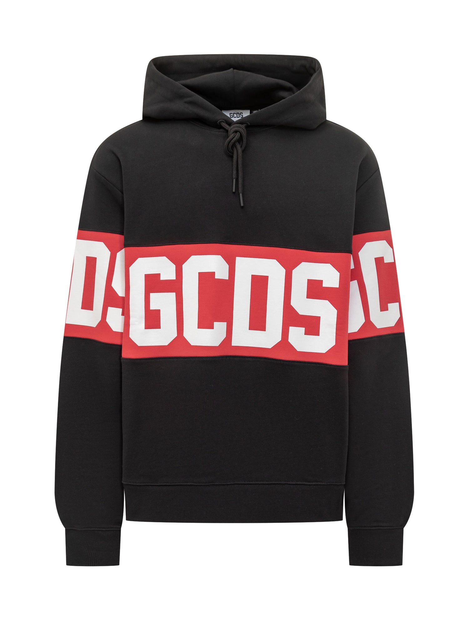 Felpa GCDS nera con cappuccio e maxi logo bianco su banda rossa a contrasto.