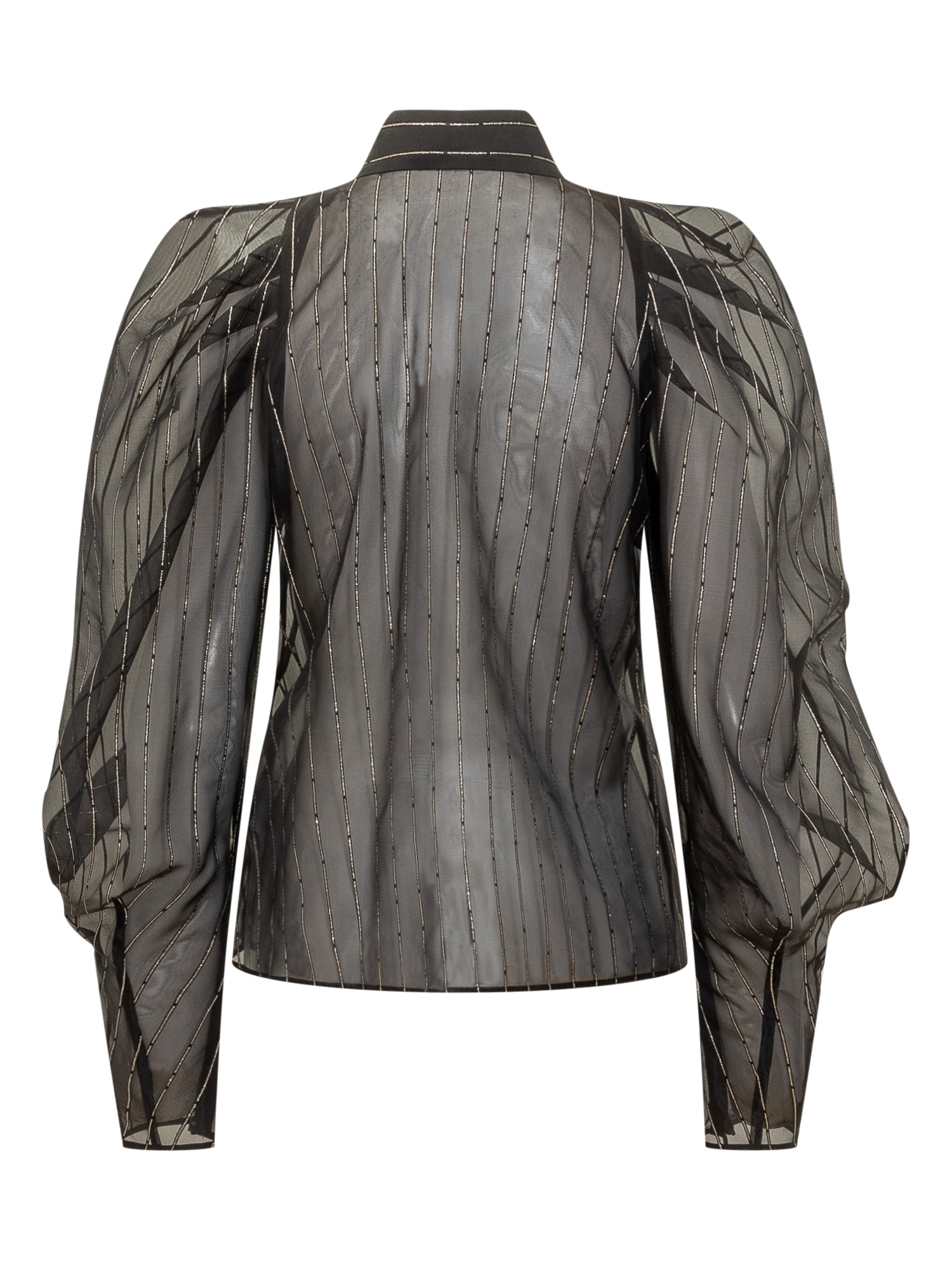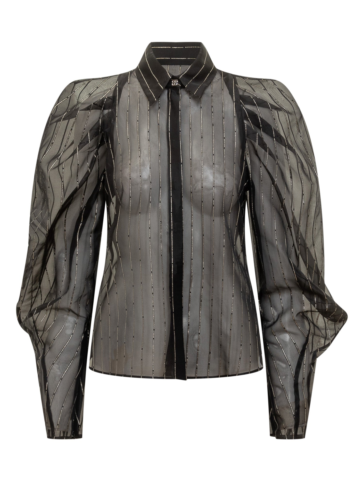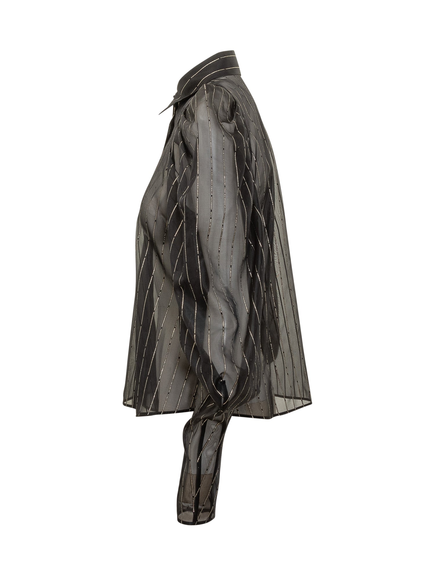 Camicia Genny in organza nera con righe metallizzate e maniche a sbuffo. Colletto classico.
