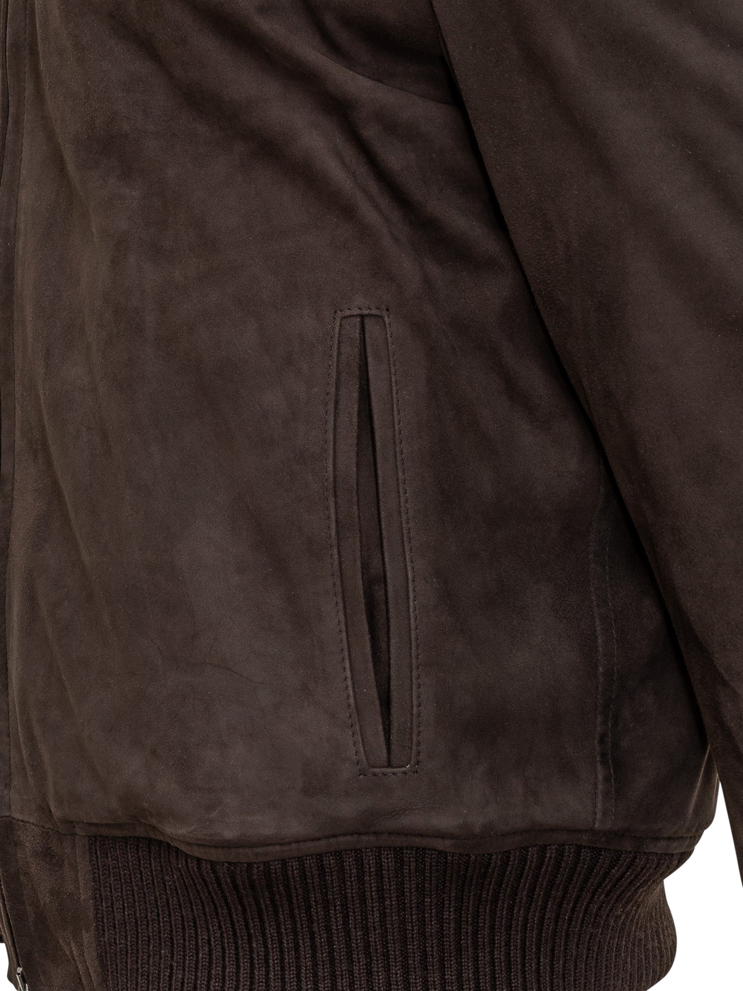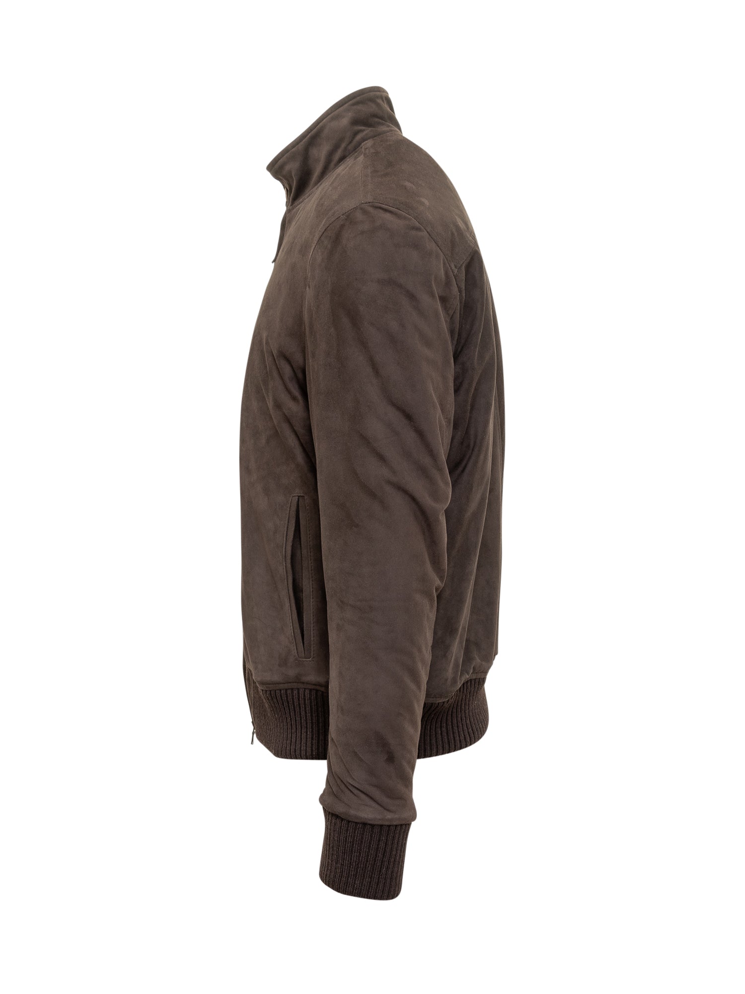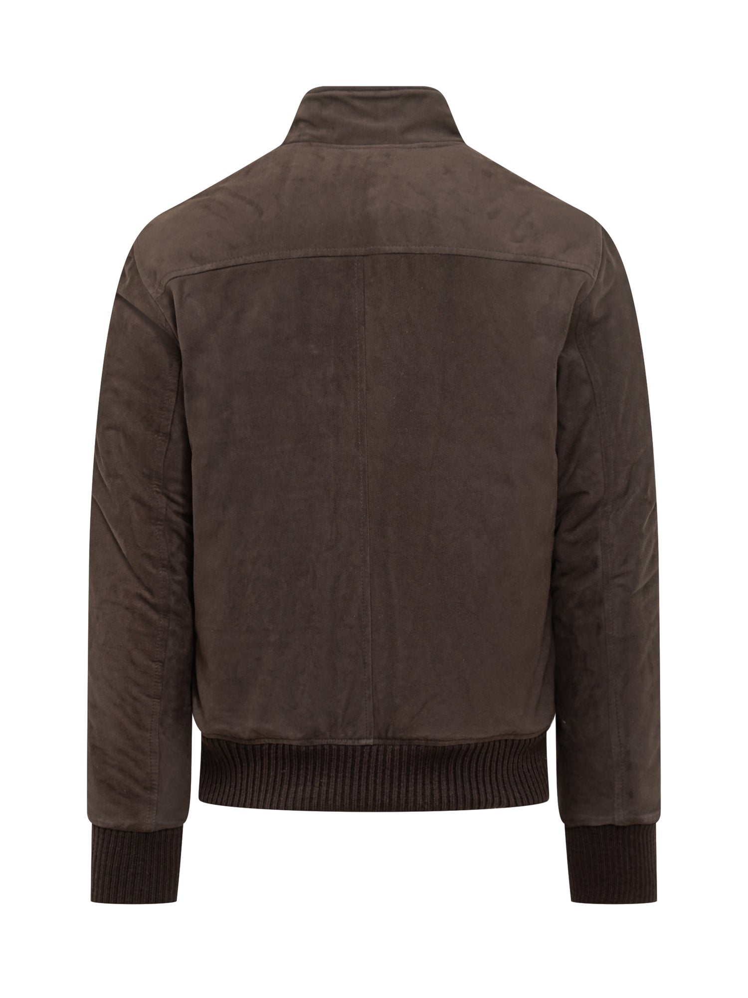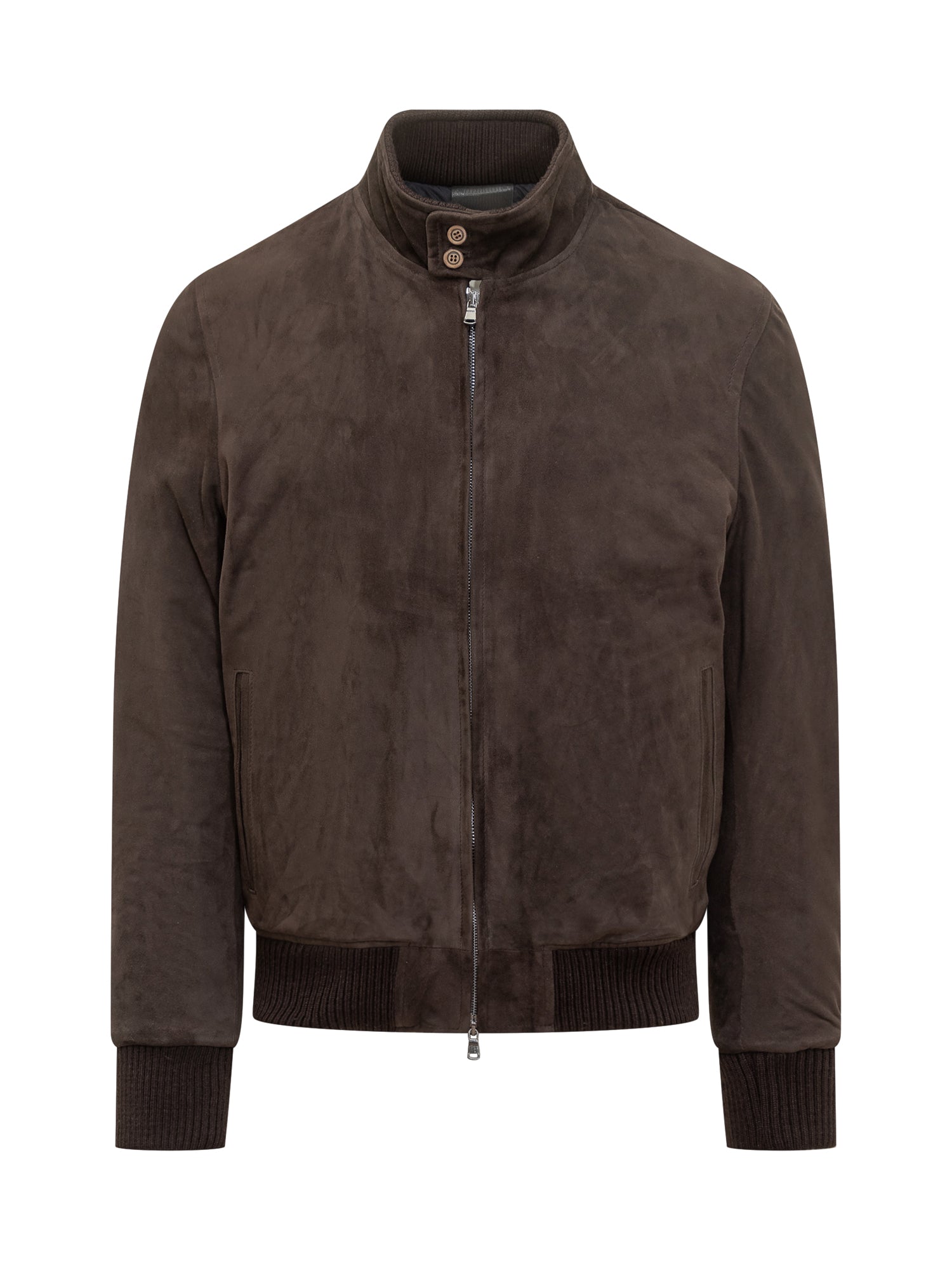 Giacca Dfour in morbido camoscio marrone con collo alto, chiusura a zip e bottoni, dettagli a coste su polsini e fondo.