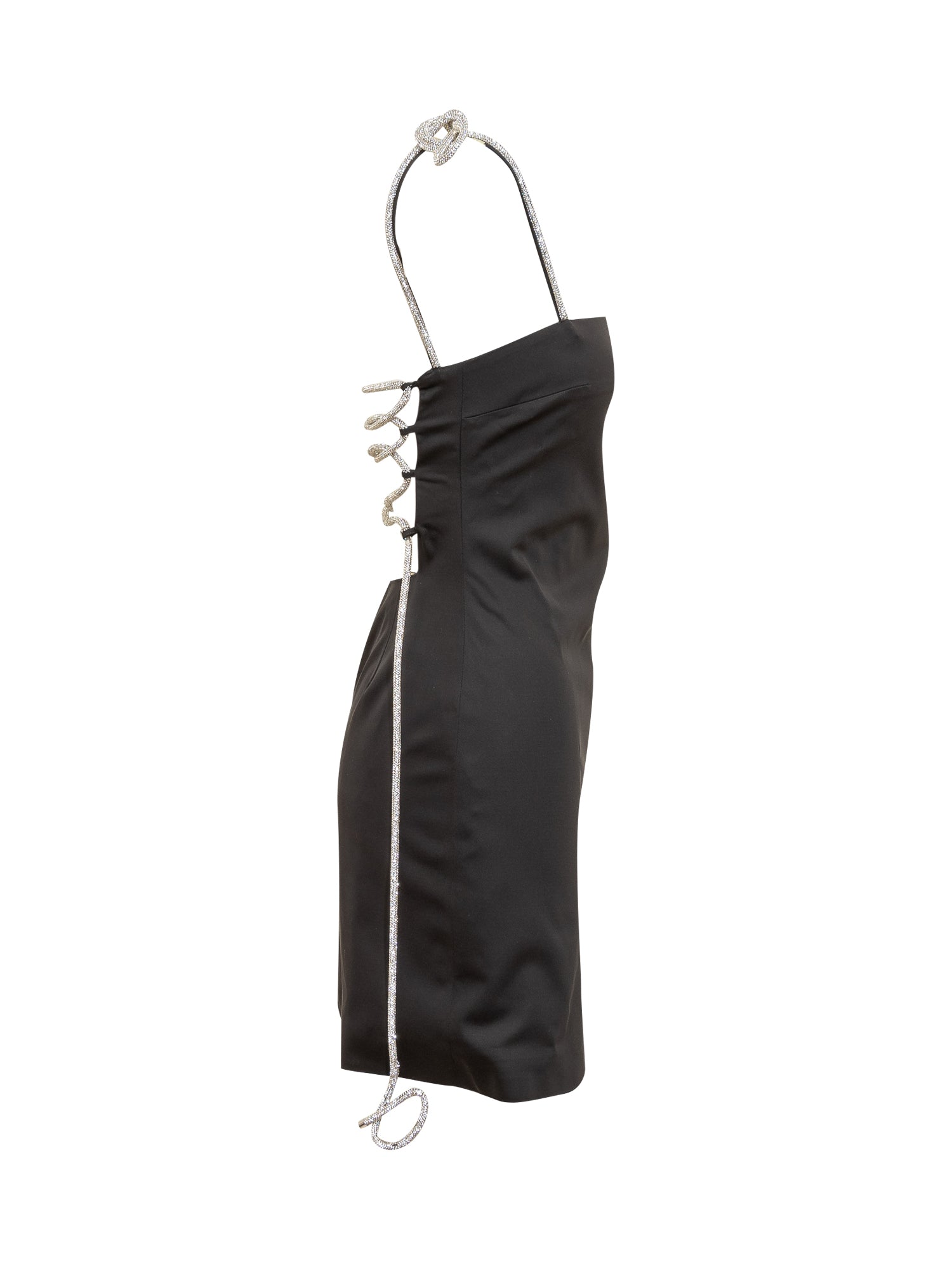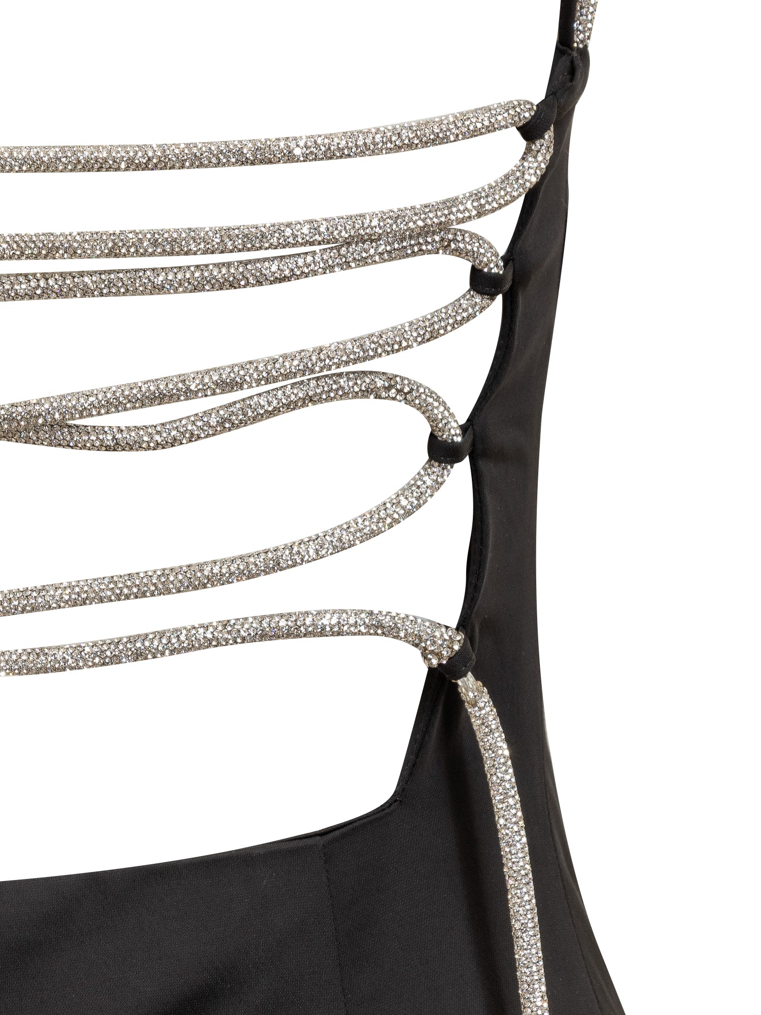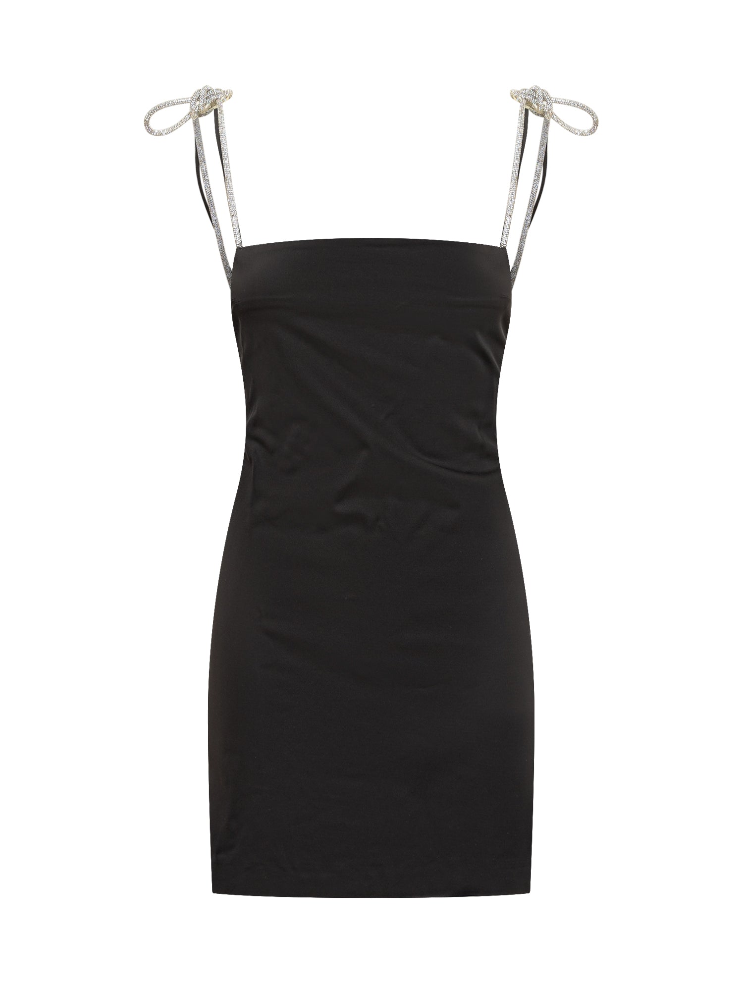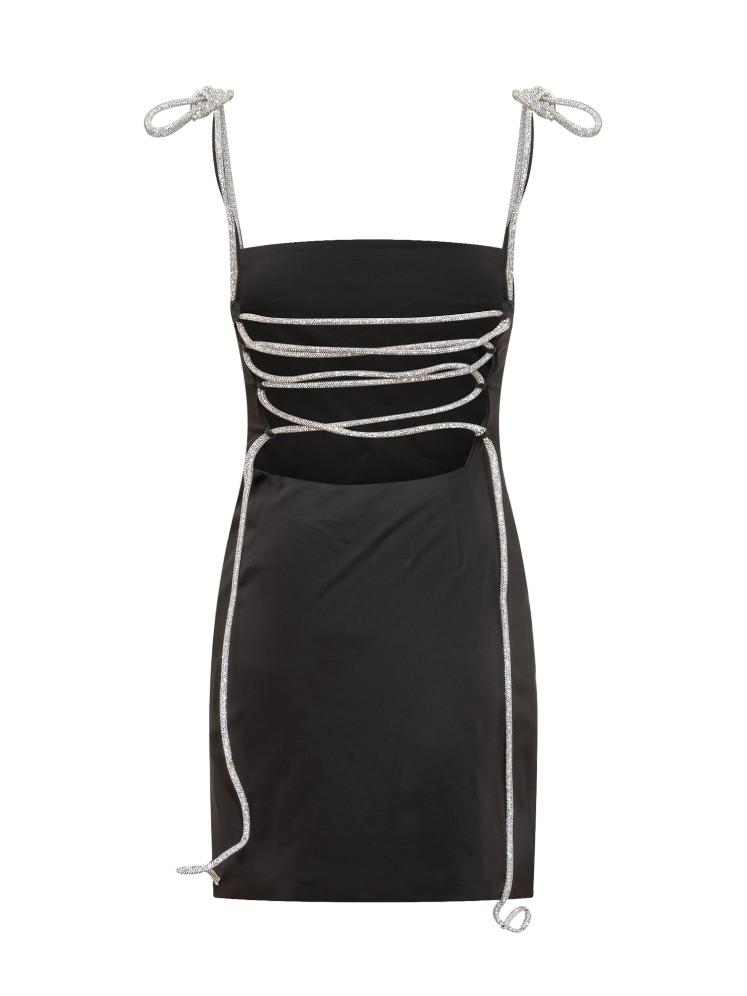 Abito corto smanicato. Modello tubino con vestibilità slim. Chiusura con zip. Dettaglio lacci con strass.