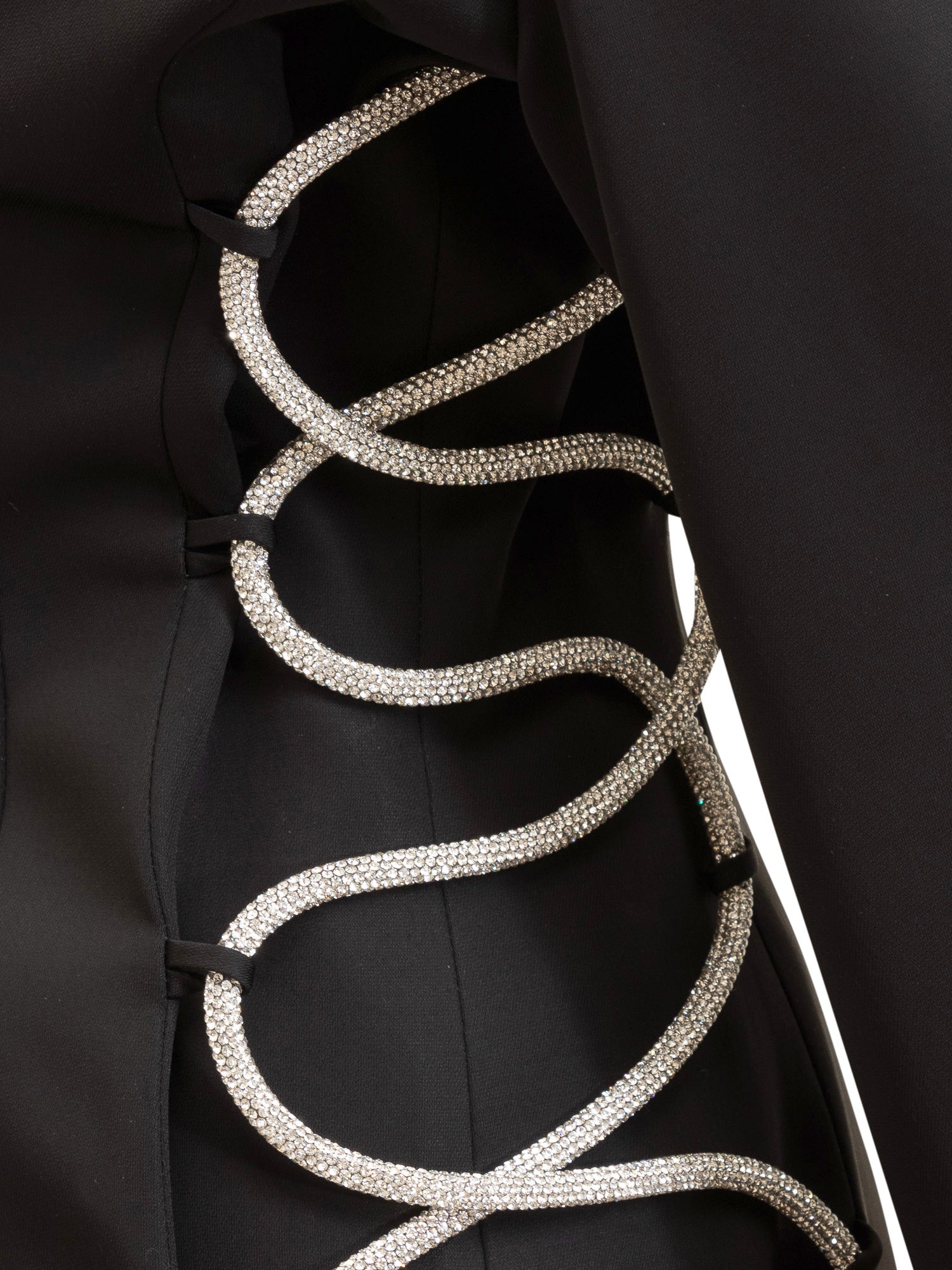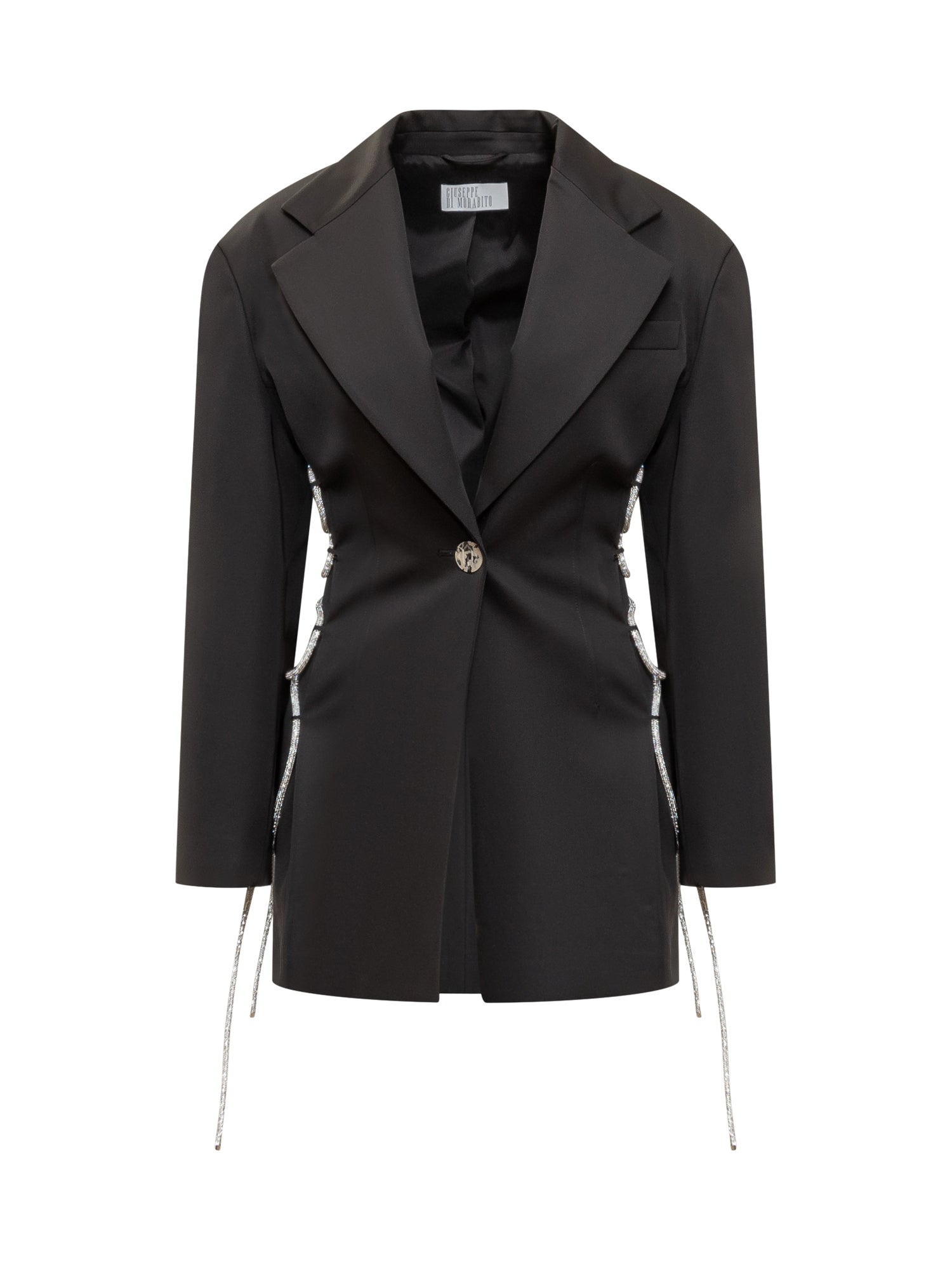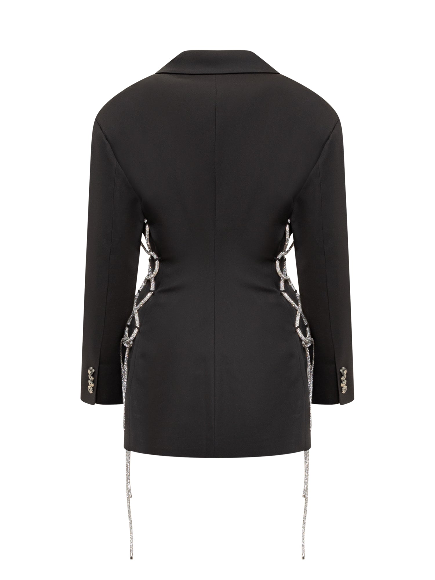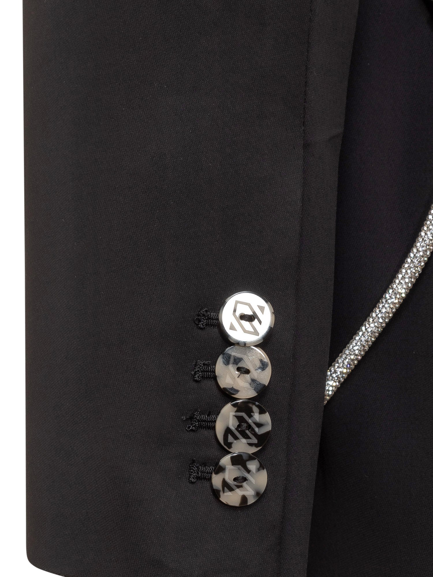 Blazer con scollo classico. Chiusura con bottone. Polsi con bottoni logati. Blazer regolabile lateralmente con laccetti. Laccetti ricoperti da strass.