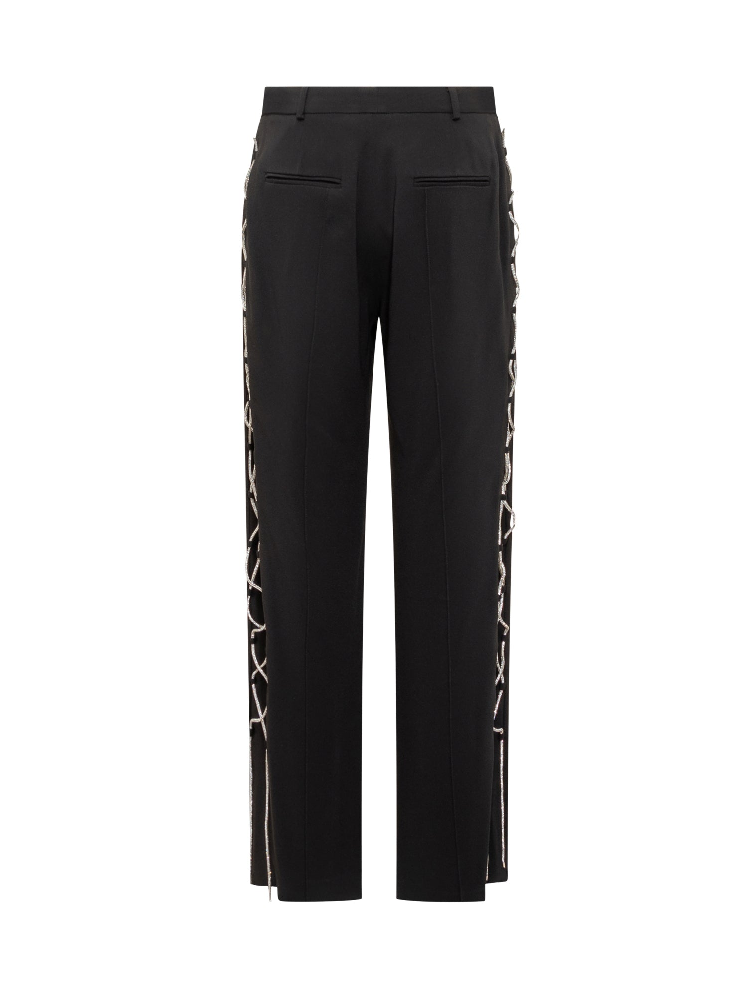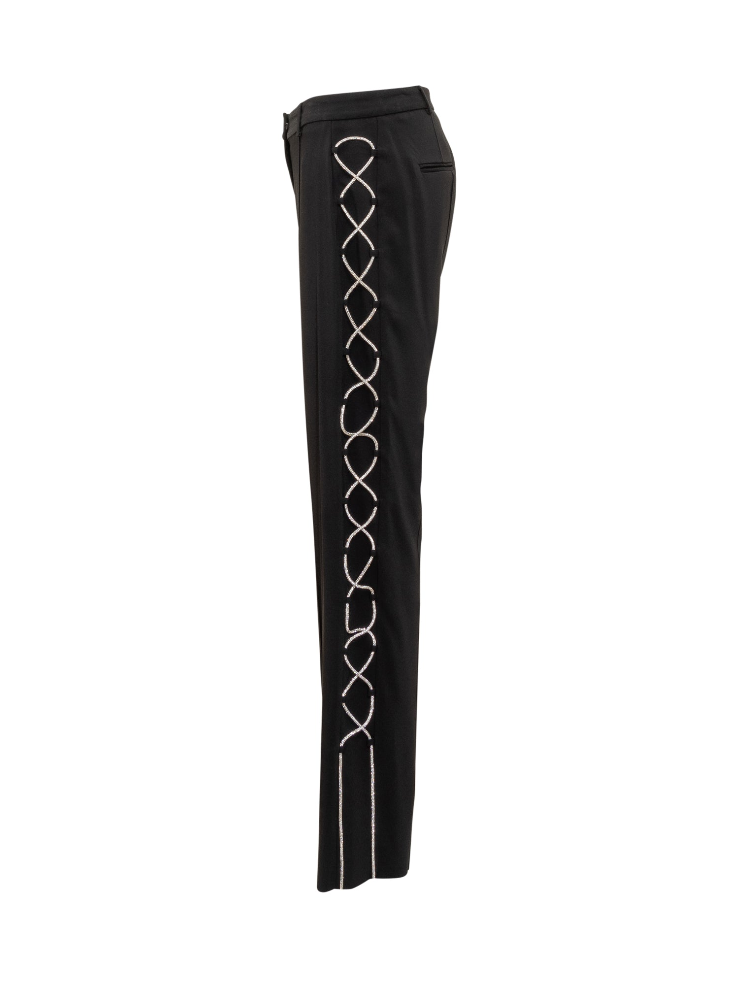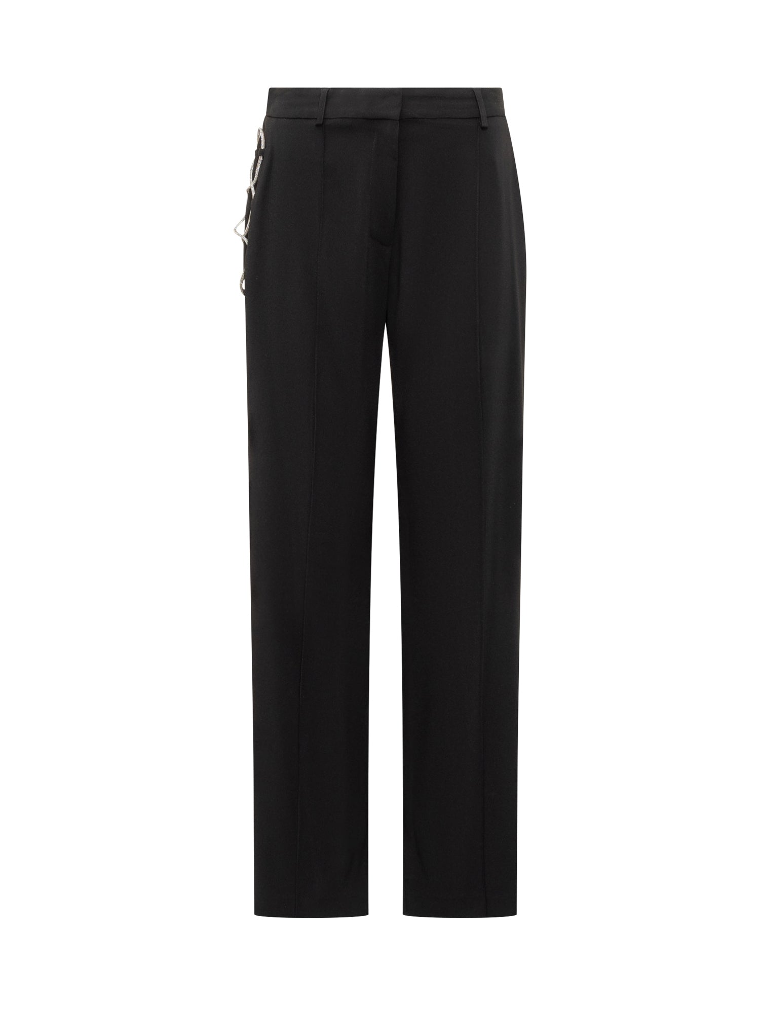 Chiusura con bottone, gancio e zip. Passanti per cintura. Tasche laterali. Tasche sul retro. Spacchi sul fondo. Colore nero. Applicazioni sui lati..