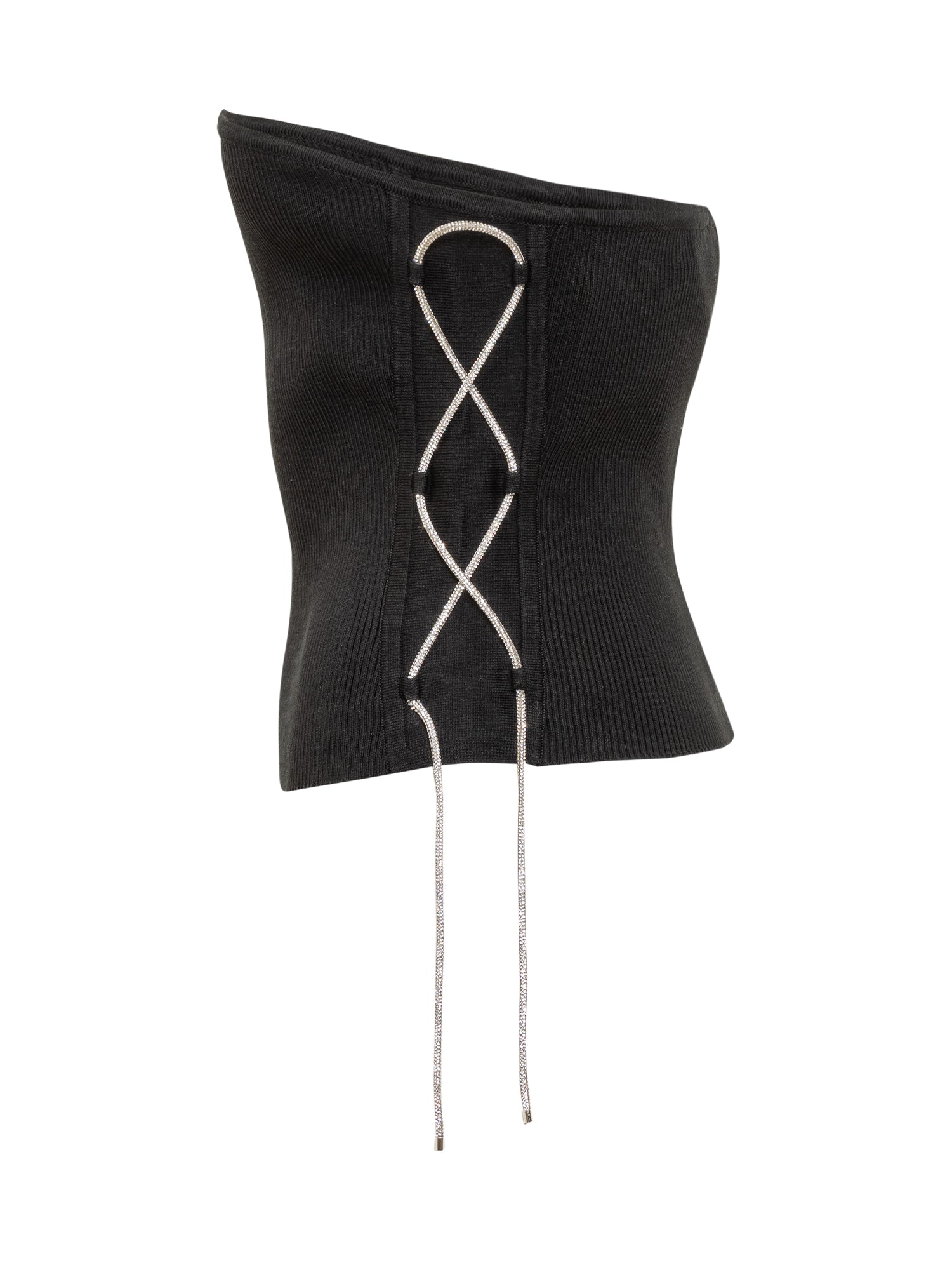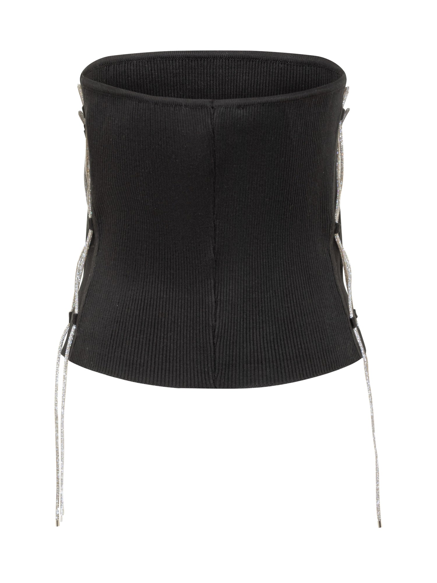Top nero. Vestibilità aderente. Lavorazione a costine. Dettaglio cordini regolabili in strass laterali.