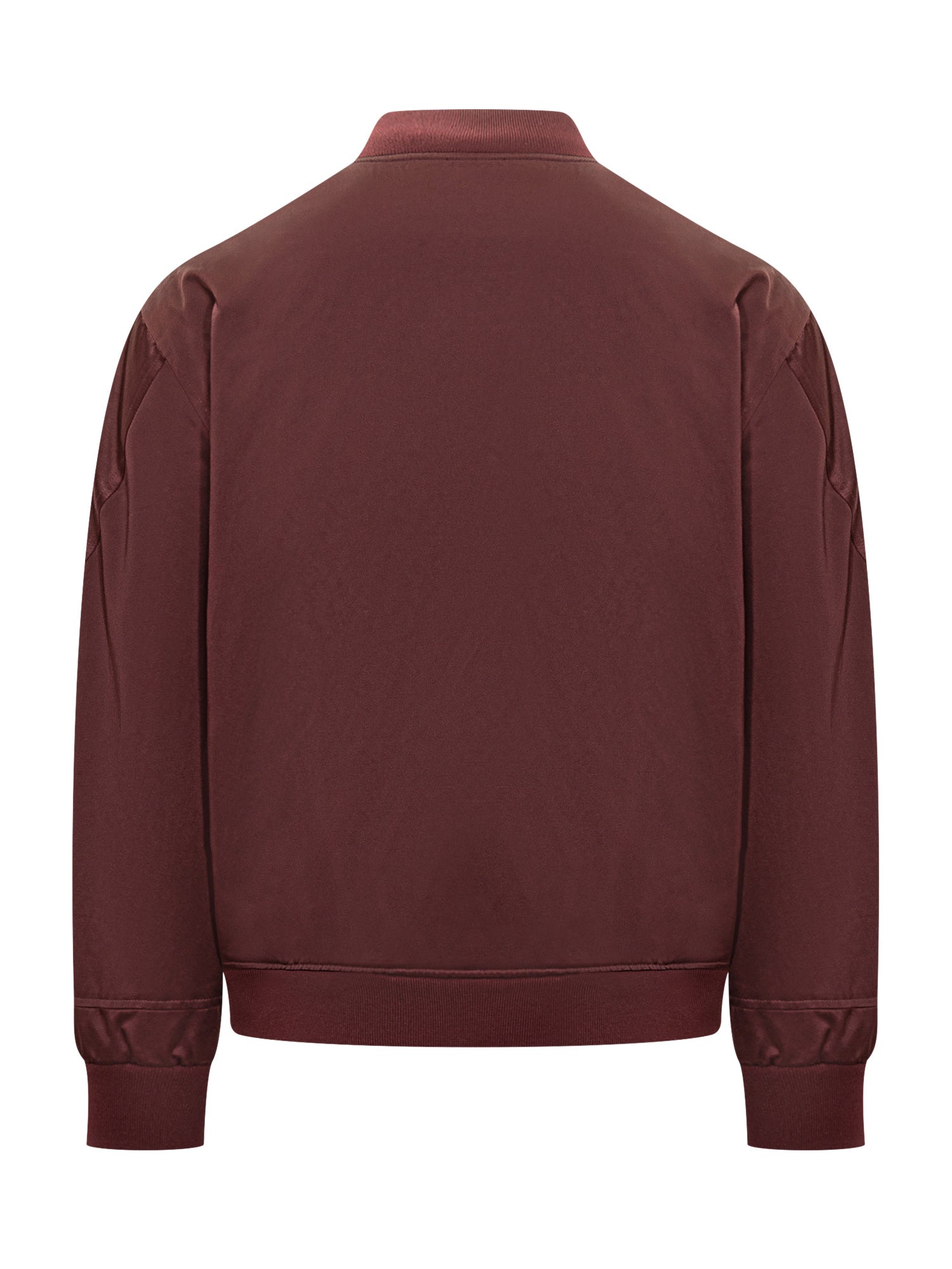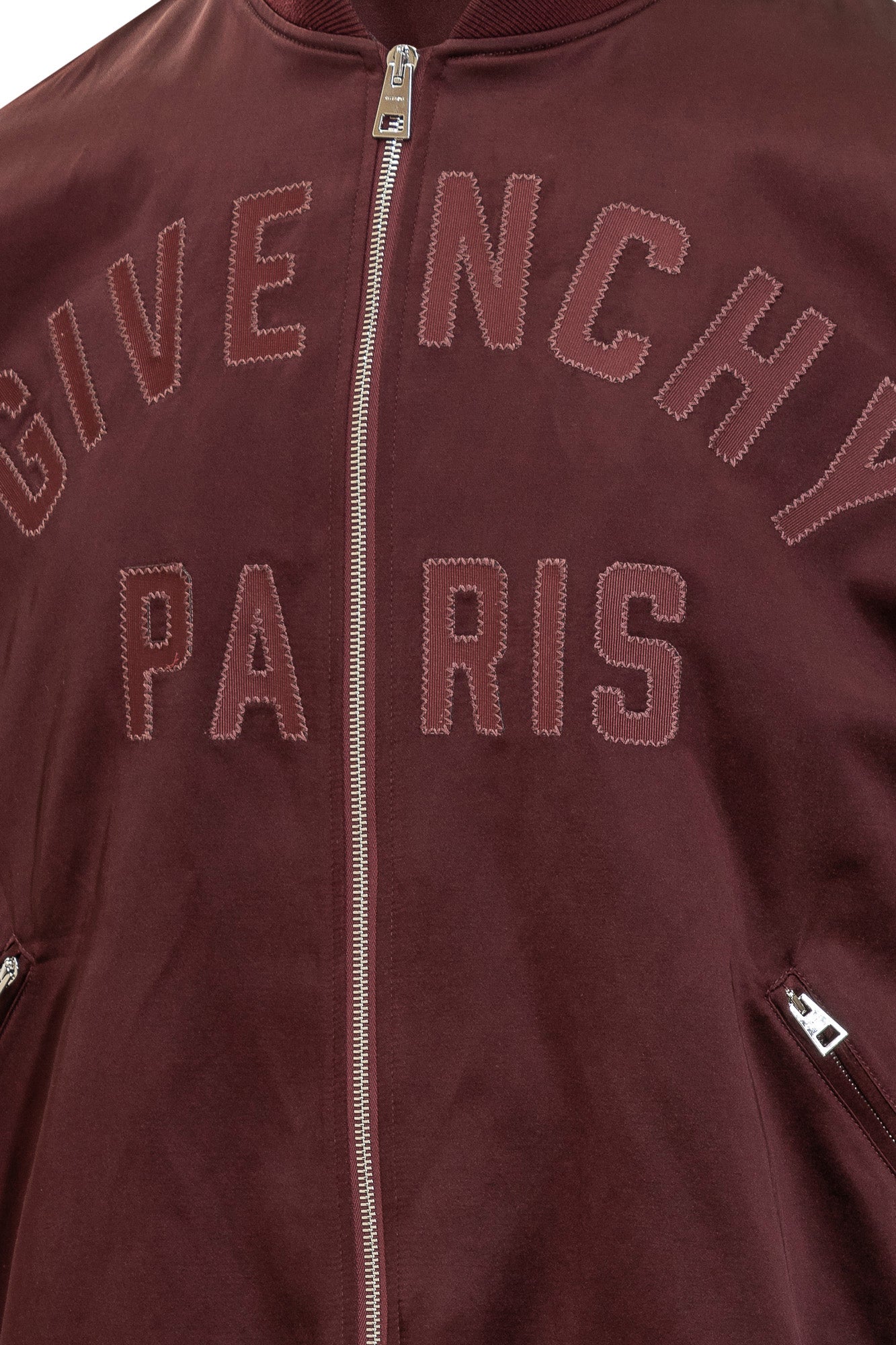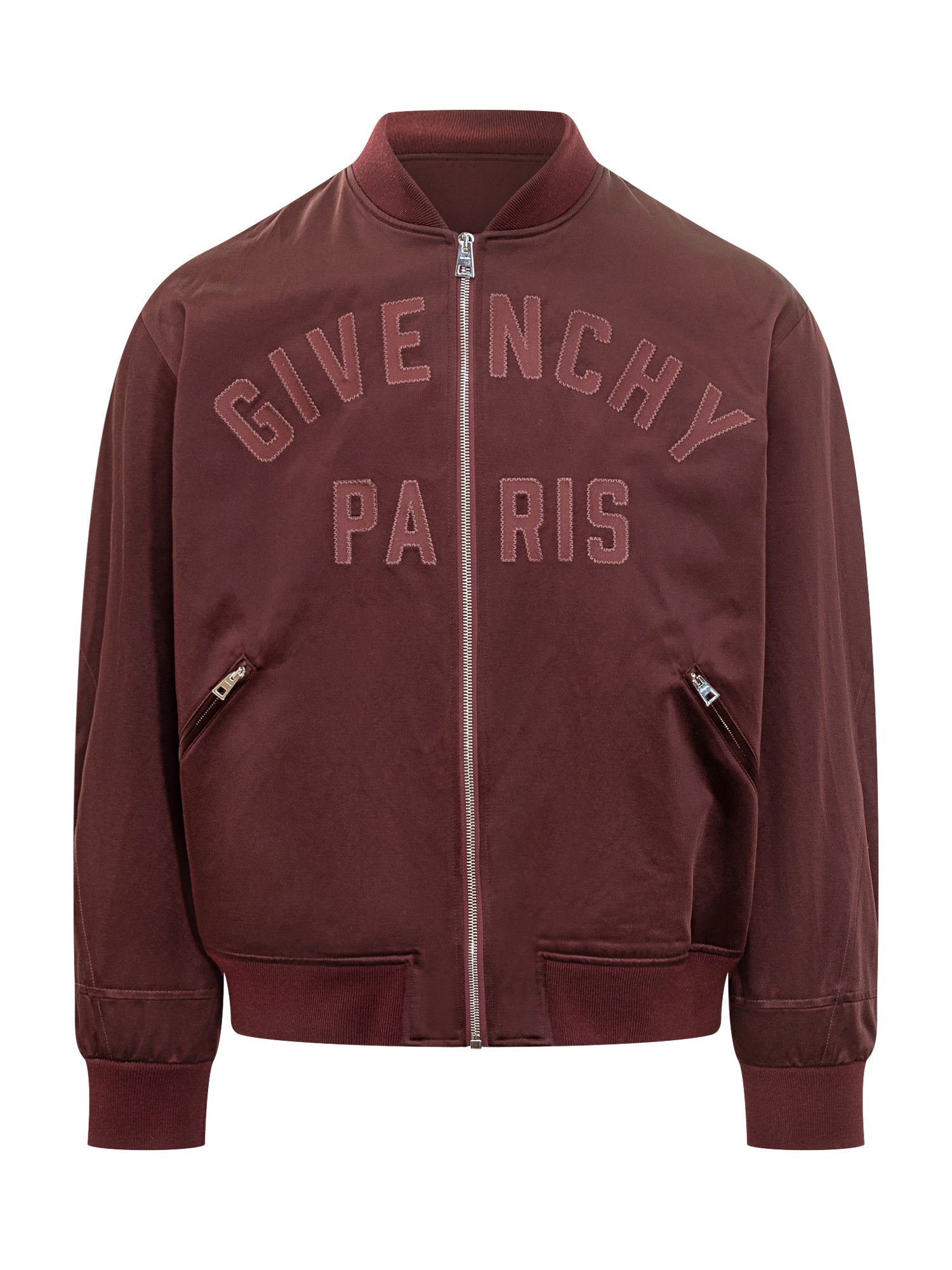 Bomber Givenchy in raso bordeaux con zip frontale e logo "Givenchy Paris" ricamato tono su tono.