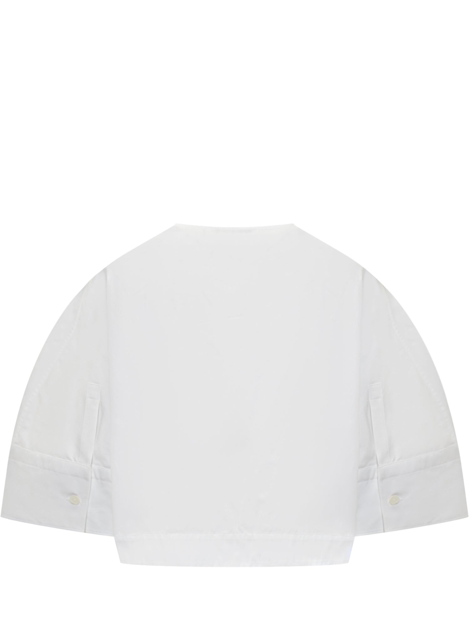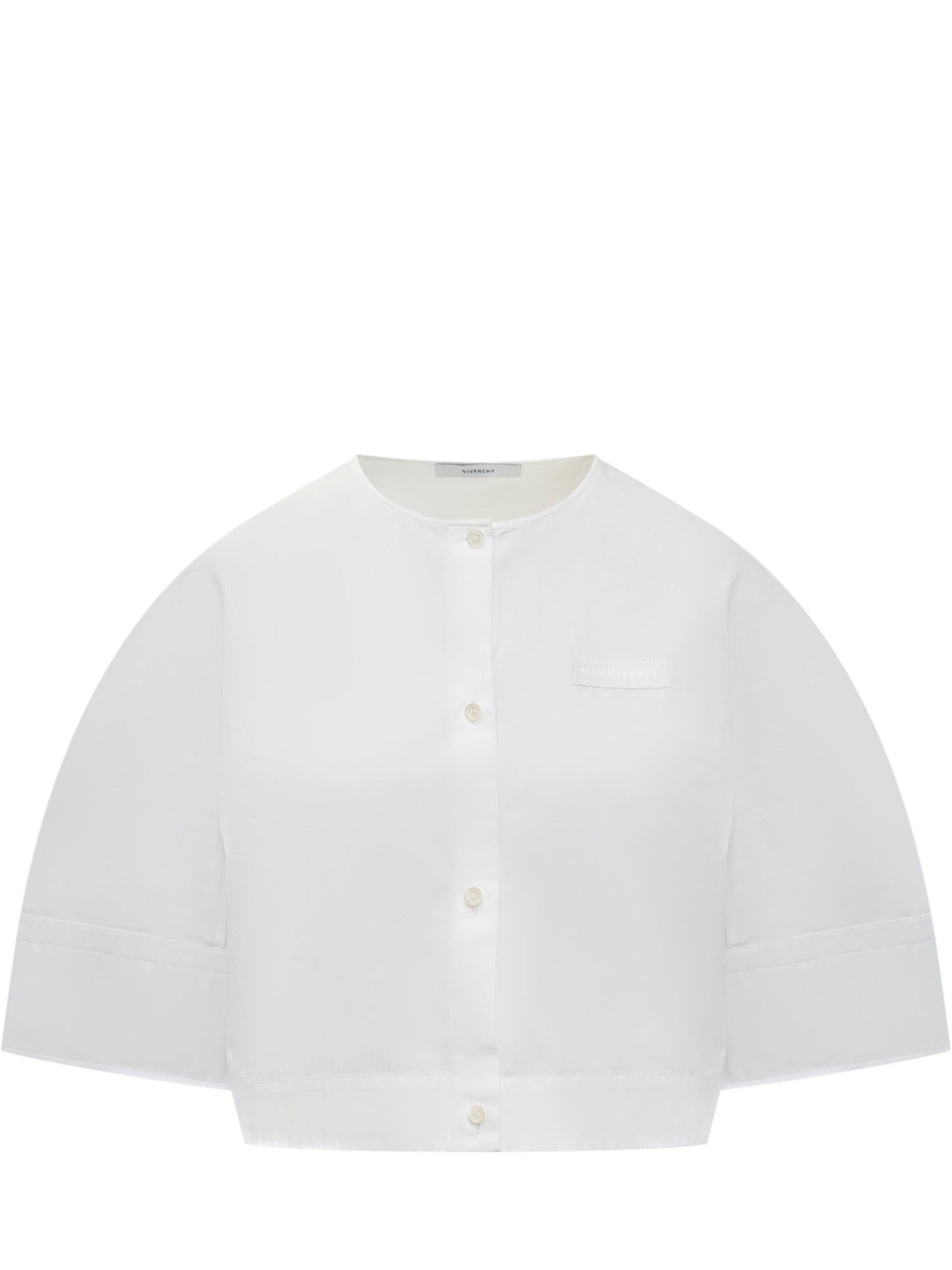 Camicia cropped bianca Givenchy in popeline di cotone, con maniche ampie e girocollo. Logo ton sur ton ricamato sul petto.
