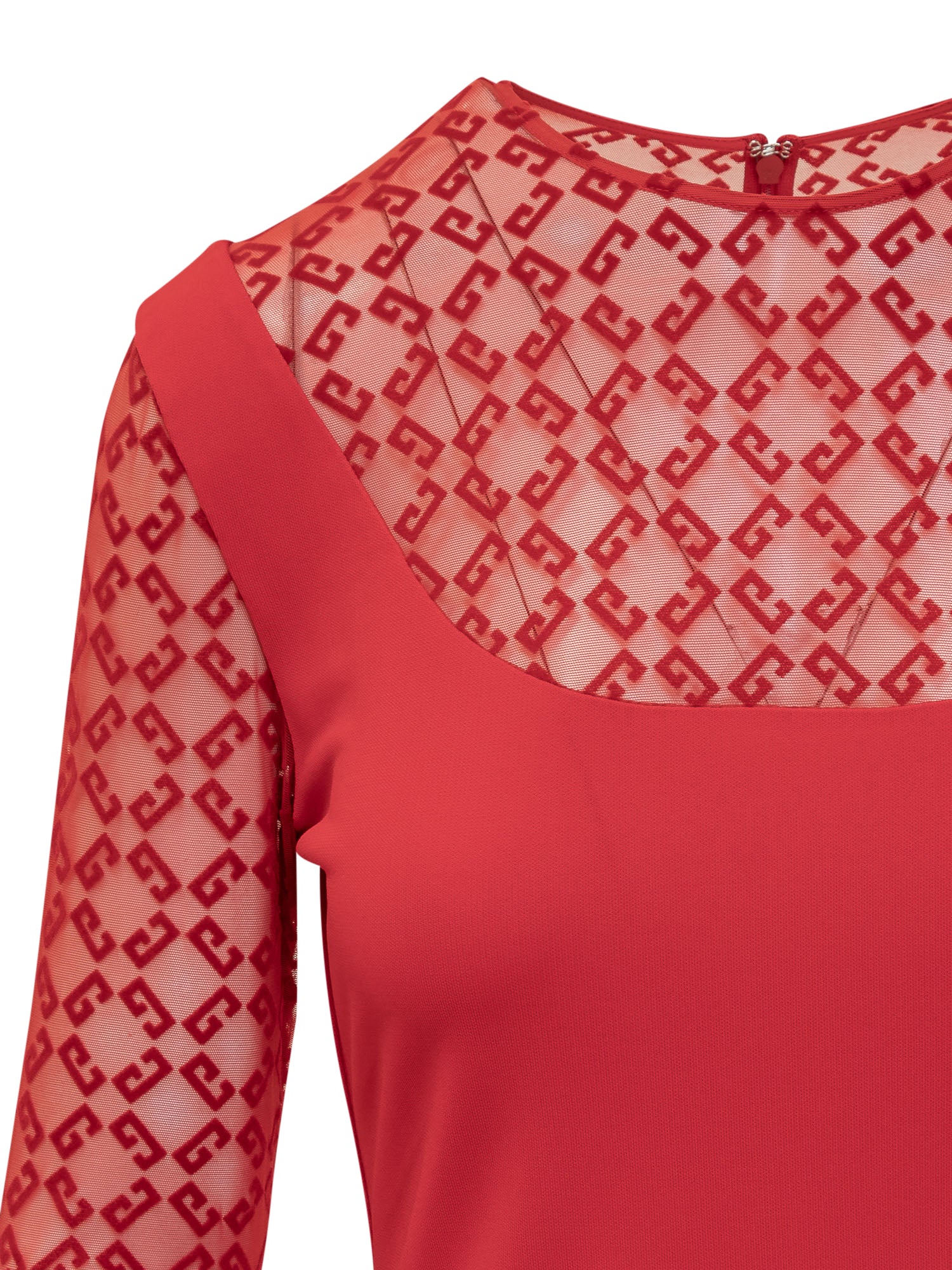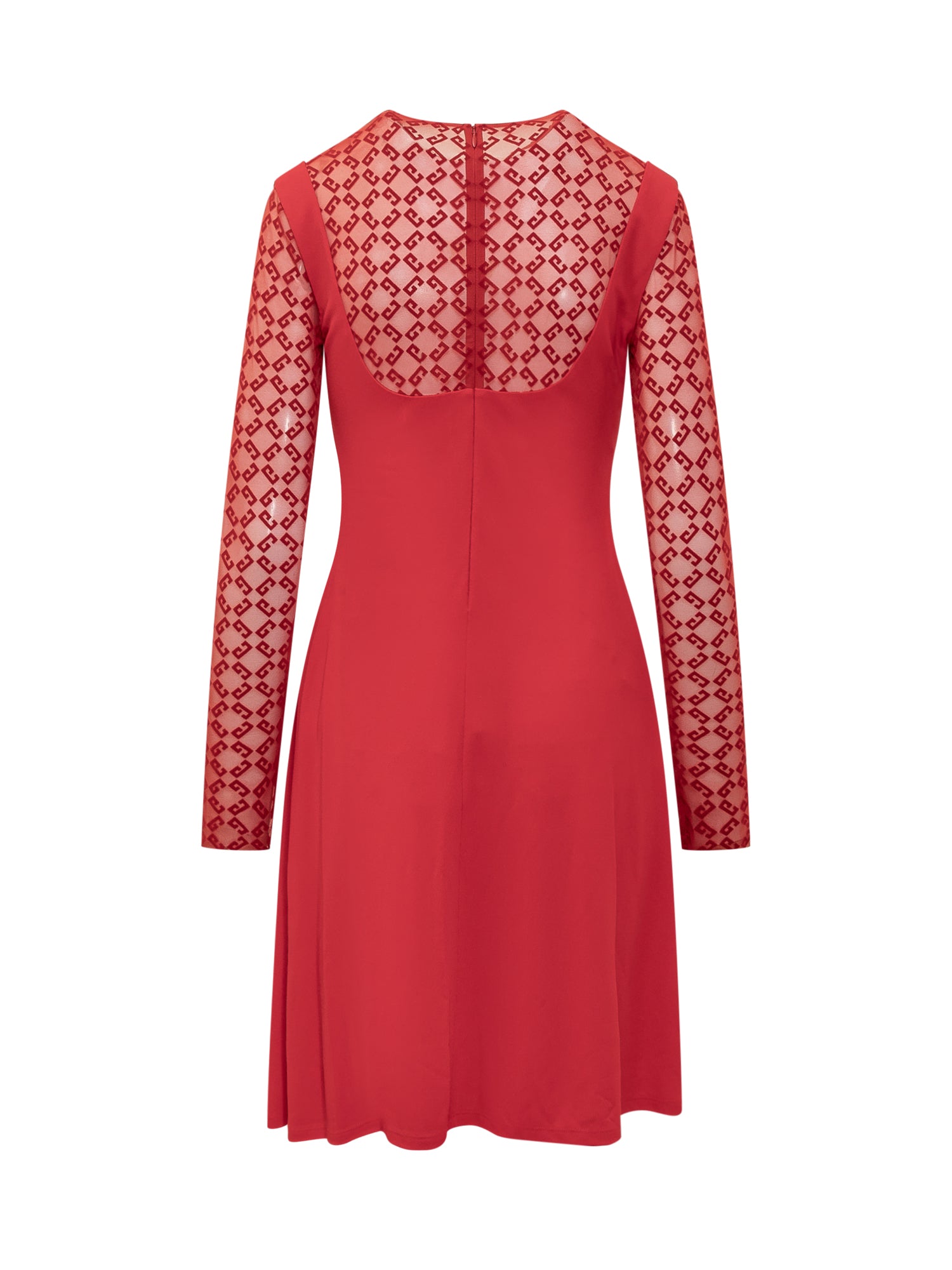 Abito corto a maniche lunghe in jersey e tulle. Girocollo. Chiusura con zip invisibile sul retro. Tulle con motivo Monogram 72 in velluto floccato.