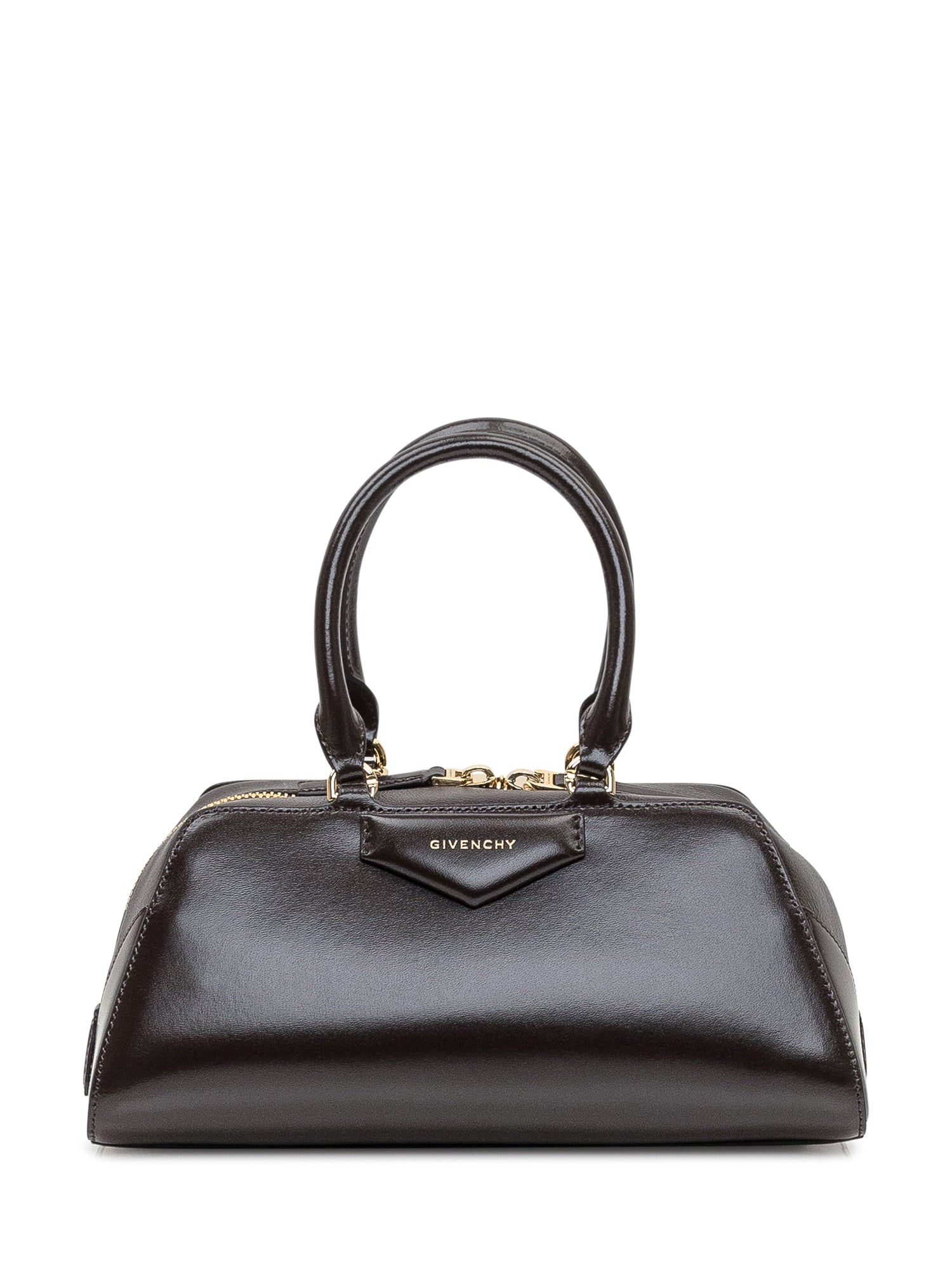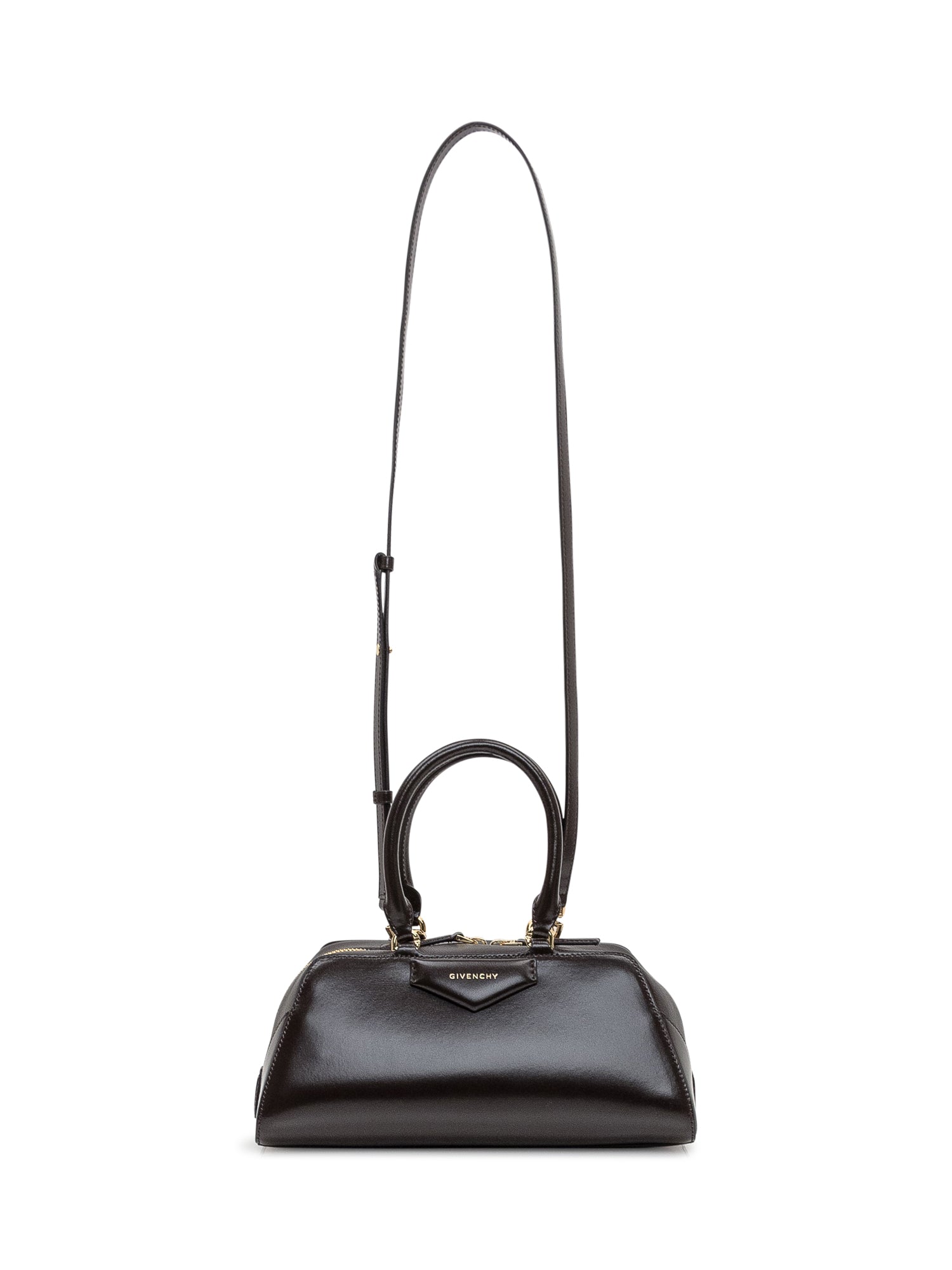 Iconica borsa da donna in pelle liscia firmata Givenchy. Manici rigidi e tracolla regolabile. Elegante, strutturata e versatile. Logo Givenchy dorato. Made in Italy.
