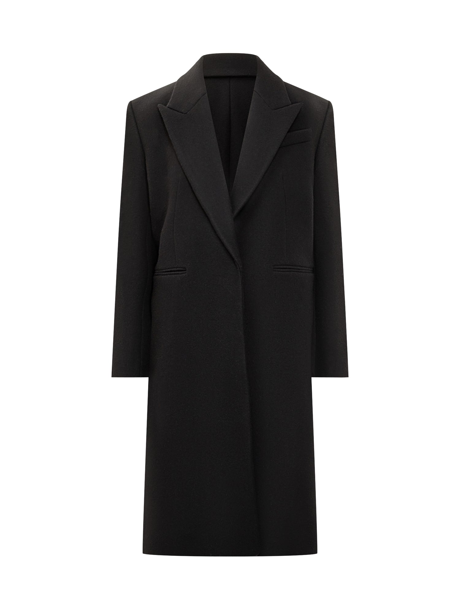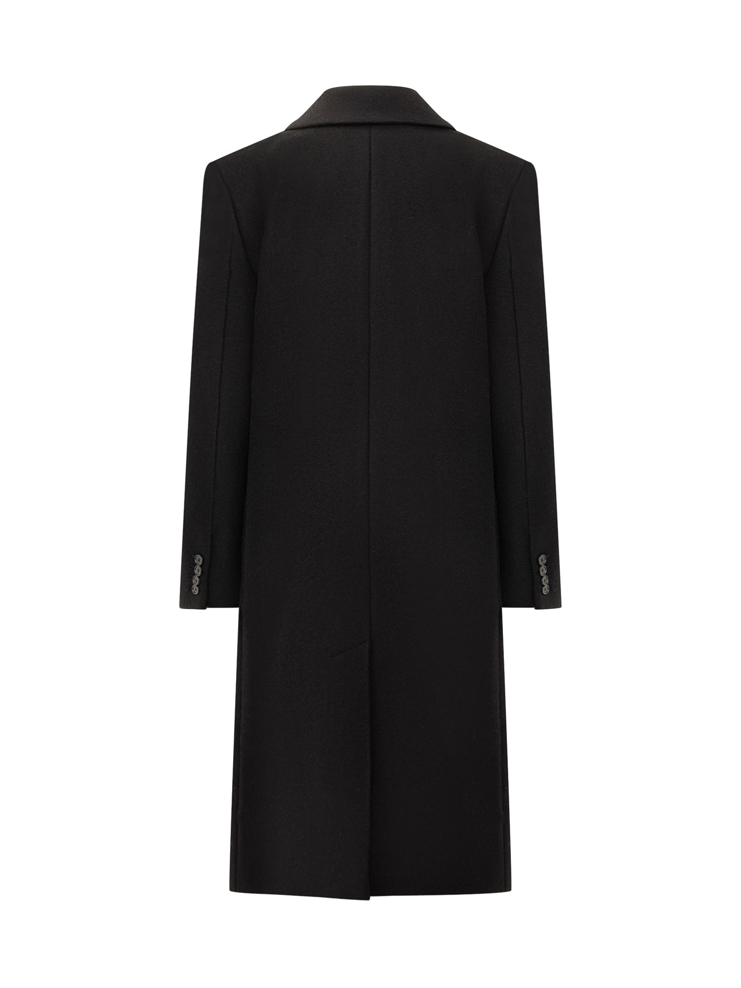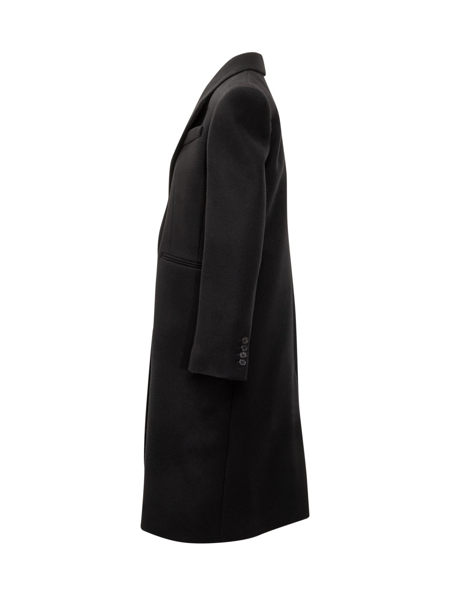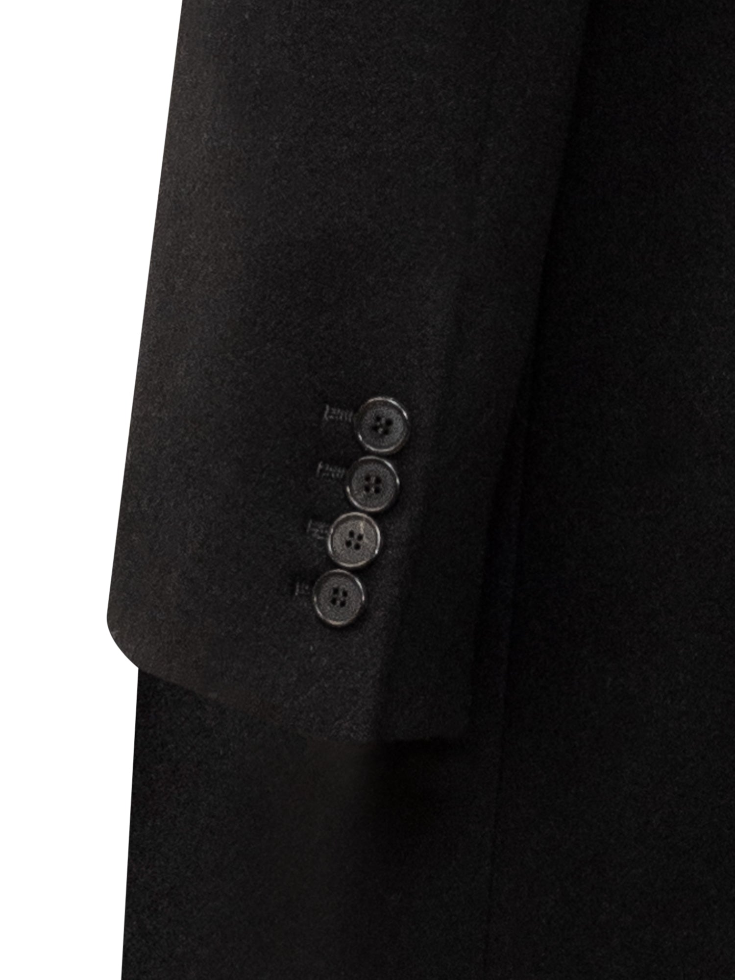 Cappotto nero lungo Givenchy con revers classico e taglio sartoriale. Presenta una chiusura con bottoni discreta e pratiche tasche interne.