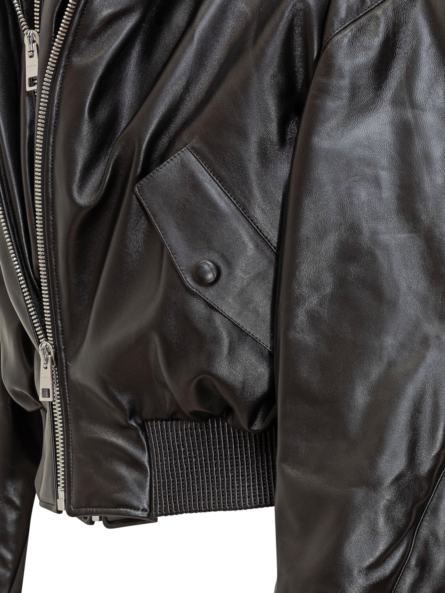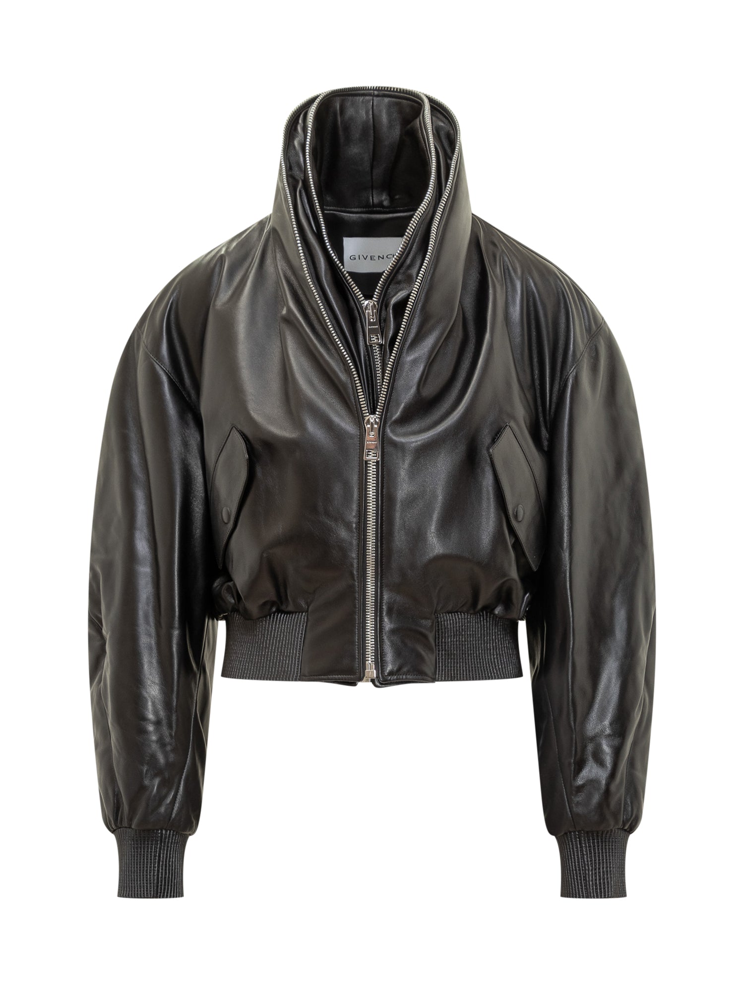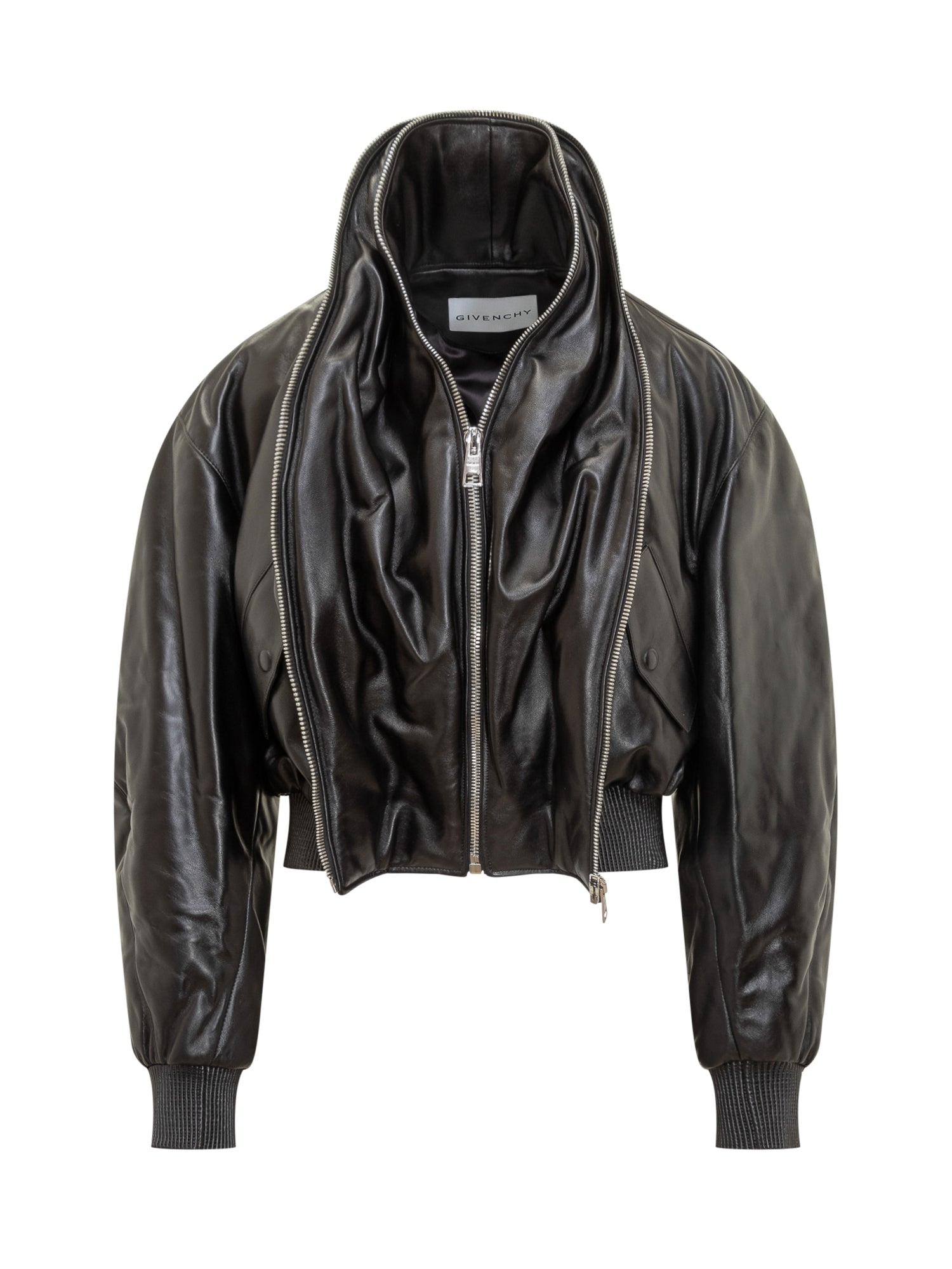 Giacca bomber Givenchy in pelle nera con zip frontale, colletto alto e polsini a costine. Un capo iconico e sofisticato che unisce lusso e stile urbano.