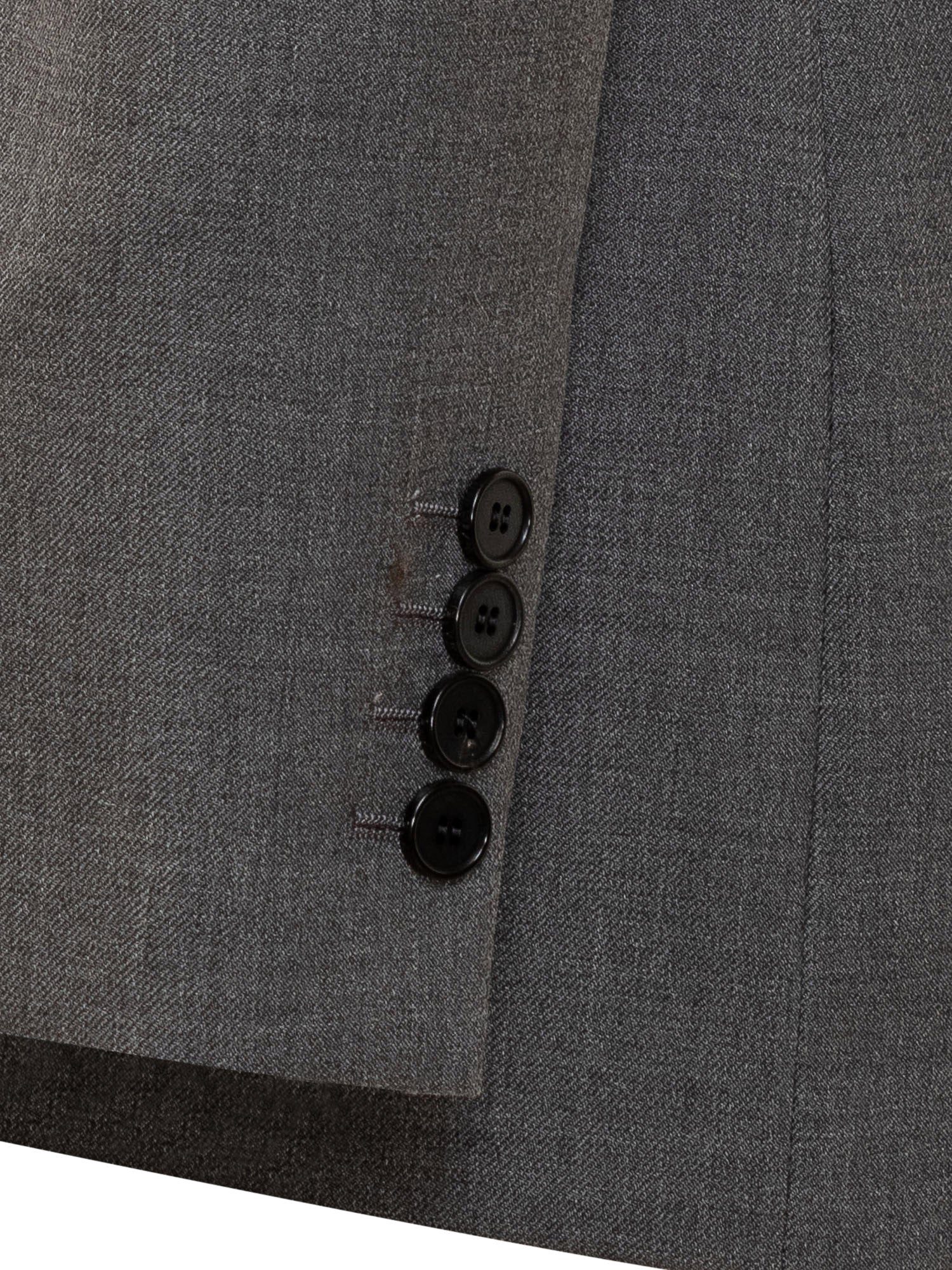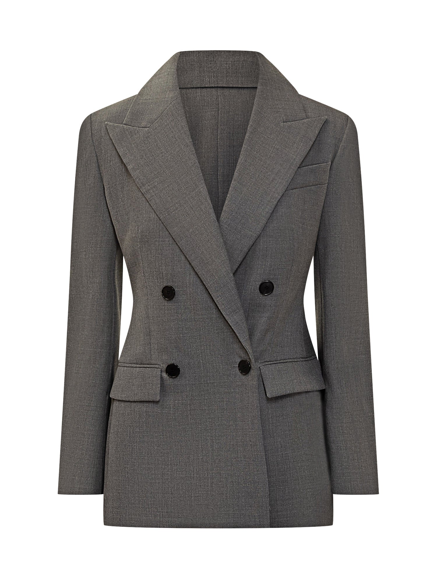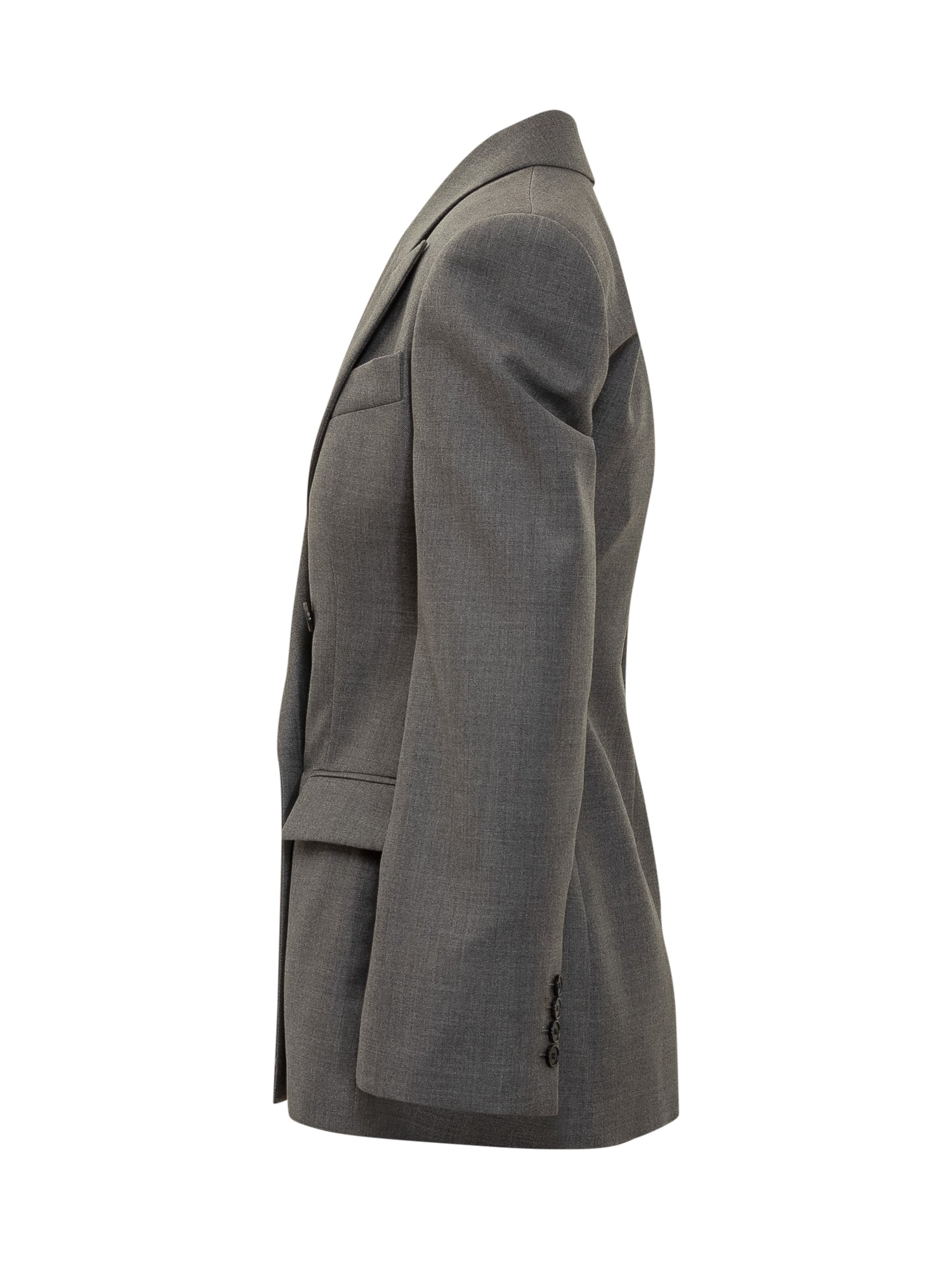 Giacca doppiopetto grigia firmata Givenchy, realizzata in lana di alta qualità. Caratterizzata da revers a lancia, chiusura a sei bottoni e tasche con patta.