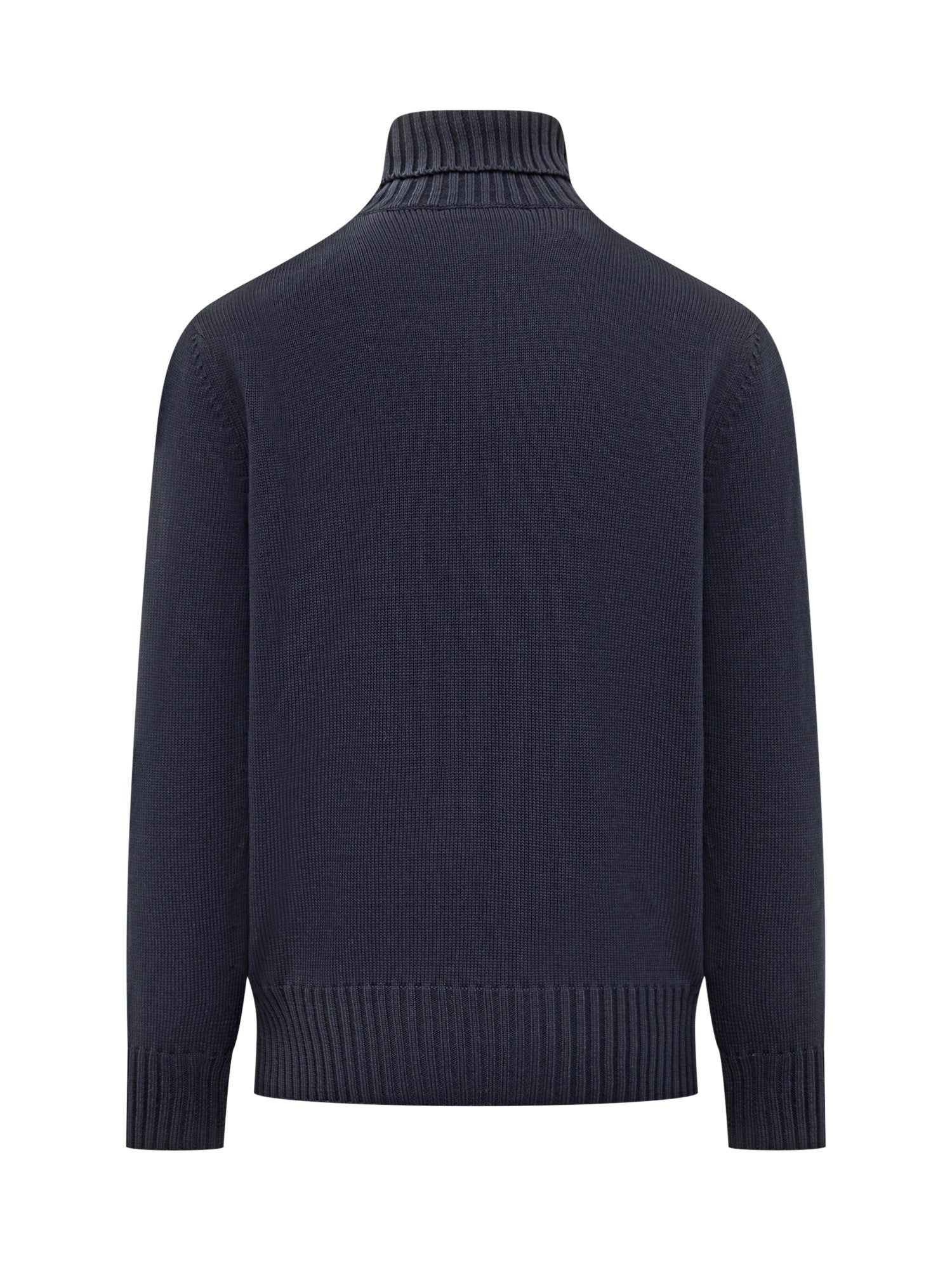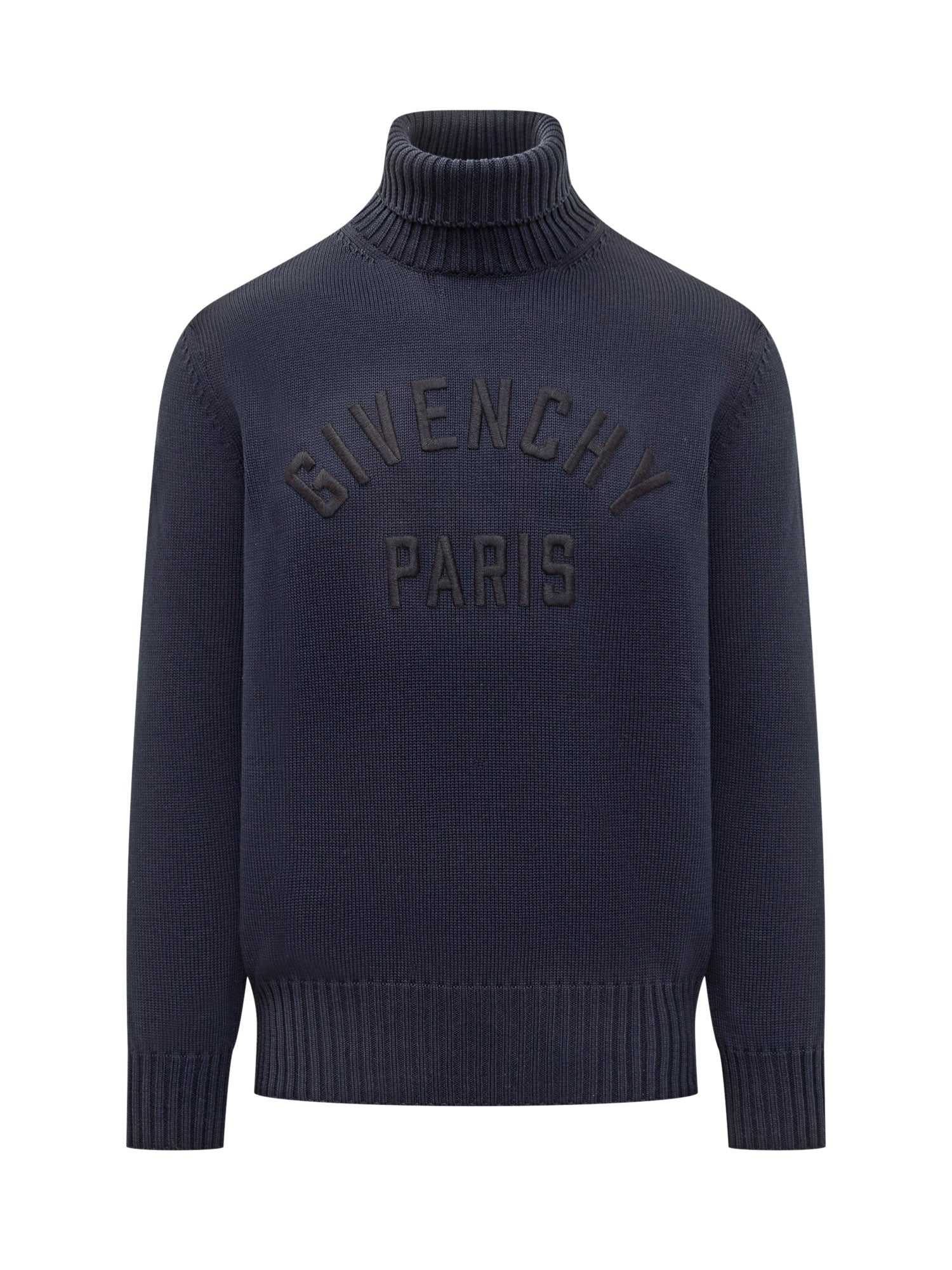 Maglione Givenchy in lana blu con collo alto e lavorazione a coste. Logo Givenchy Paris in rilievo sul davanti.