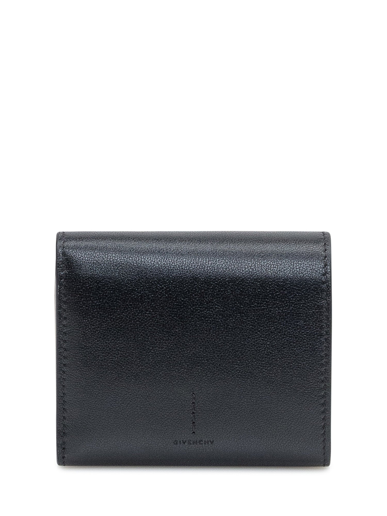 Portafoglio Givenchy in pelle nera con chiusura a bottone e logo dorato.