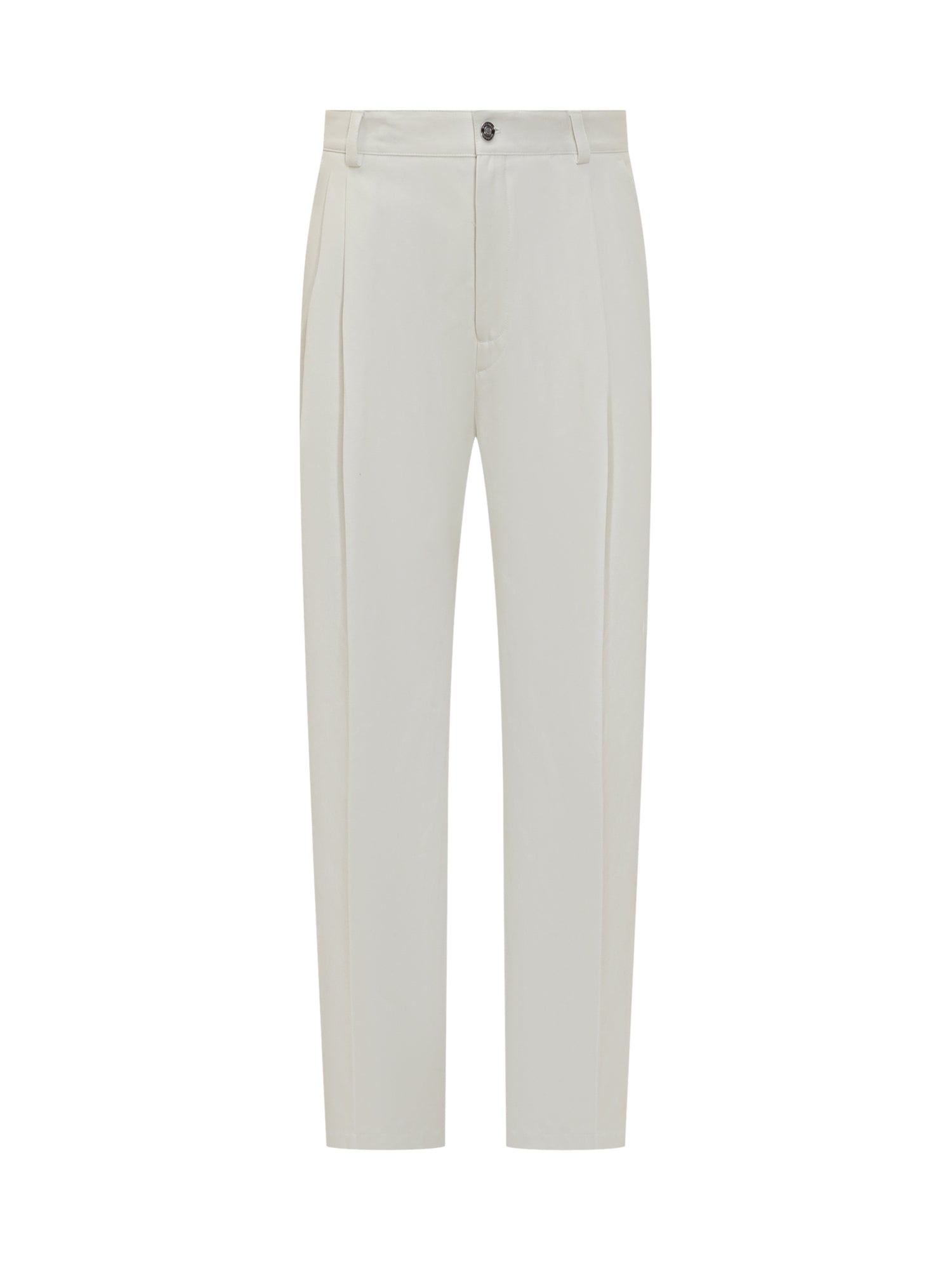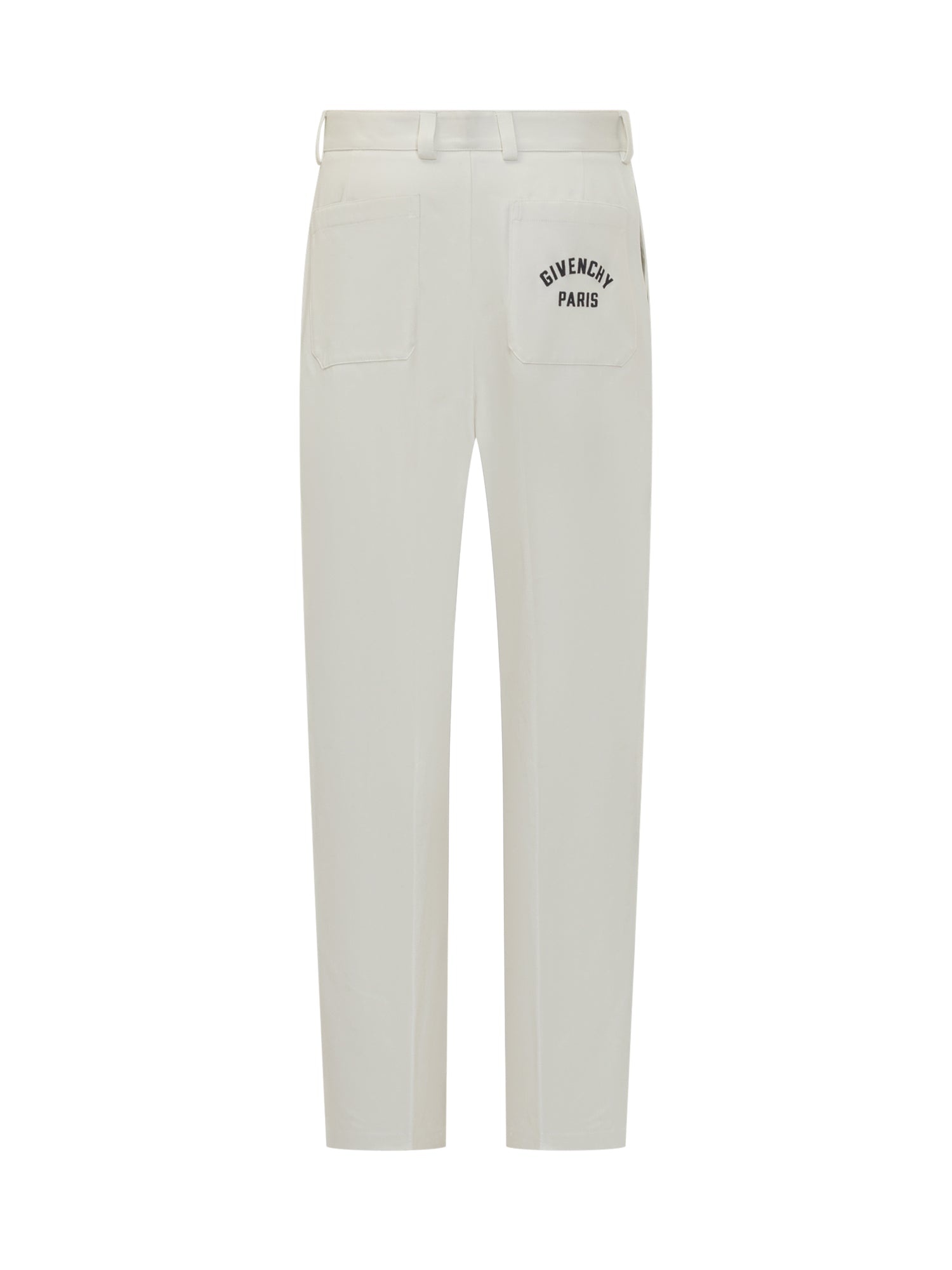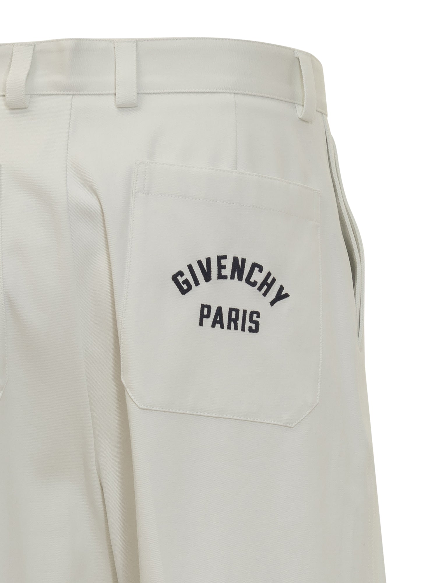 Pantaloni Givenchy in cotone bianco avorio, taglio dritto con piega frontale. Chiusura con bottone e zip, passanti per cintura.