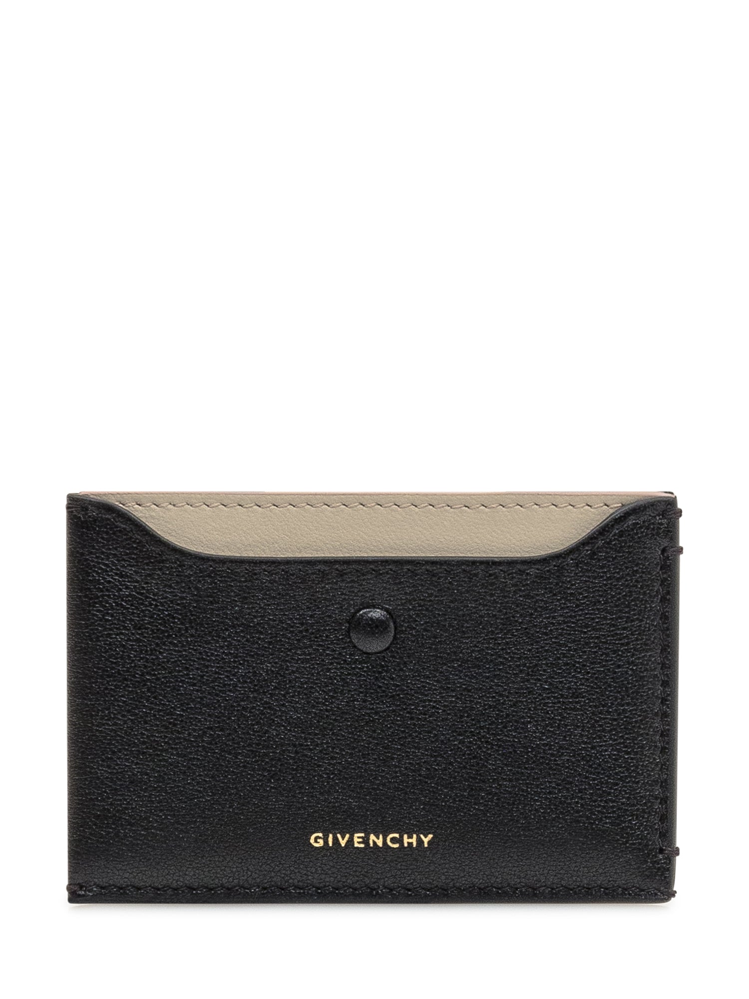 Porta carte Givenchy in pelle bicolore nero e beige, design compatto ed elegante con logo dorato.