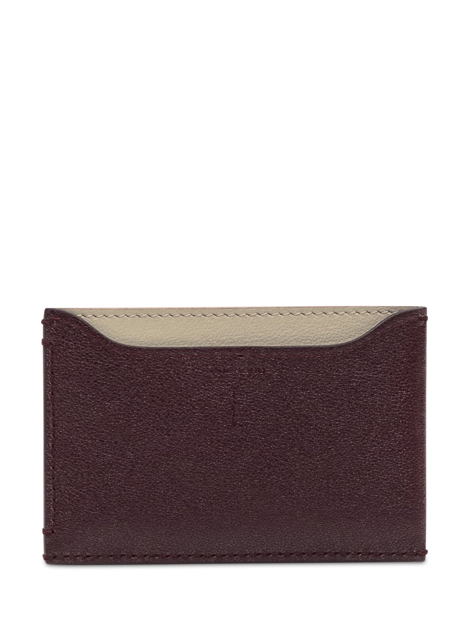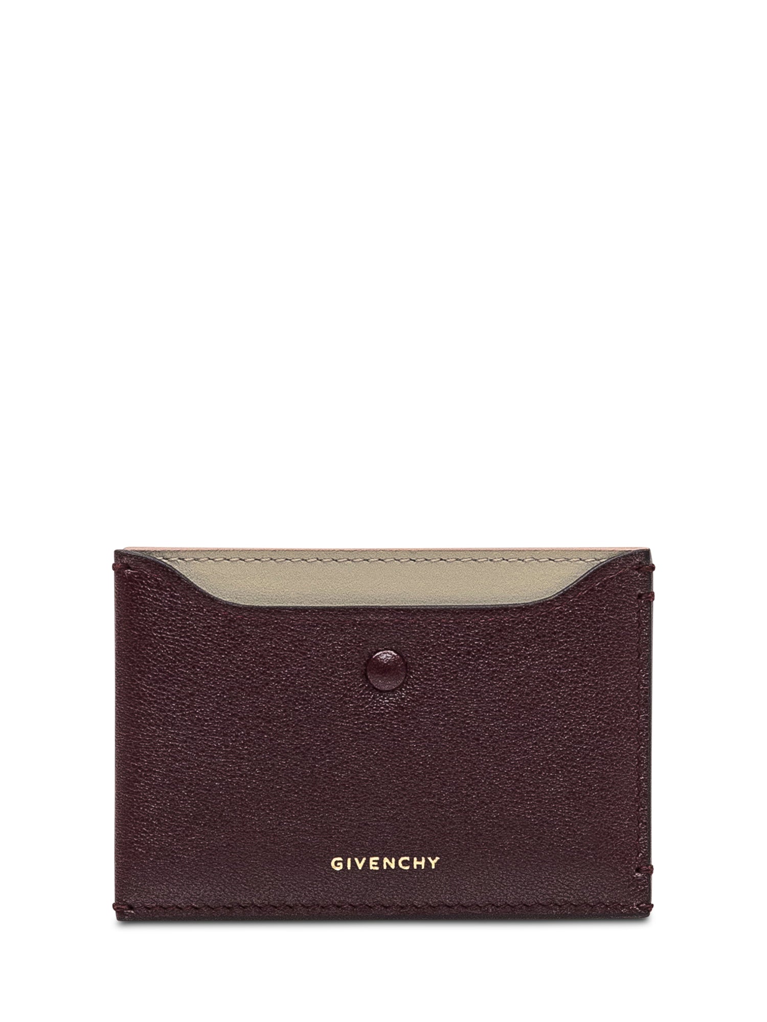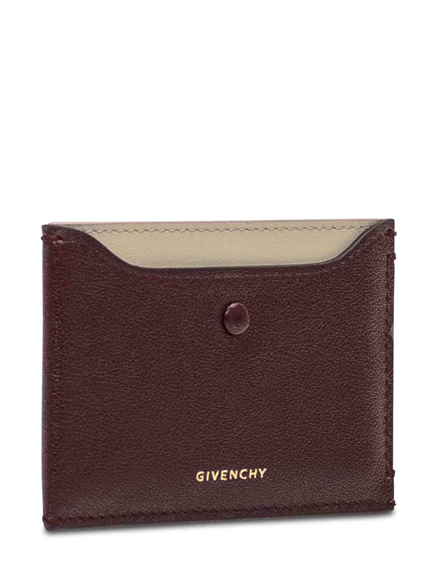 Elegante porta carte firmato Givenchy realizzato in pelle liscia bordeaux con interno beige a contrasto. Compatto e raffinato, presenta scomparti multipli per carte e dettagli discreti come il logo dorato frontale.