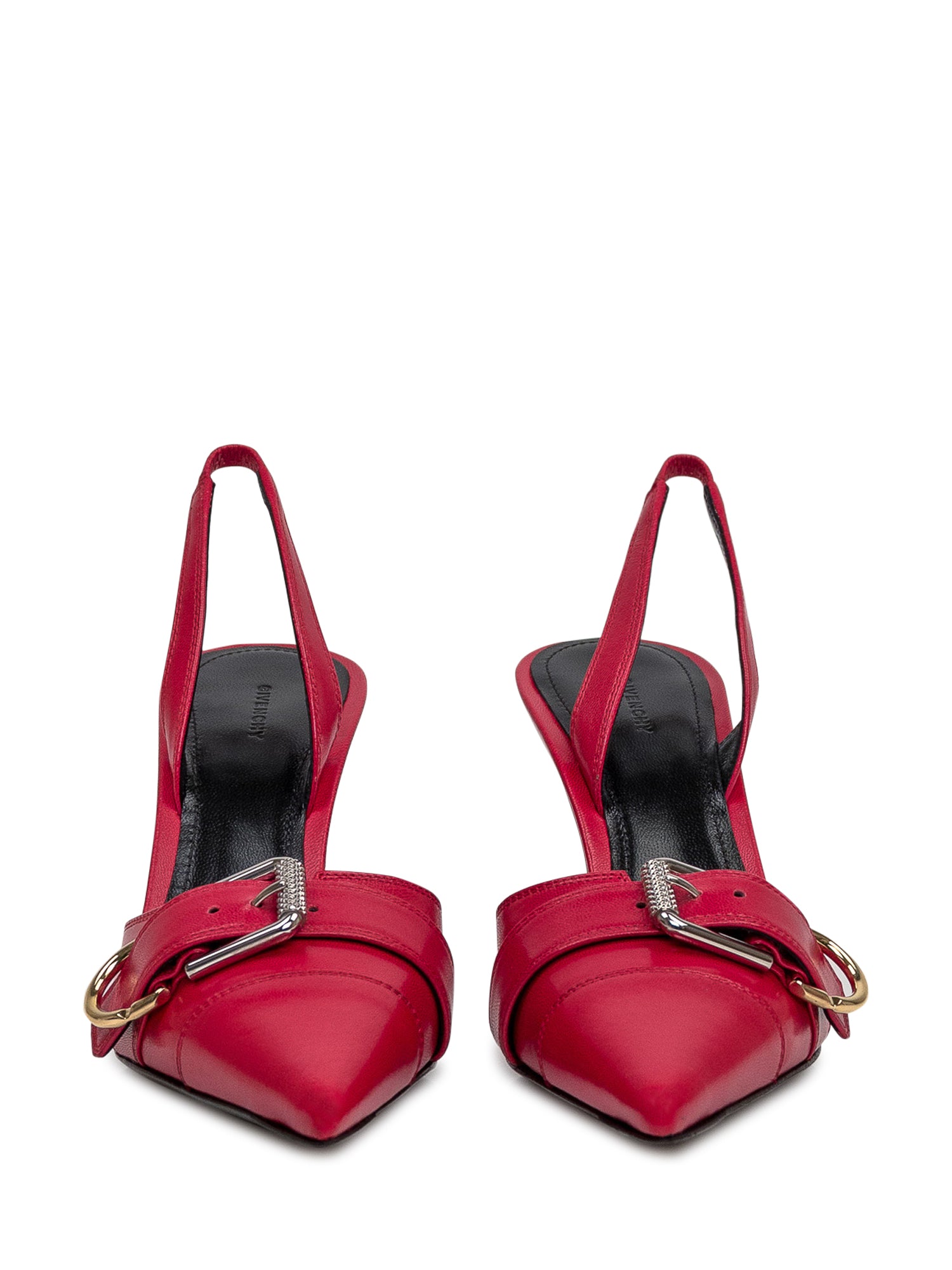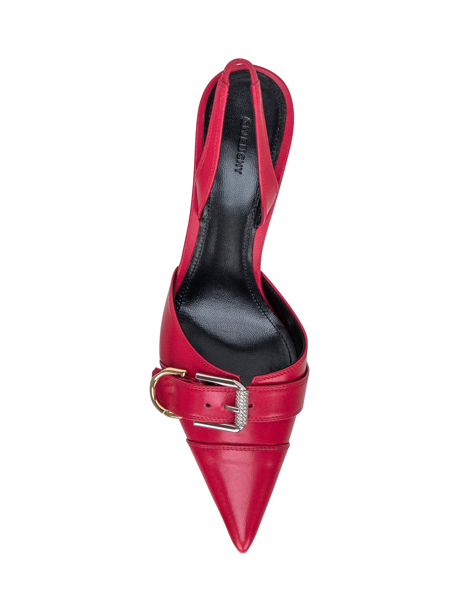Décolleté a punta in pelle rossa. Cinturino con dettaglio fibbia in metallo. Cinturino sottile elasticizzato sul retro. Tacco sottile.