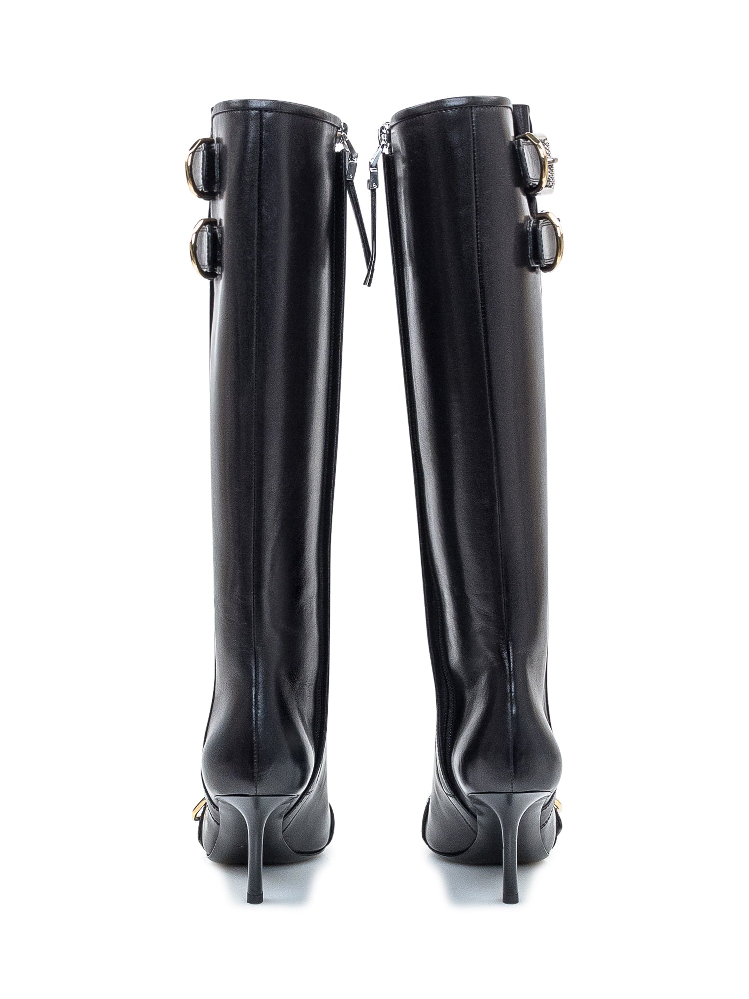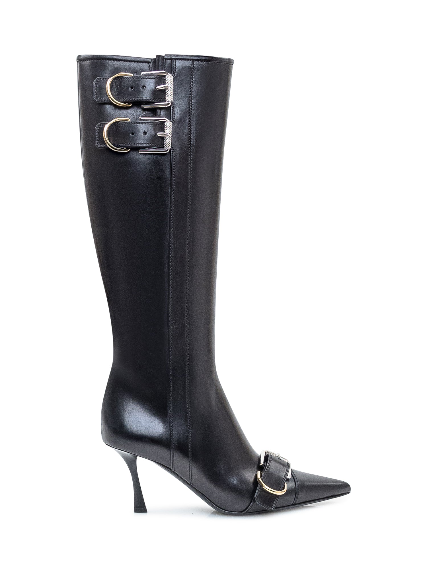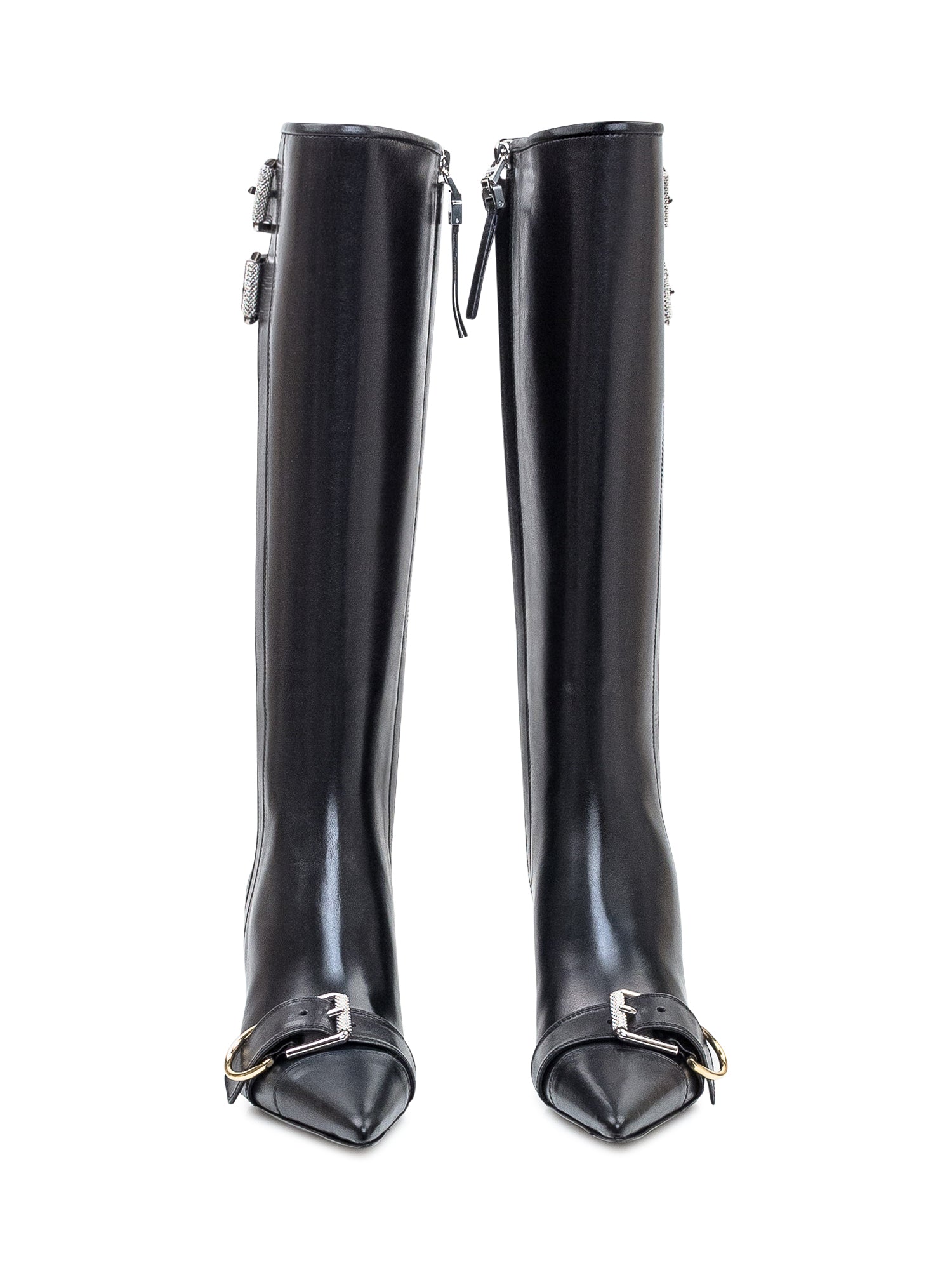 Stivale alto in pelle nera. Design a punta. Tacco a spillo. Fibbie sulla punta e sul lato. Chiusura con zip.